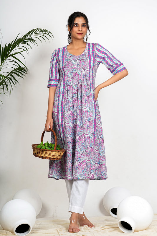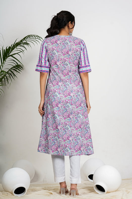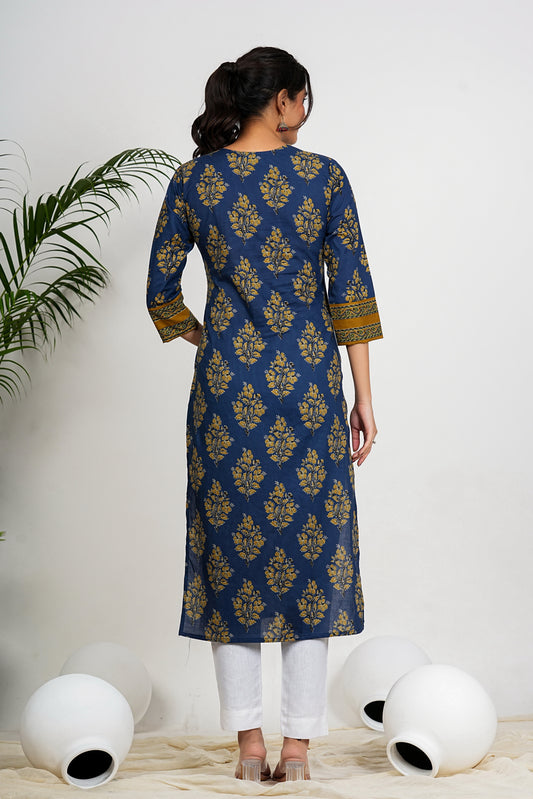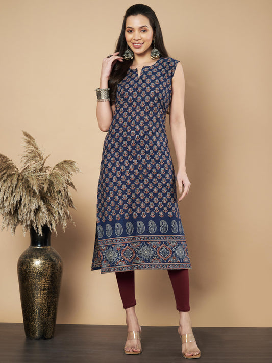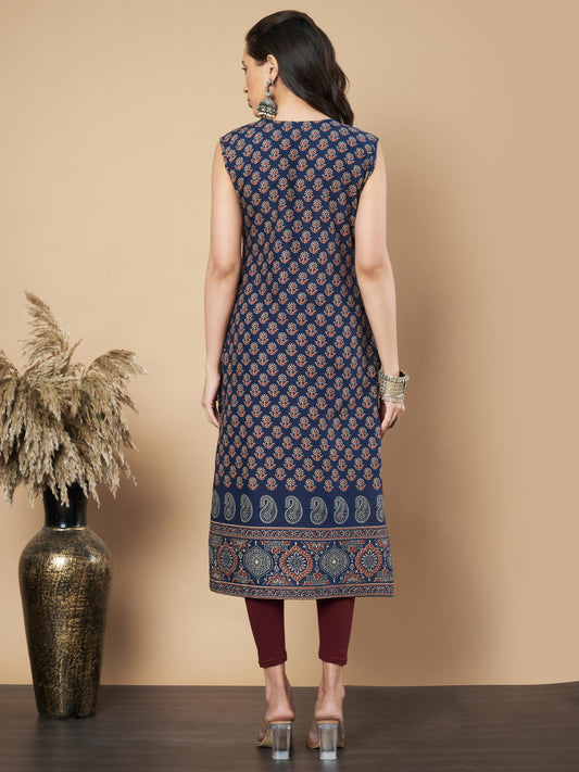 Peacock Blue Solid A-Line Cotton Slub Kurta
