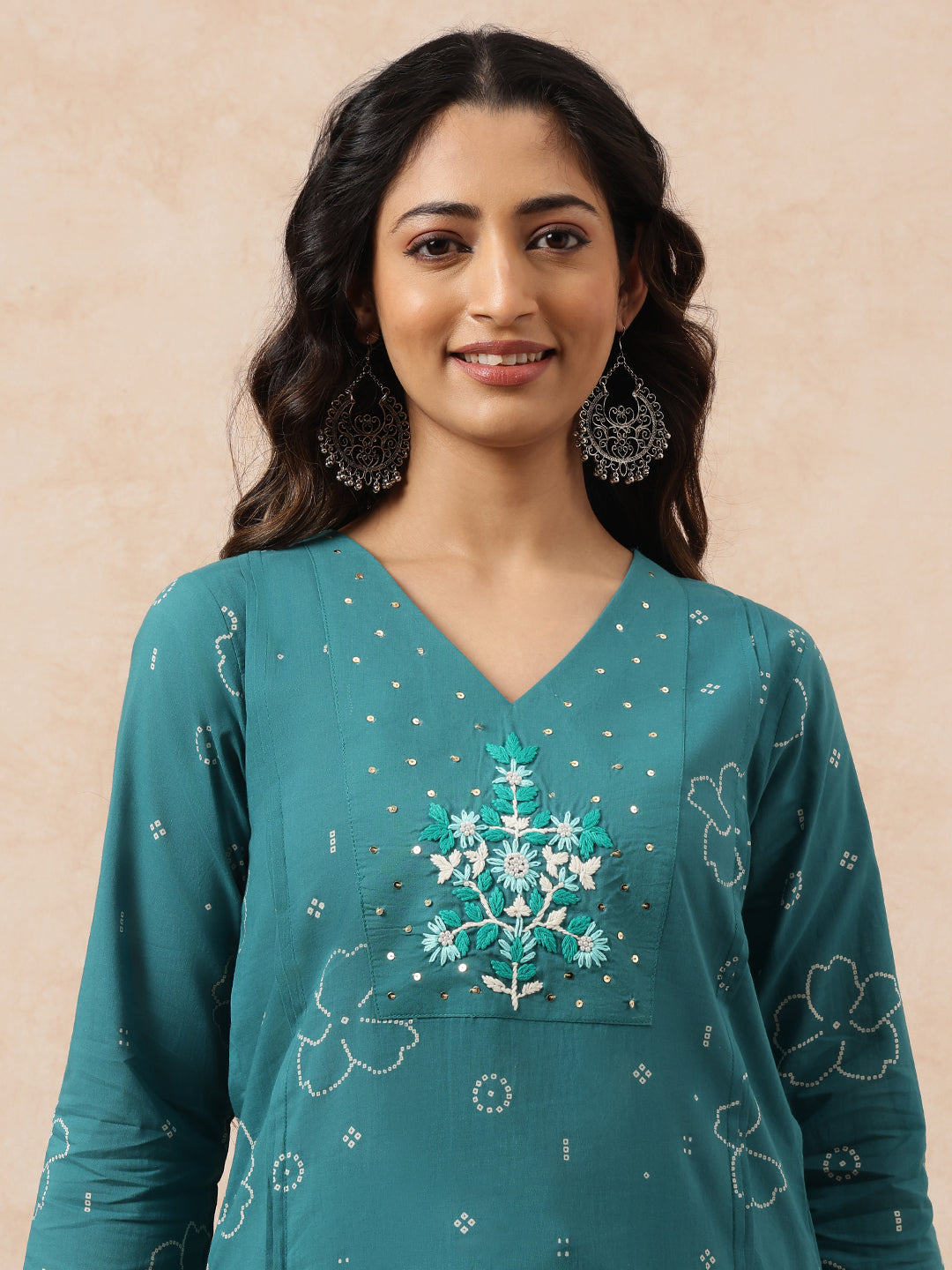 Aqua Bhandhani Straight Cotton Stitched Kurta, Pant With Dupatta