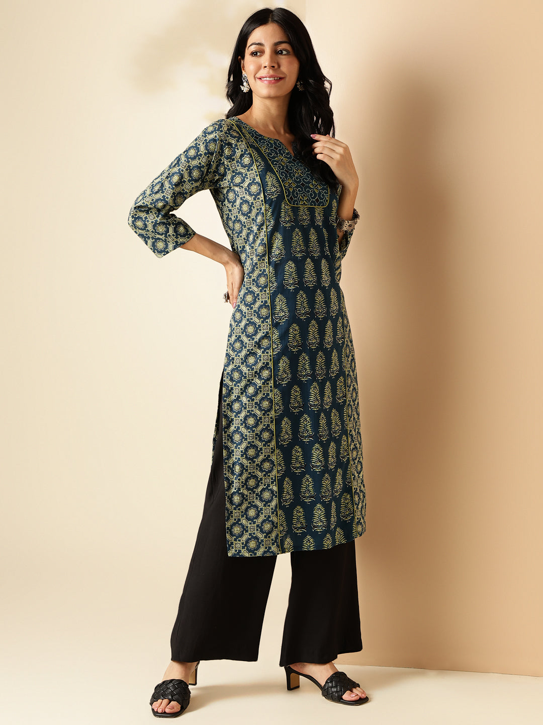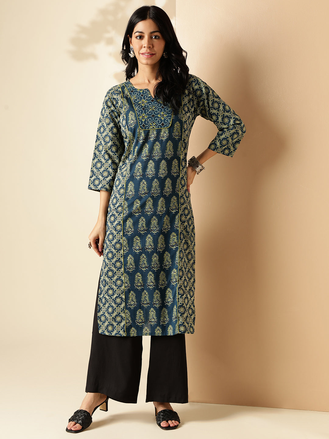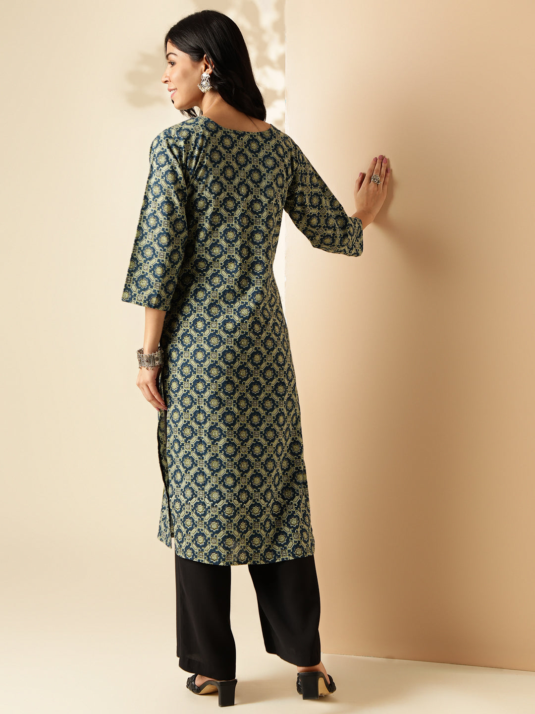 Aqua Blue Geomatric Print Straight Cotton Kurta
