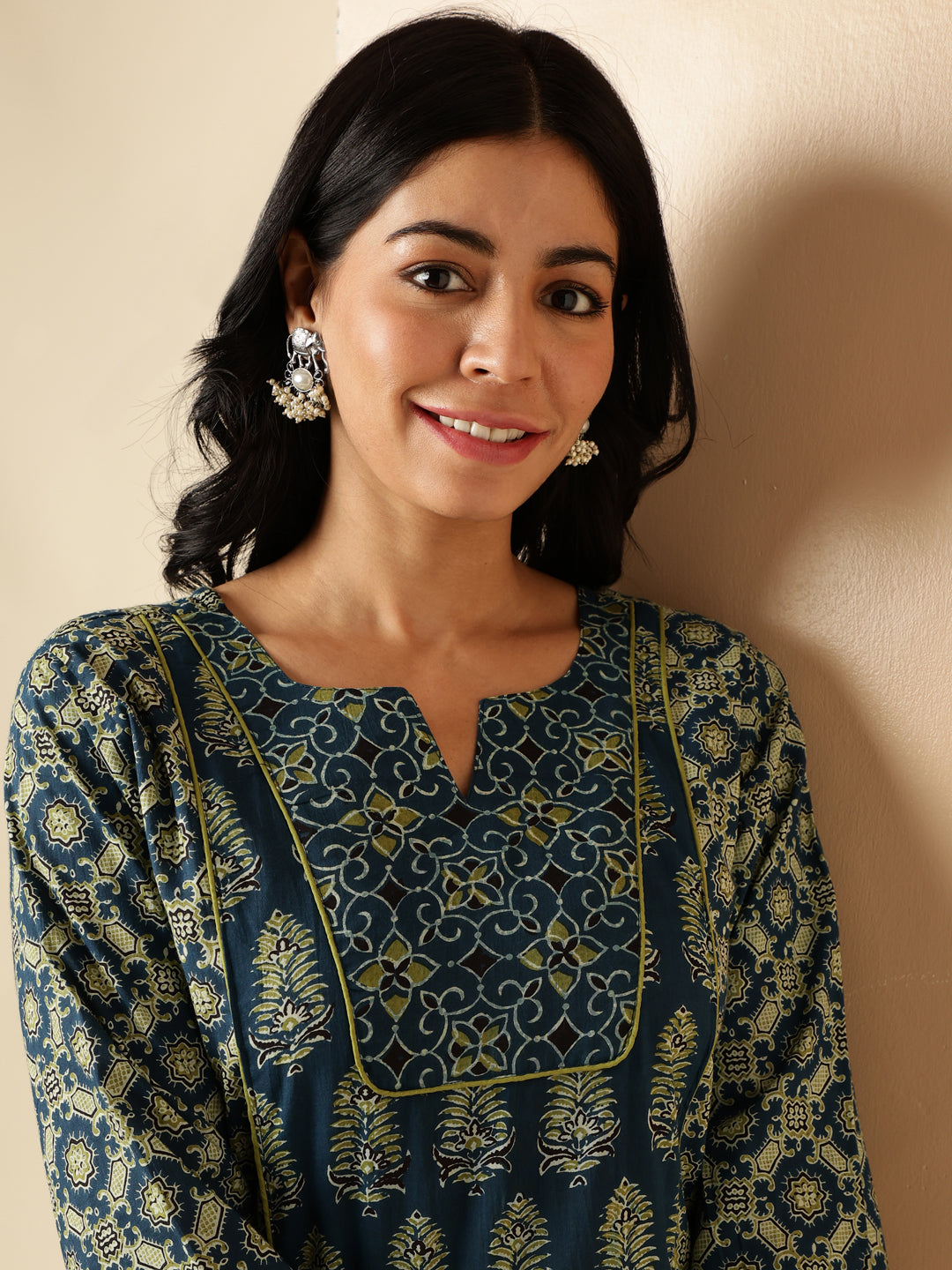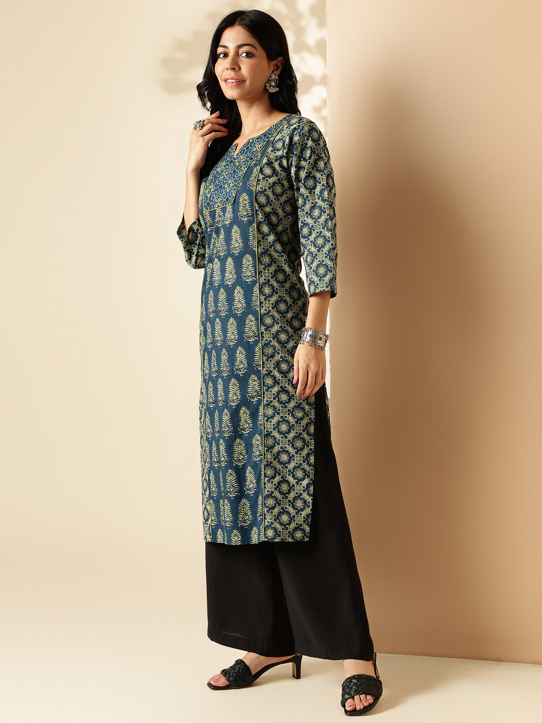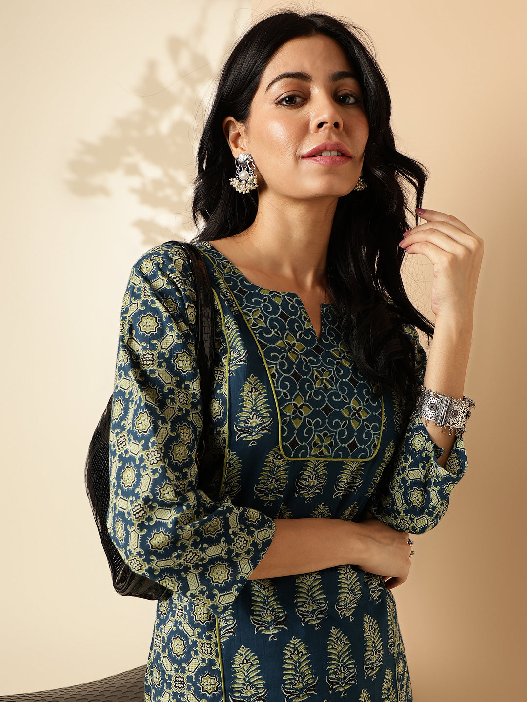 Aqua Blue Geomatric Print Straight Cotton Kurta