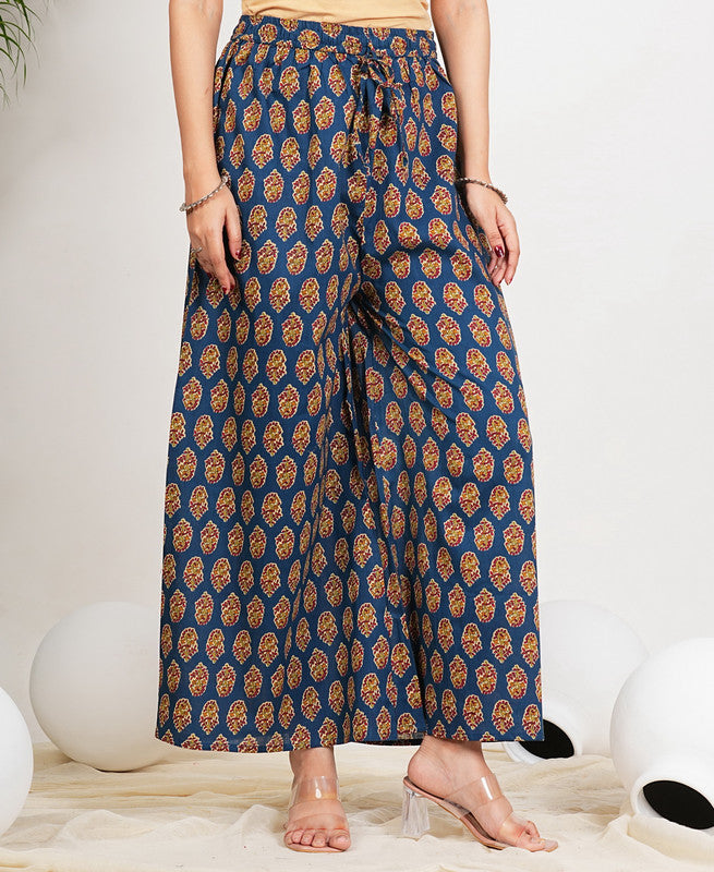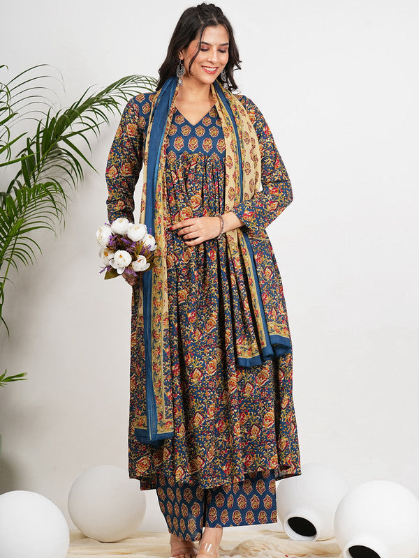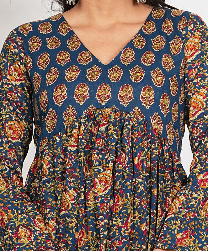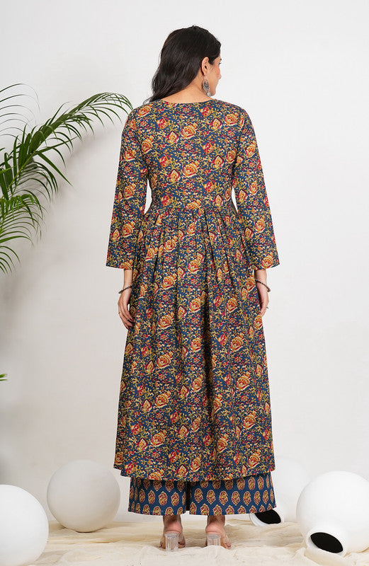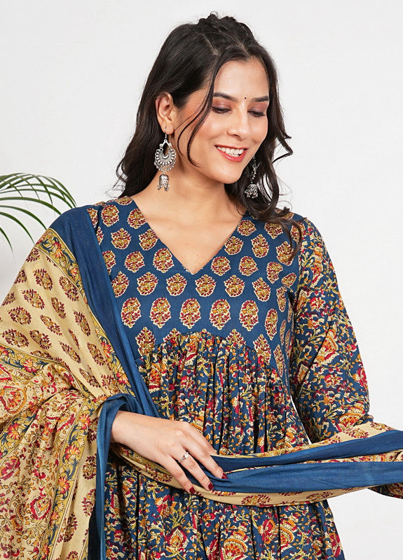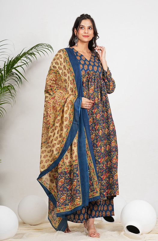 Aqua Blue Kalamkari Print Alia Cut Cotton Kurta set