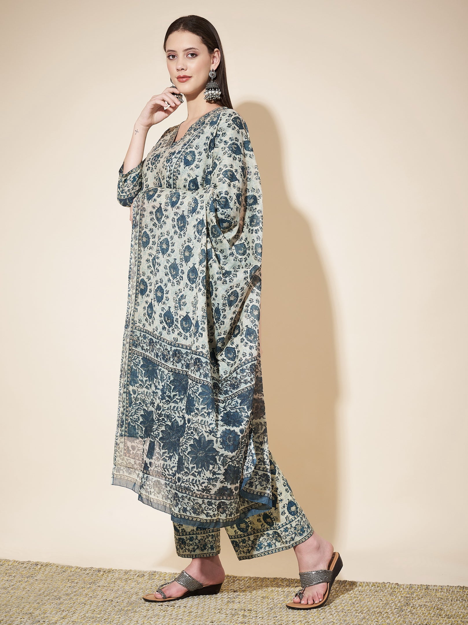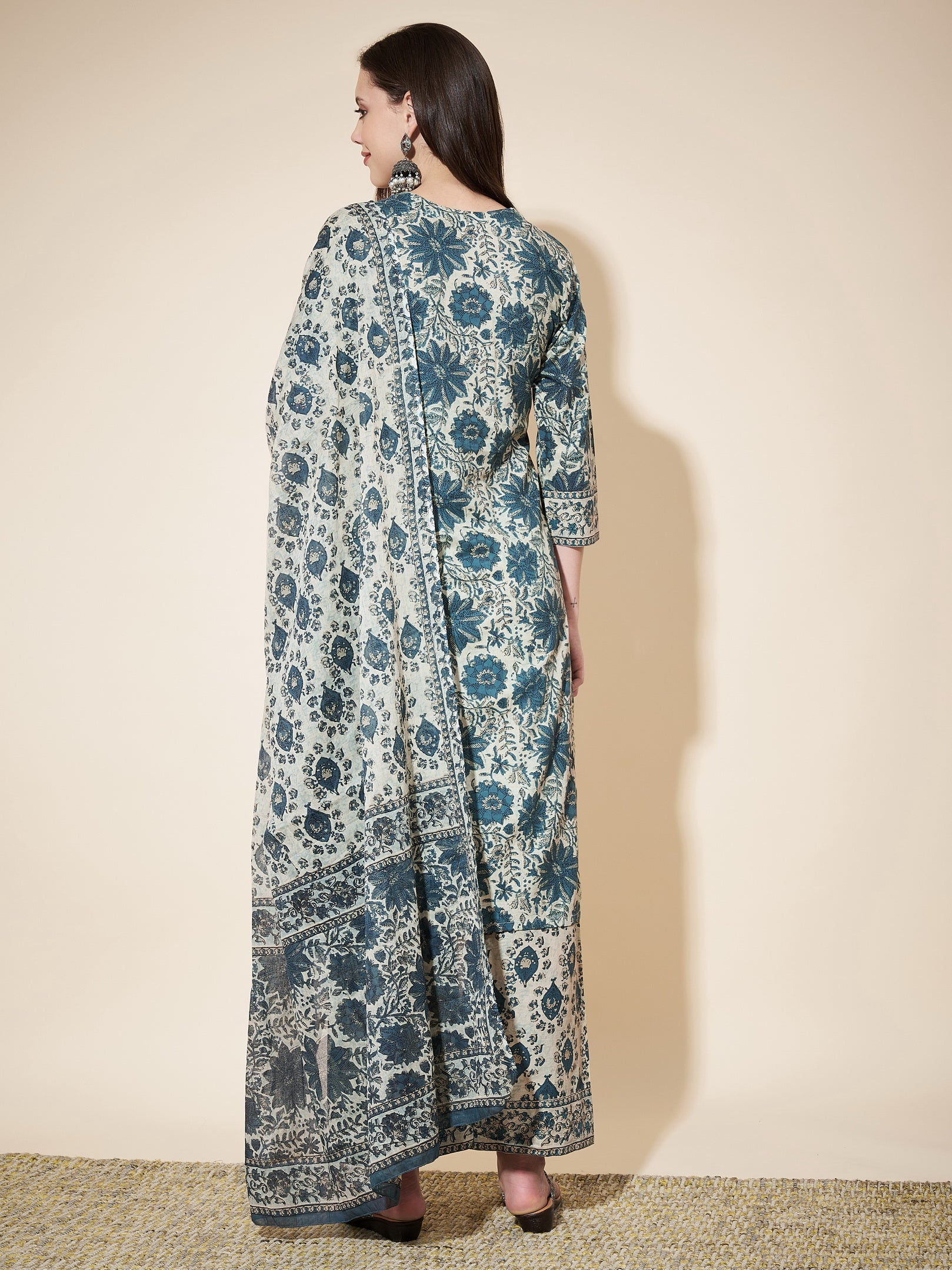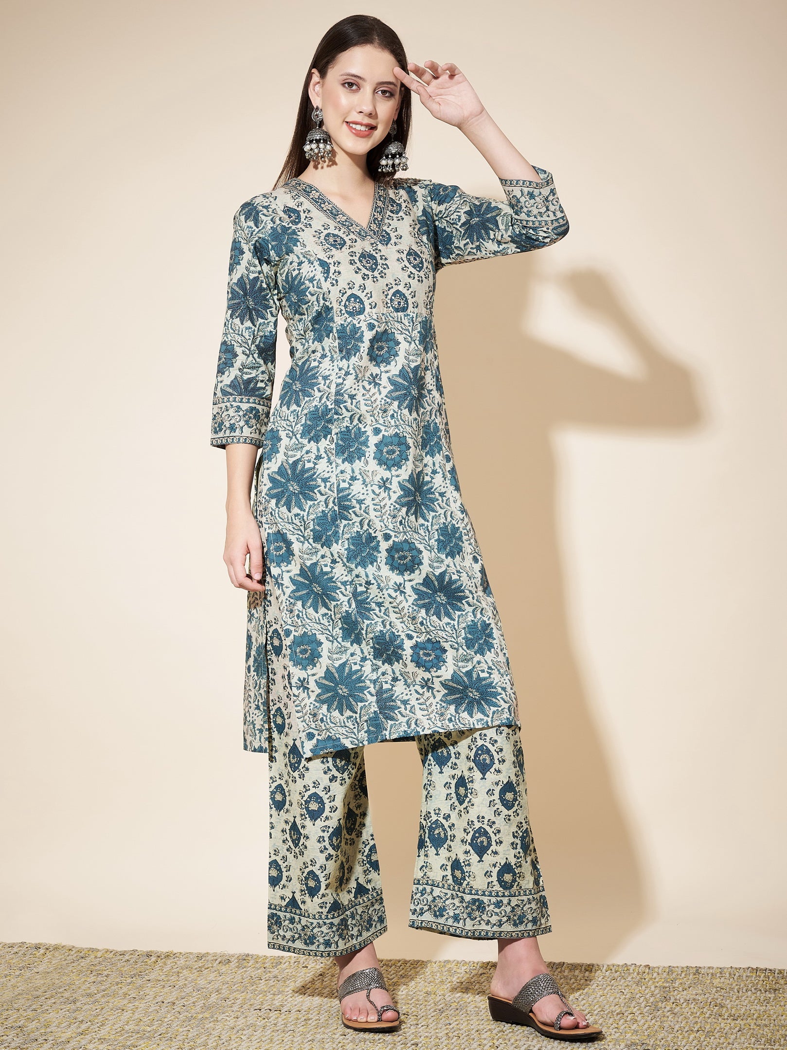 Aqua Blue Printed Straight Cotton Kurta Set