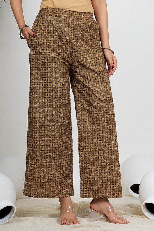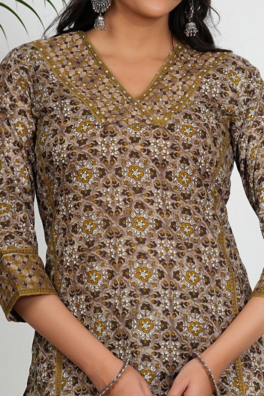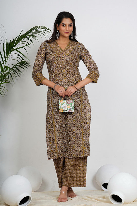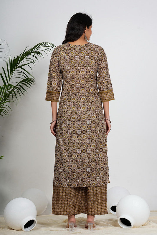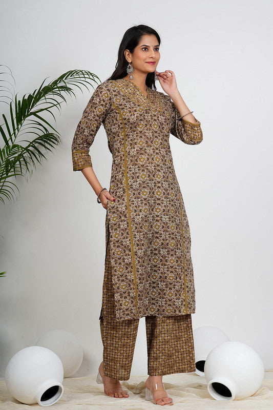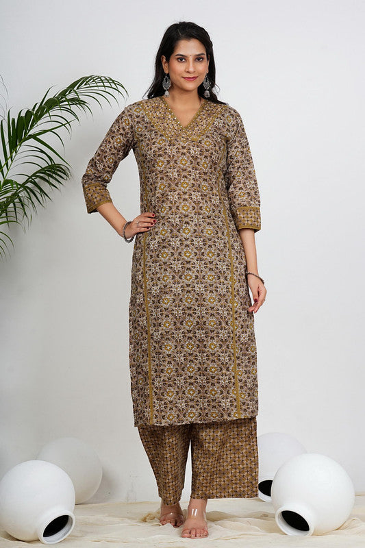 Beige Floral Printed Straight Cotton Stitched Kurta Set