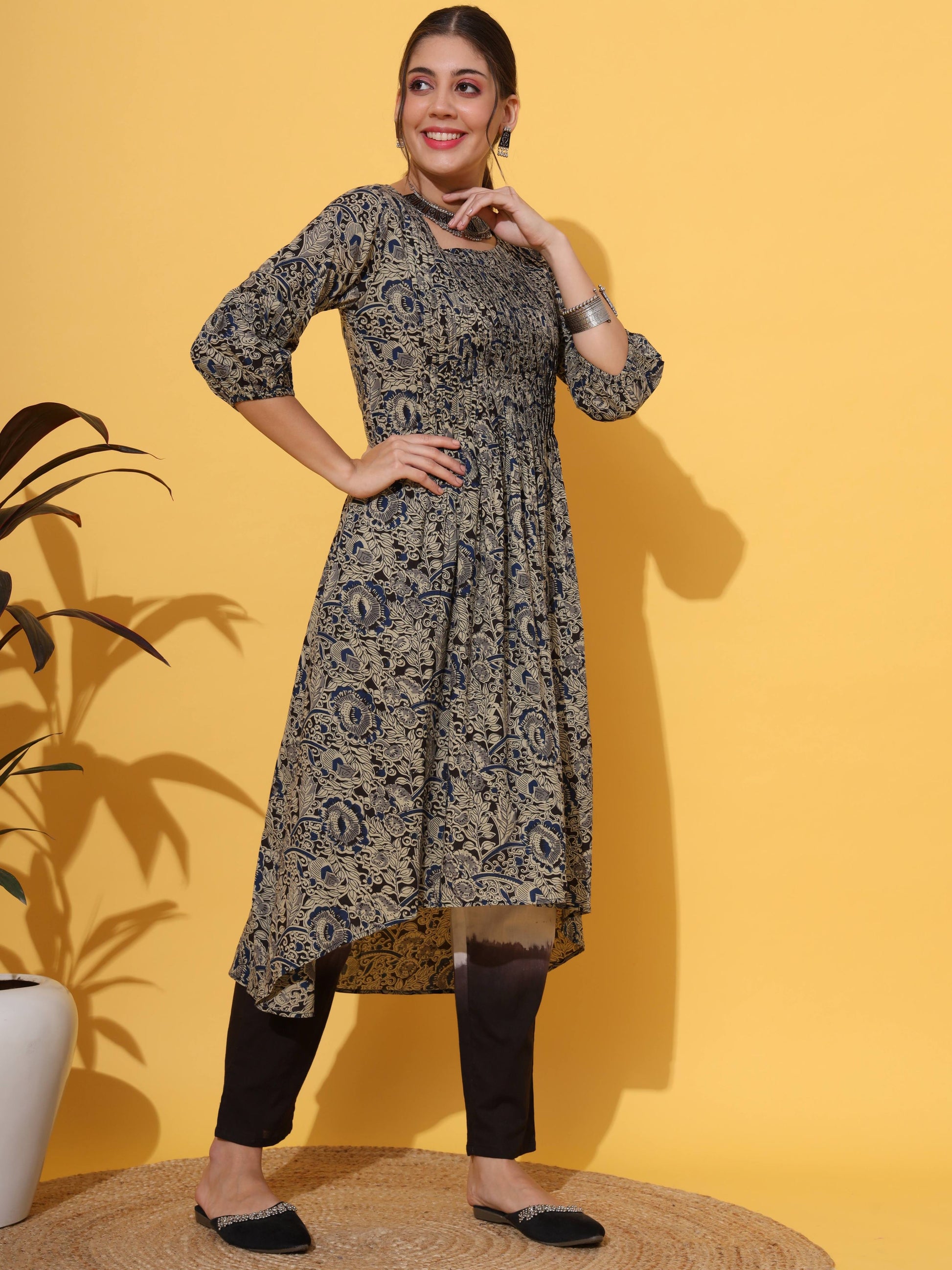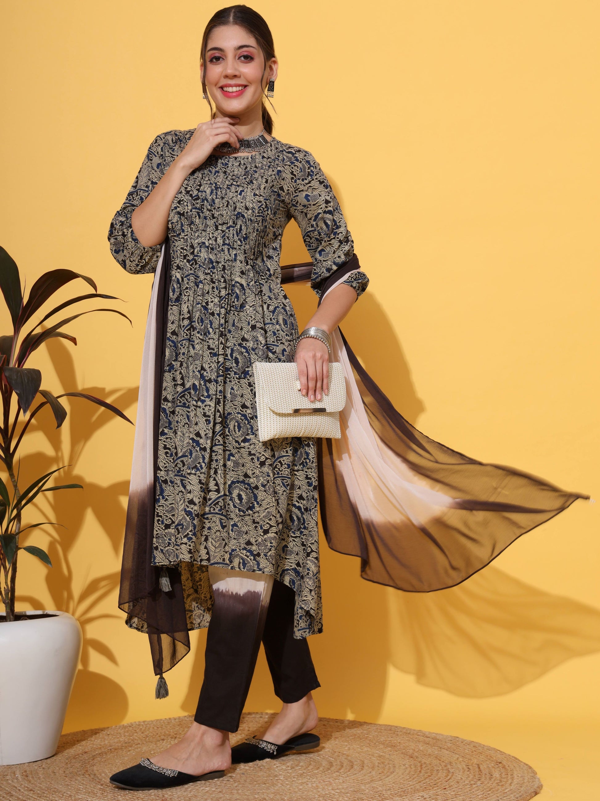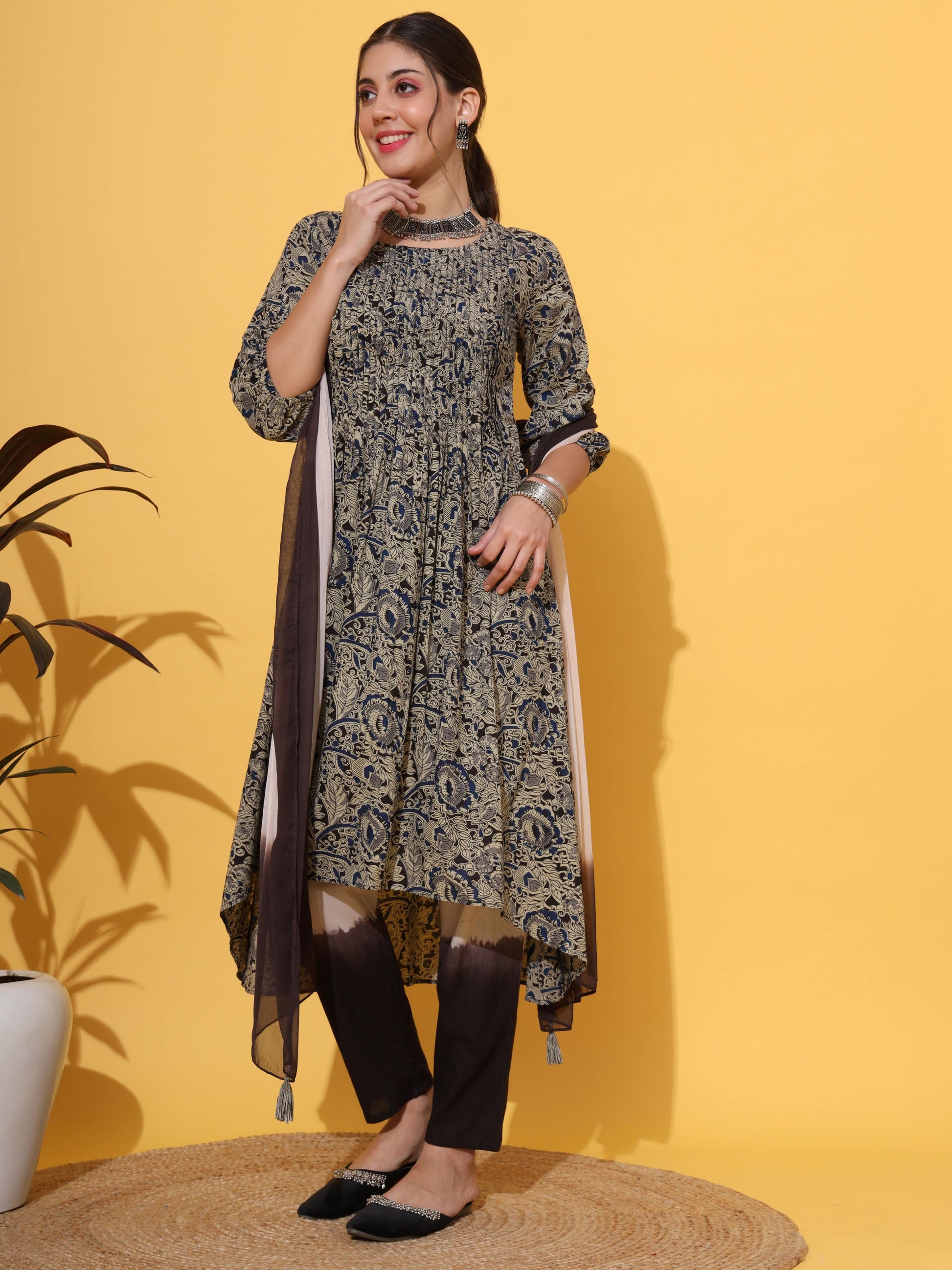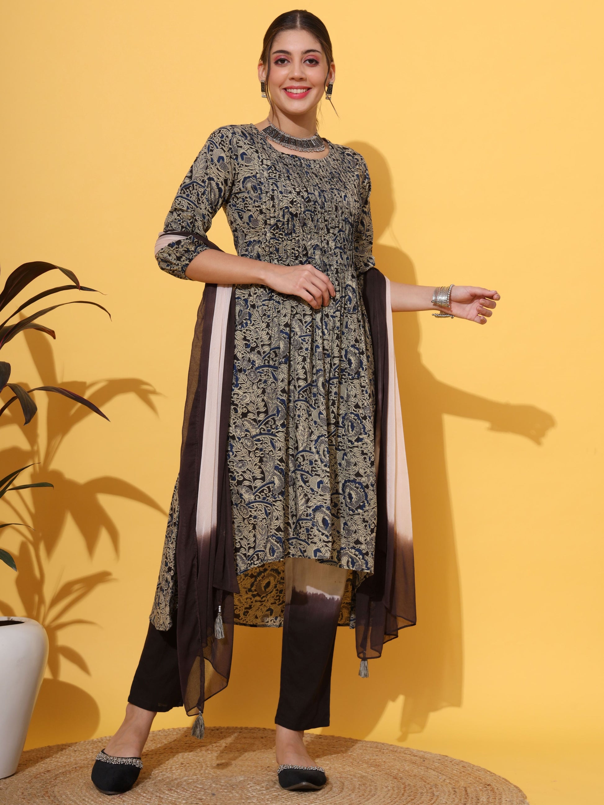 Beige Pleated Anarkali Cotton Stitched Kurta Set