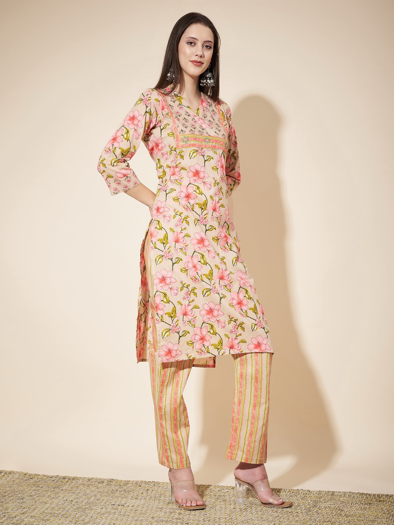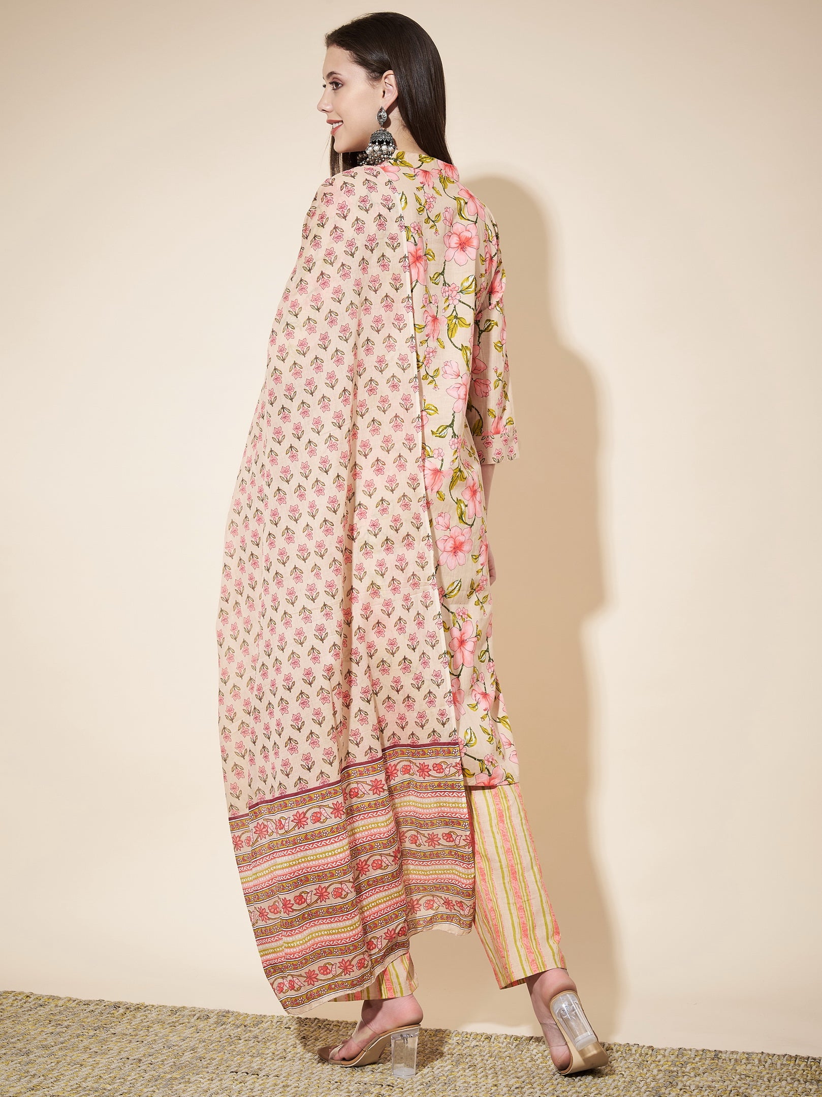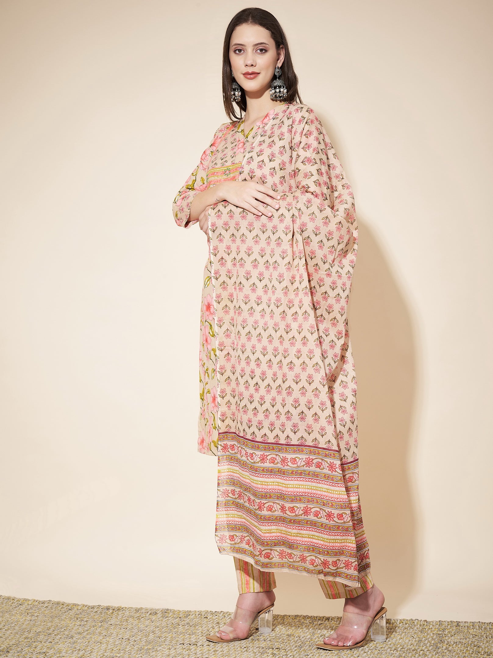 Beige Printed Straight Cotton Kurta Set