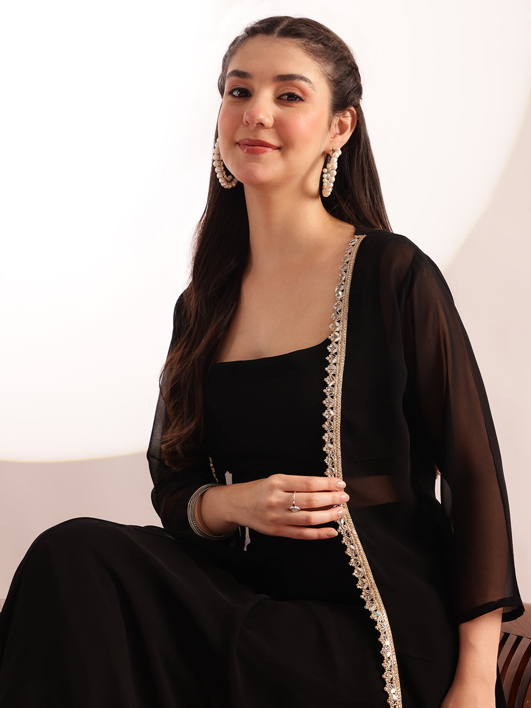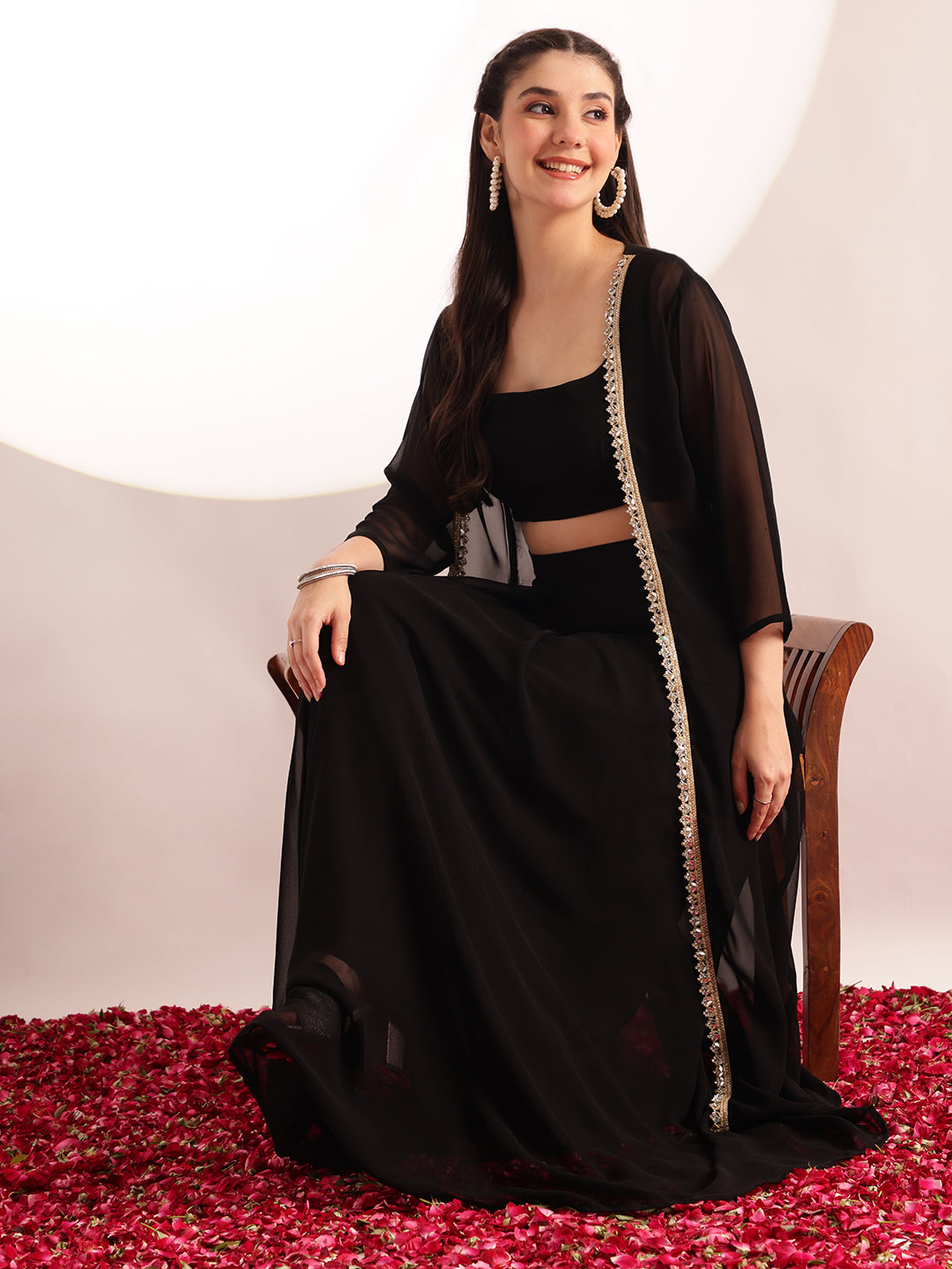 This curated three-piece collection merges traditional craftsmanship with contemporary styling. The black crop top showcases detailed embroidery work on premium georgette fabric, while the straight-fit skirt provides a clean, flattering drape. The accompanying shrug adds dimension and styling flexibility. Each piece is expertly stitched for durability and precision fit. Ideal for weddings, festivals, and formal events, this ensemble delivers the polished aesthetic of coordinated ethnic wear with the comfort of quality construction.