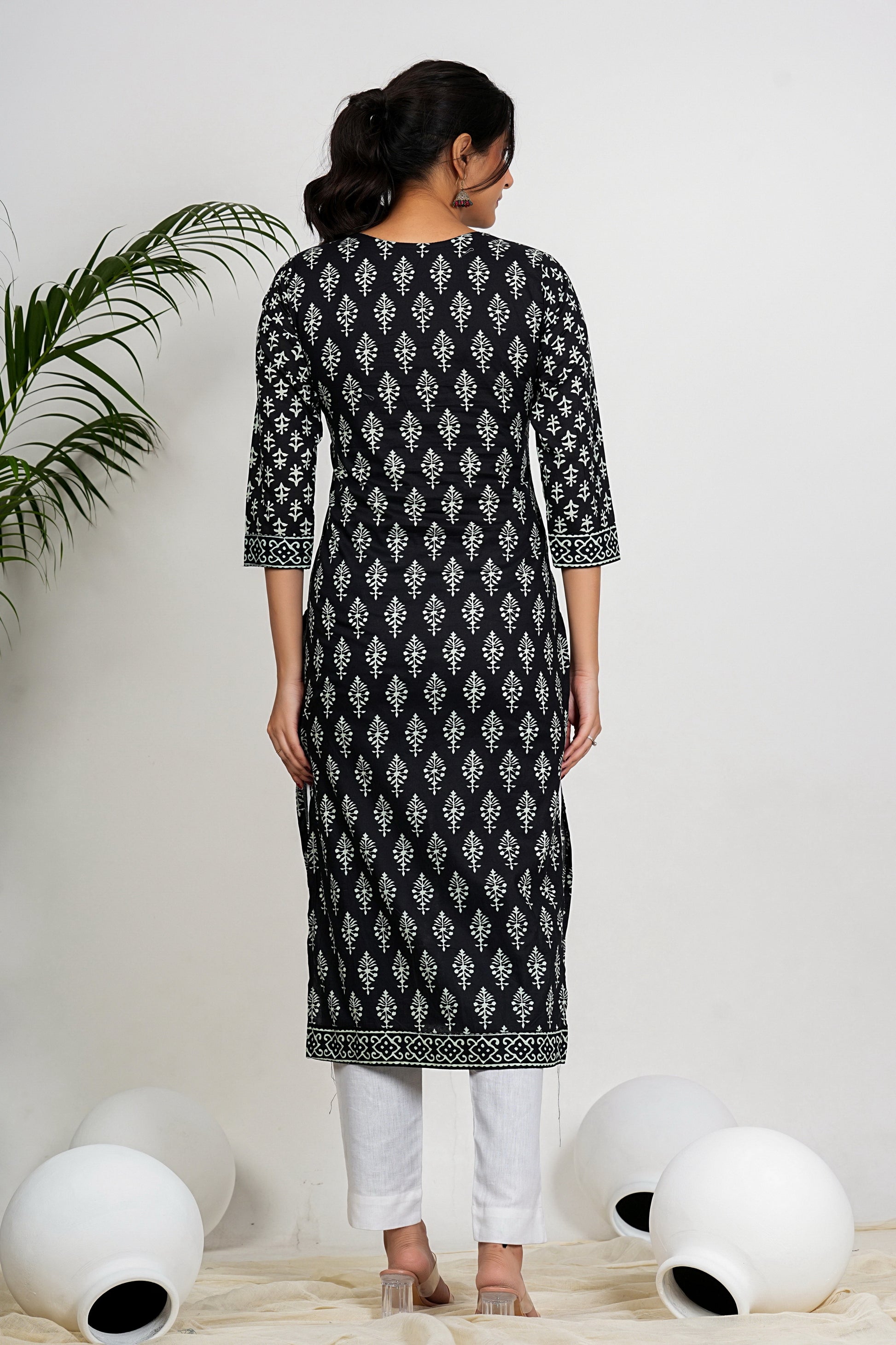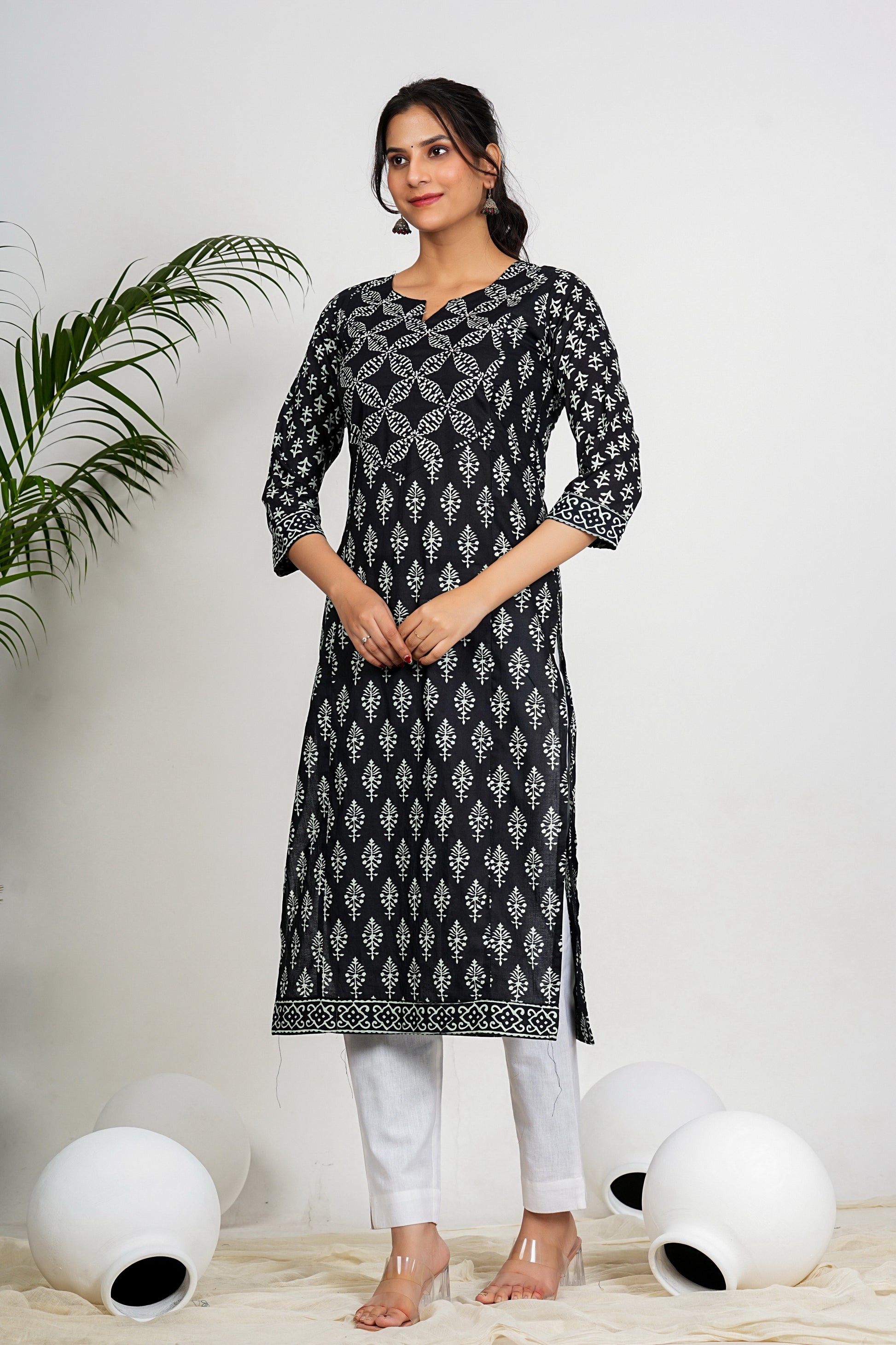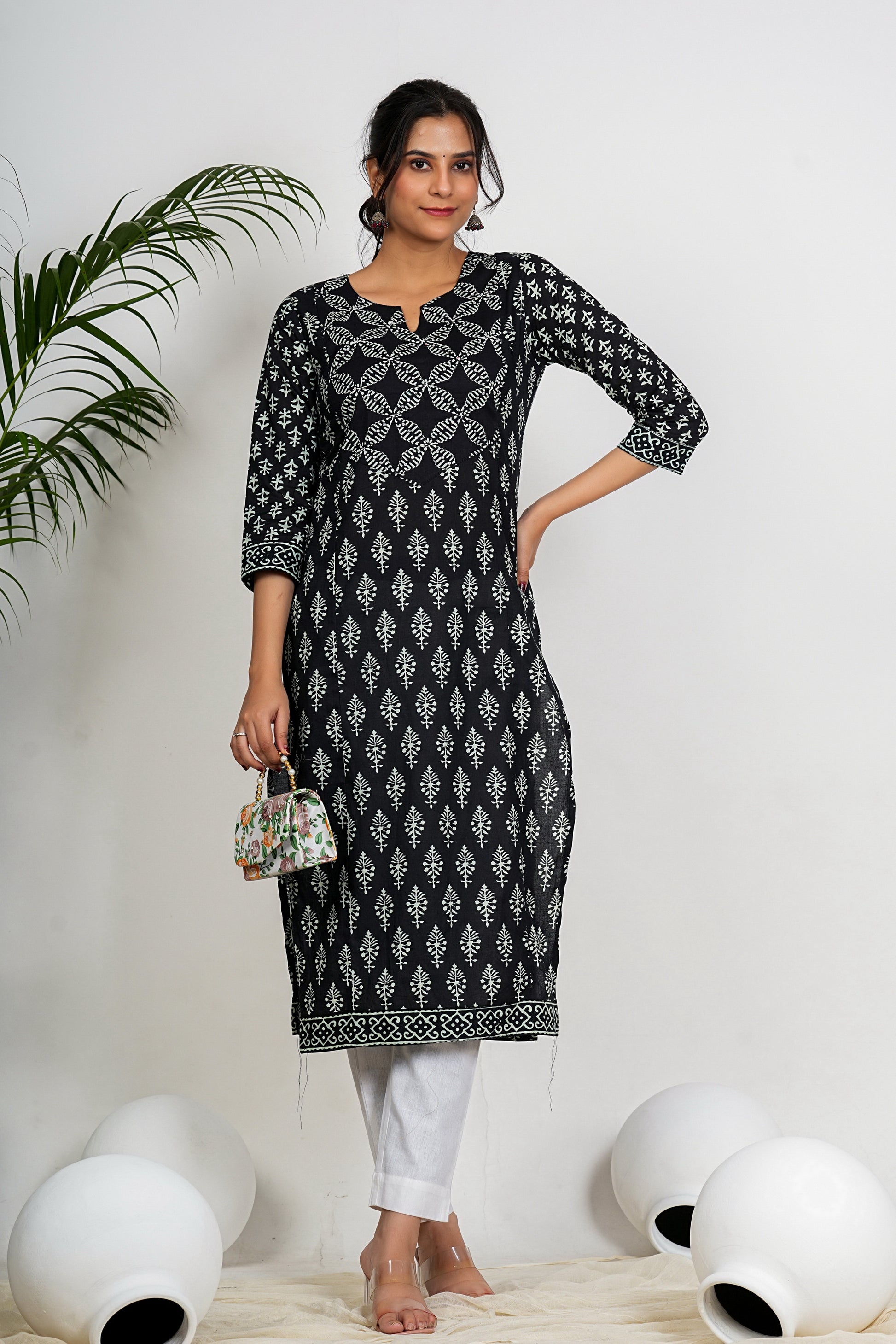 This kurta is the perfect blend of style and comfort, with its black floral print and straight cut in soft cotton fabric. It's a versatile piece that can be dressed up or down for any occasion. Stay chic and comfortable in this quirky, fun kurta!