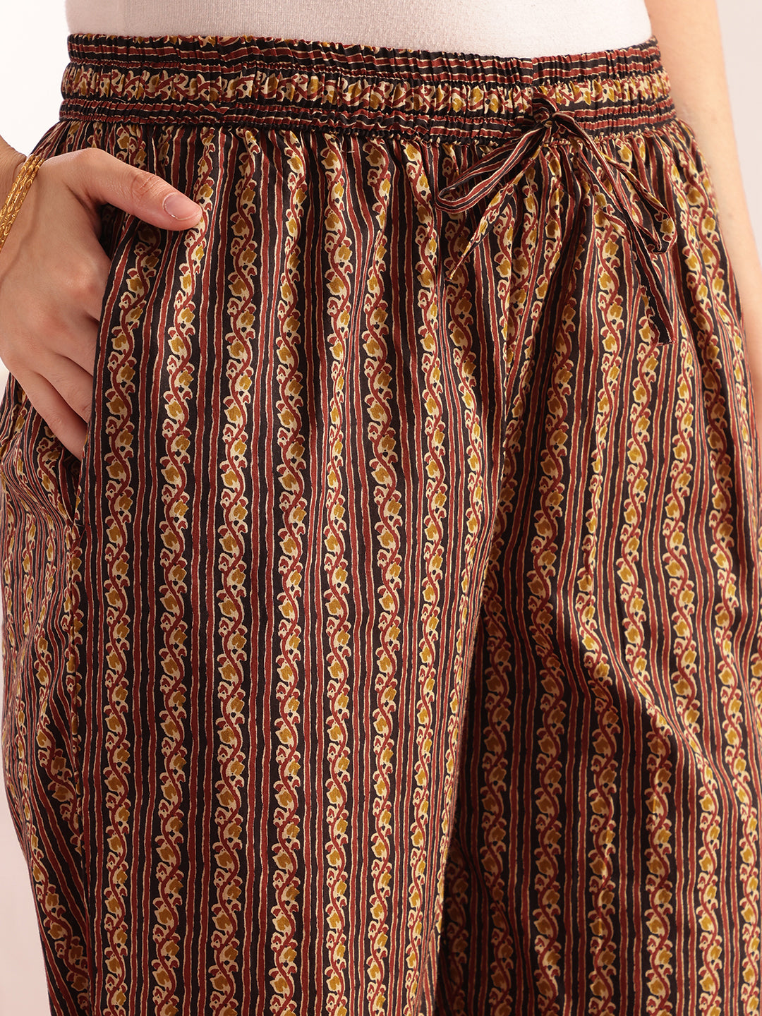 This Black Kalamkari Print Anarkali set combines traditional craftsmanship with comfortable cotton fabric, featuring a beautifully printed kurta, matching pants, and a coordinating dupatta. The detailed Kalamkari design adds an elegant touch, making it perfect for both festive occasions and everyday wear. Lightweight and breathable, this ensemble ensures effortless style while honoring classic Indian textile art.