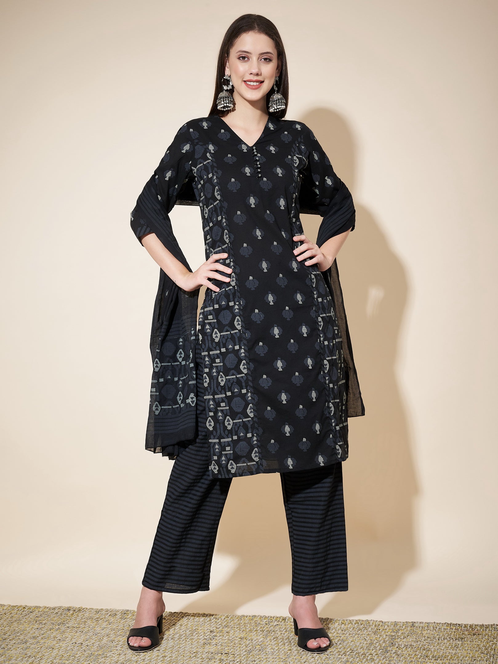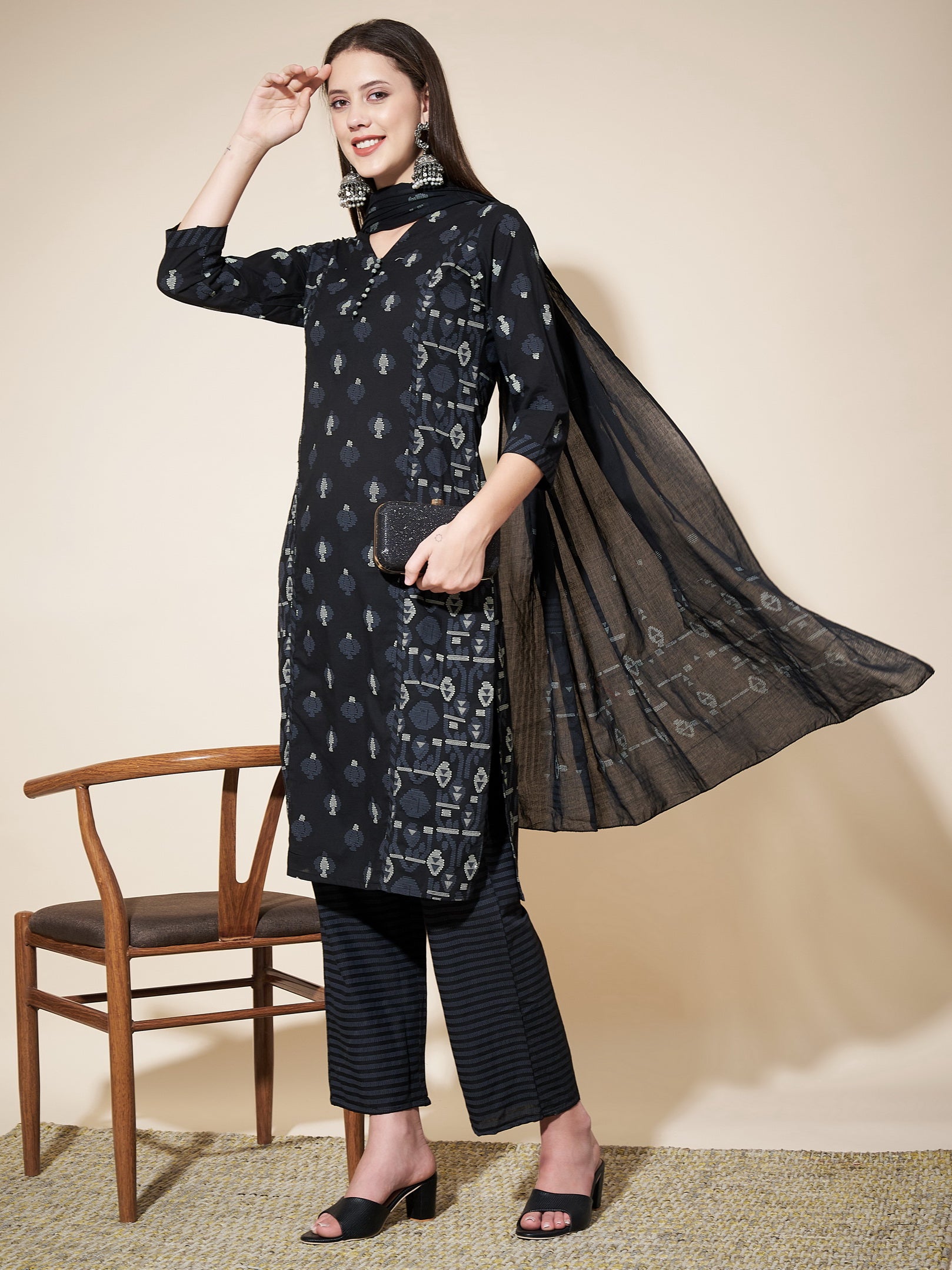This kurta set will have you looking sharp and stylish with its black printed design and straight cut. Made from high-quality cotton, it offers comfort and versatility. Perfect for any casual or formal occasion, this kurta set is a must-have for any fashion-forward individual.