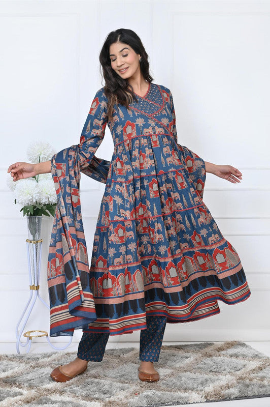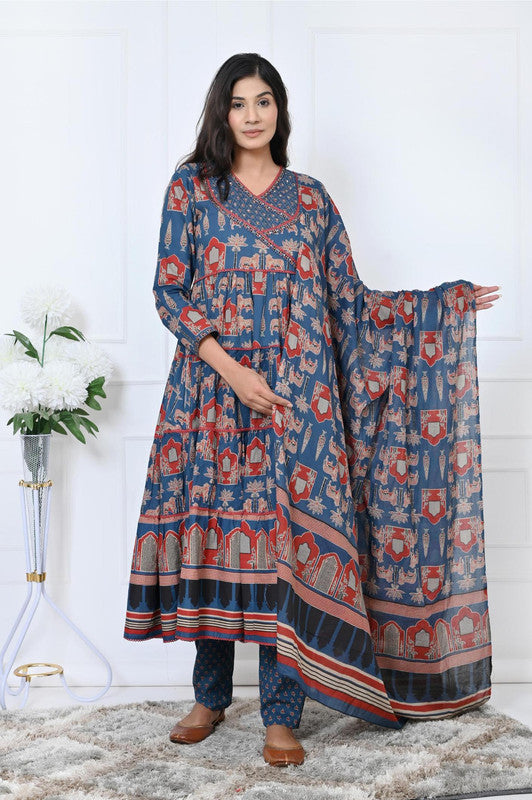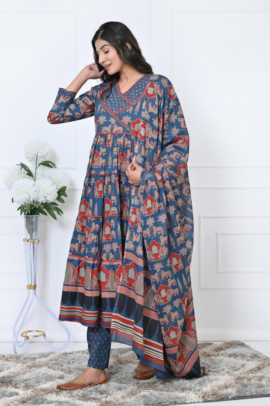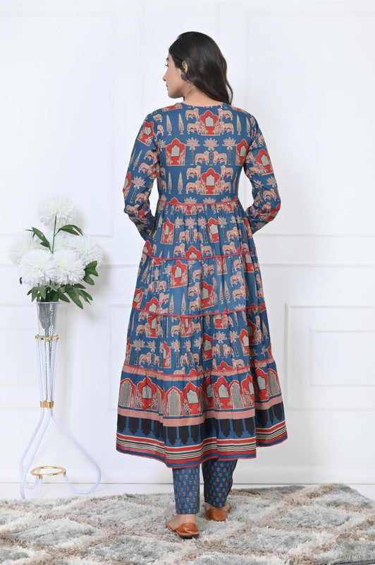 Blue Animal Print With Sequence Work Anarkali Cotton Kurta Set