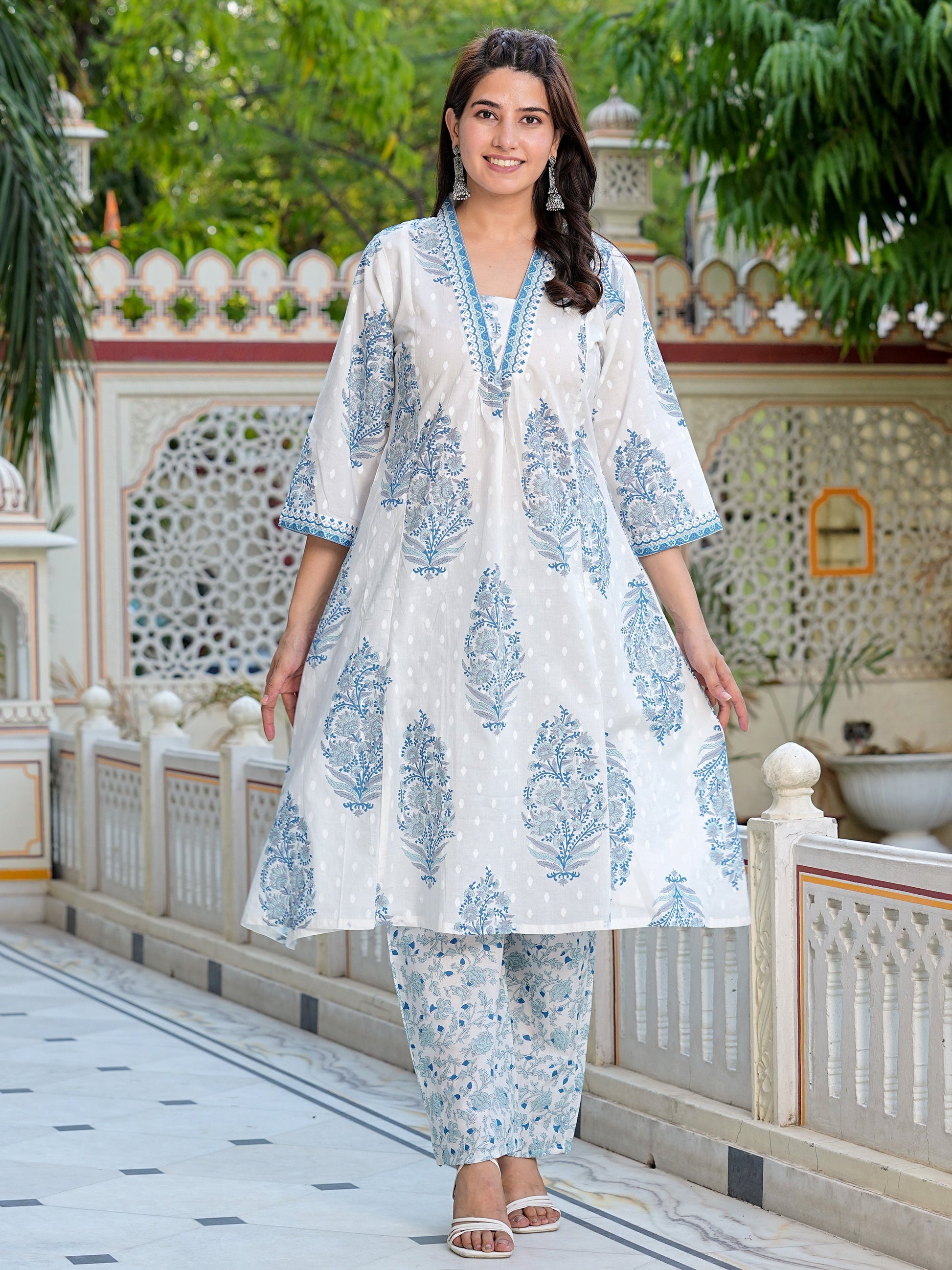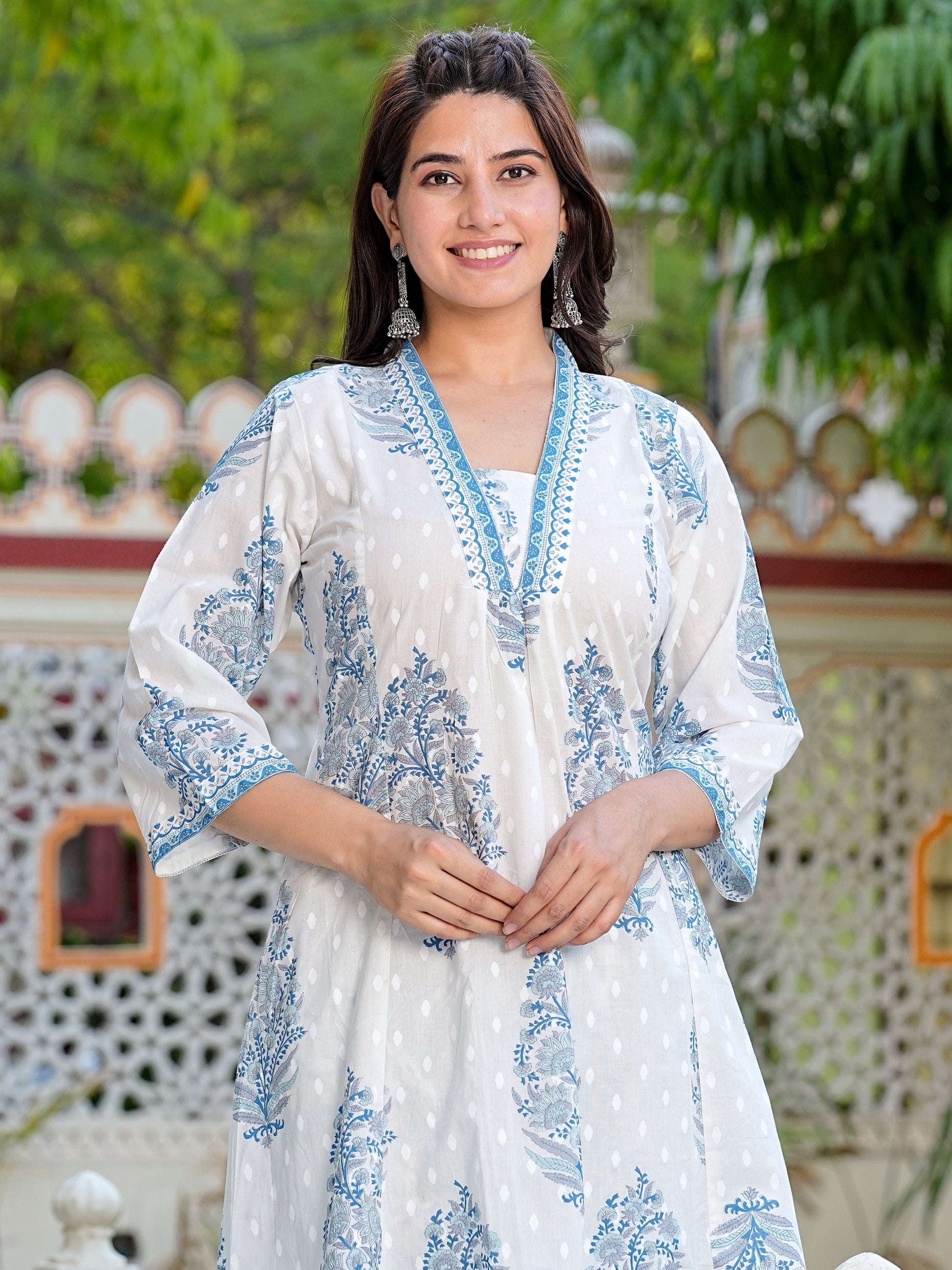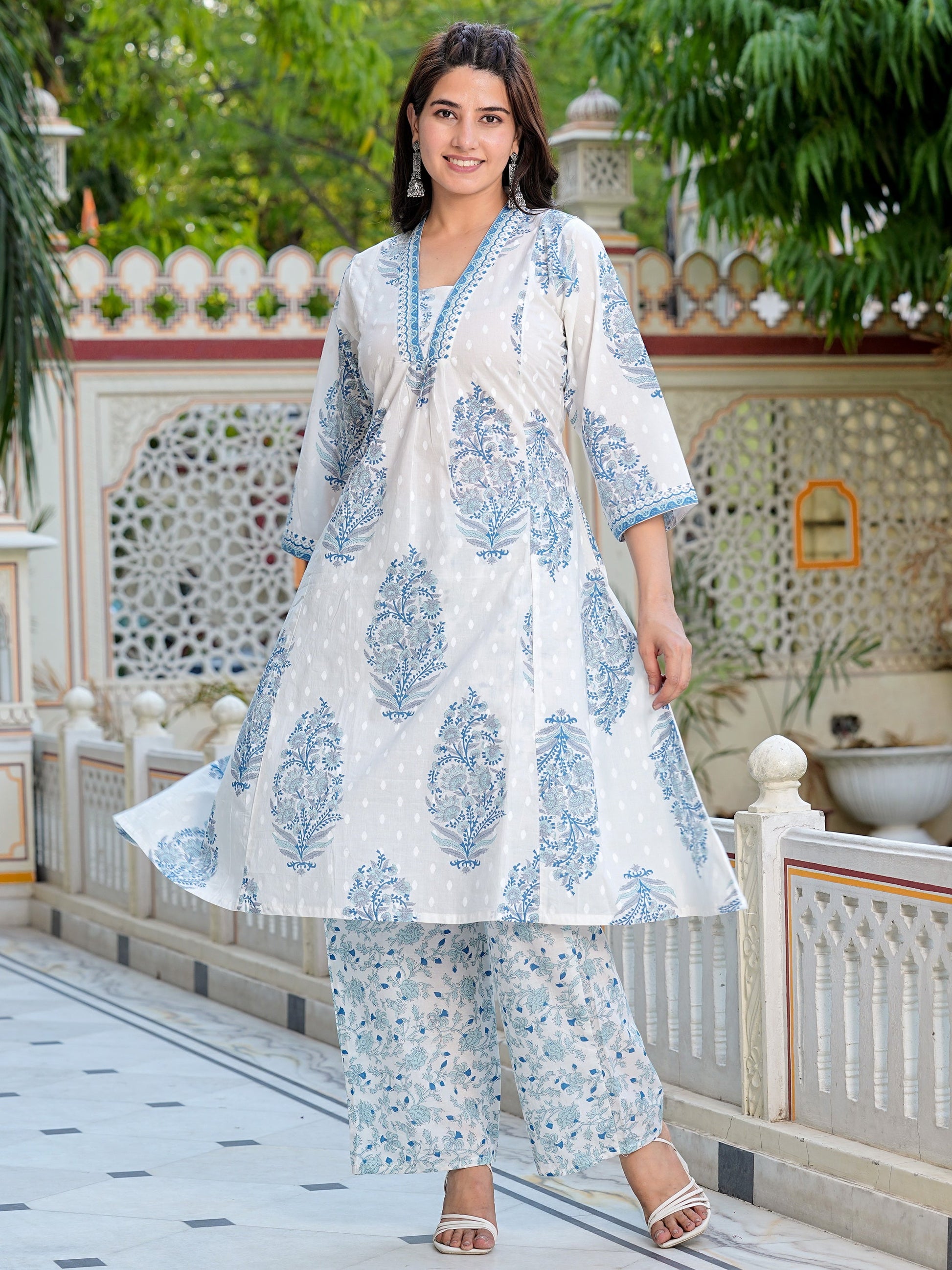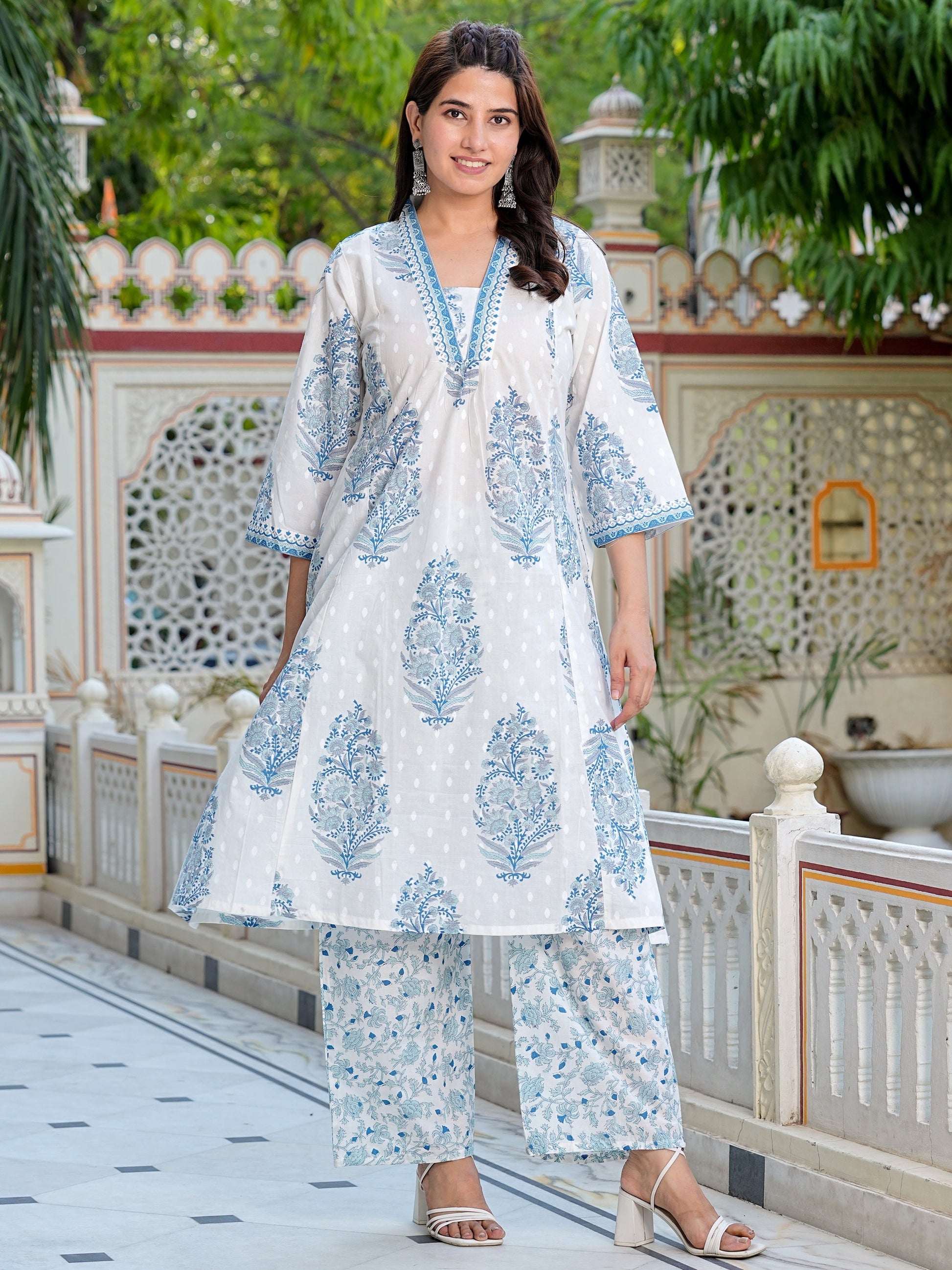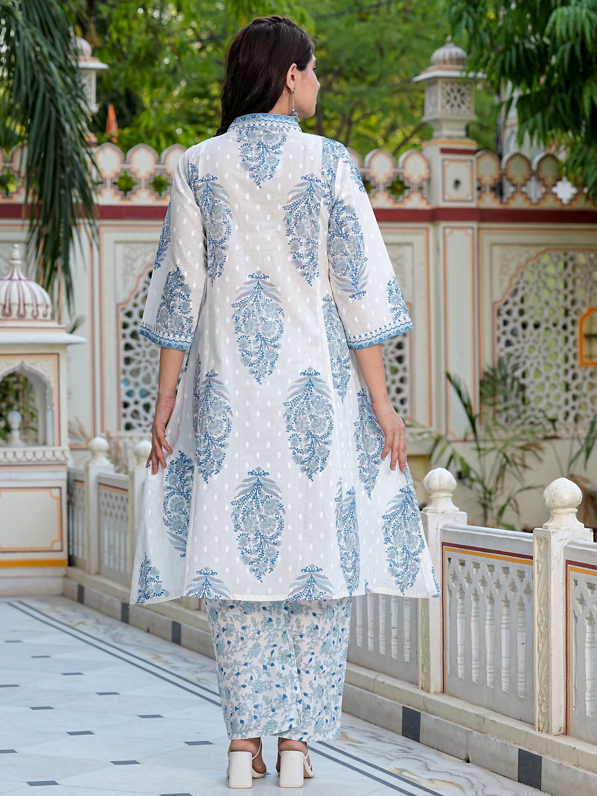 Make a statement with our Blue Cotton Printed Kurta paired with Palazoo! This quirky and fun outfit is perfect for adding a touch of playfulness to your wardrobe. The soft cotton fabric ensures comfort while the unique print adds a pop of color. (Slay the fashion game without sacrificing comfort with our Blue Cotton Printed Kurta and Palazoos!)