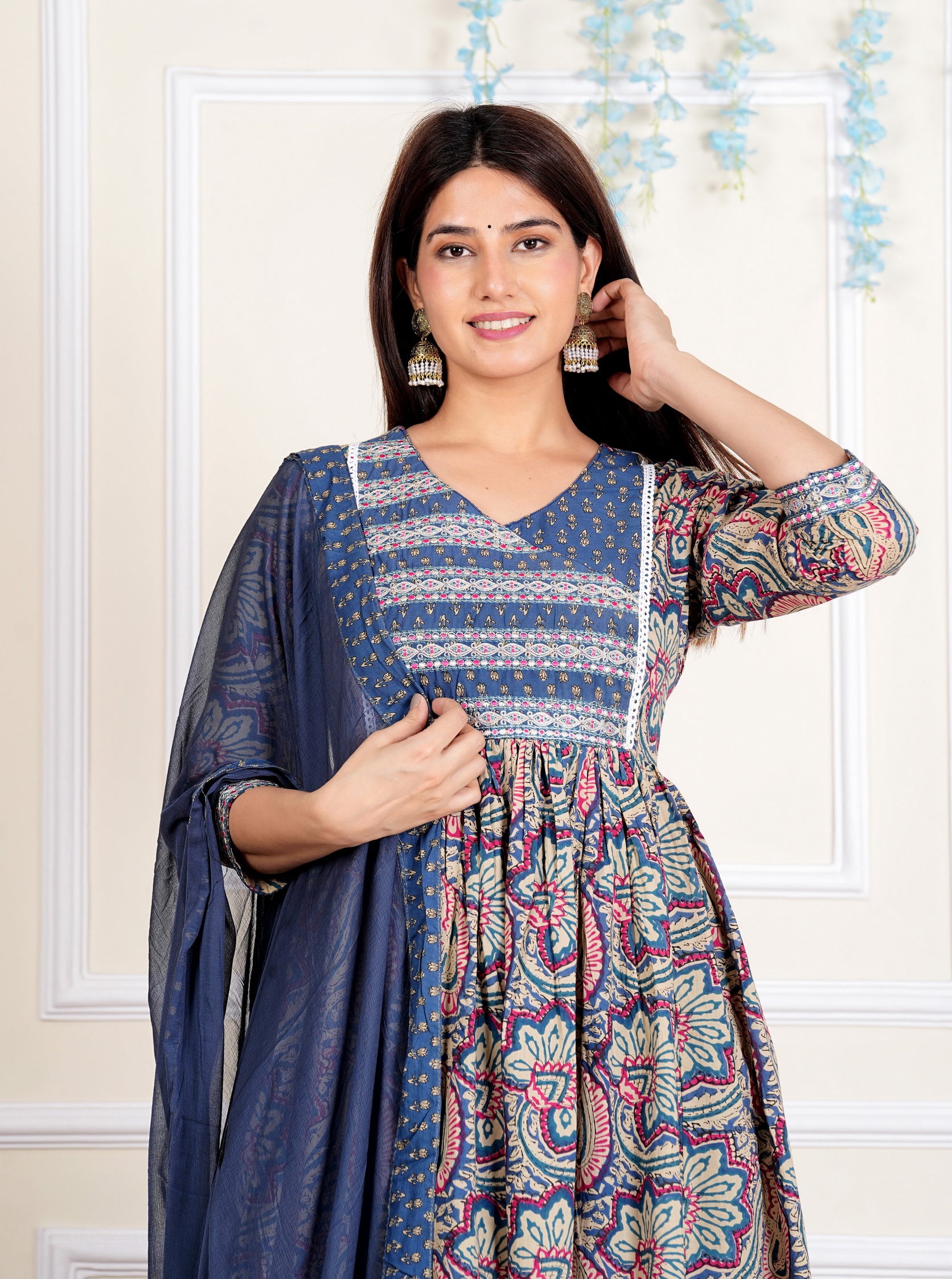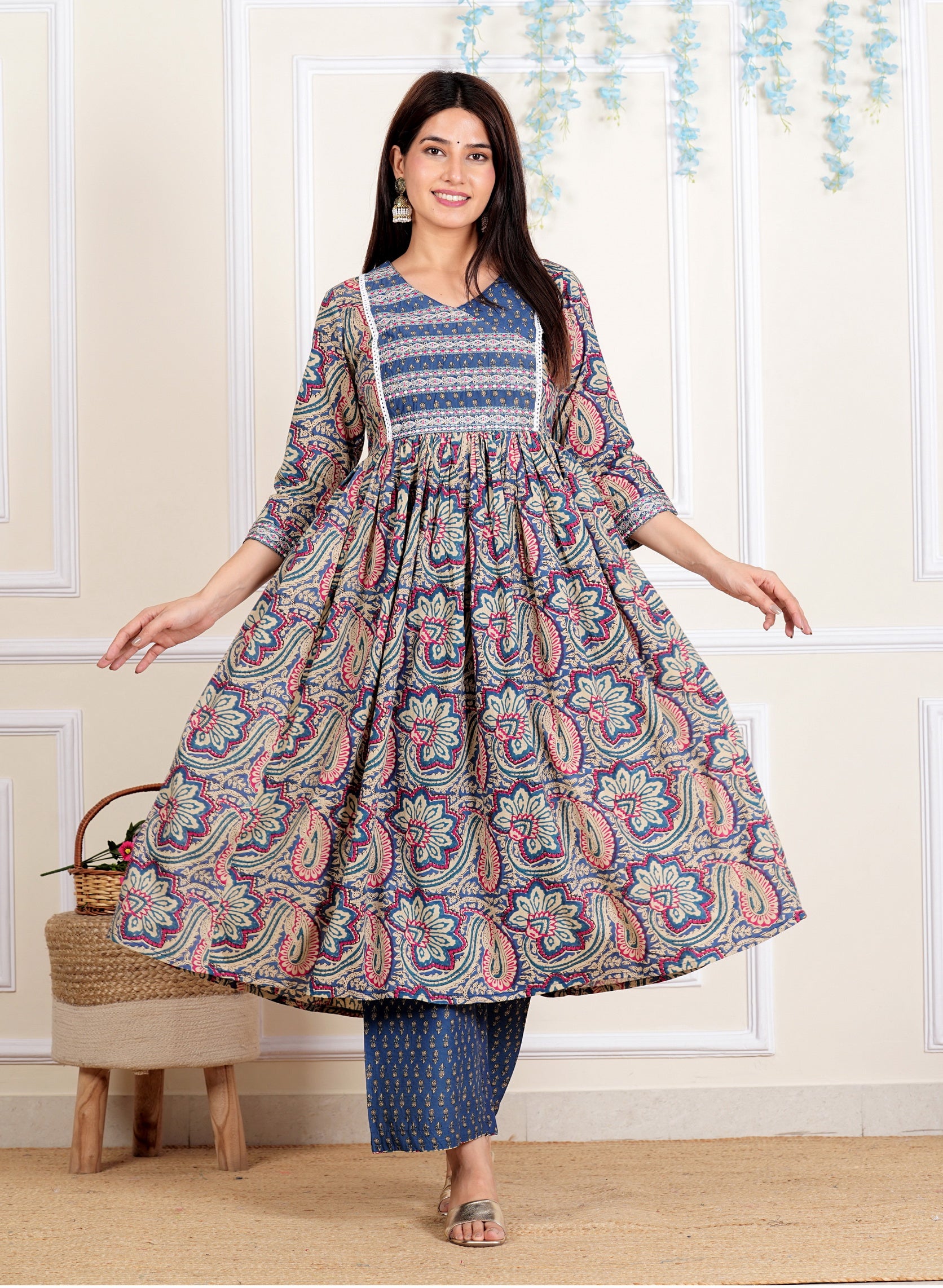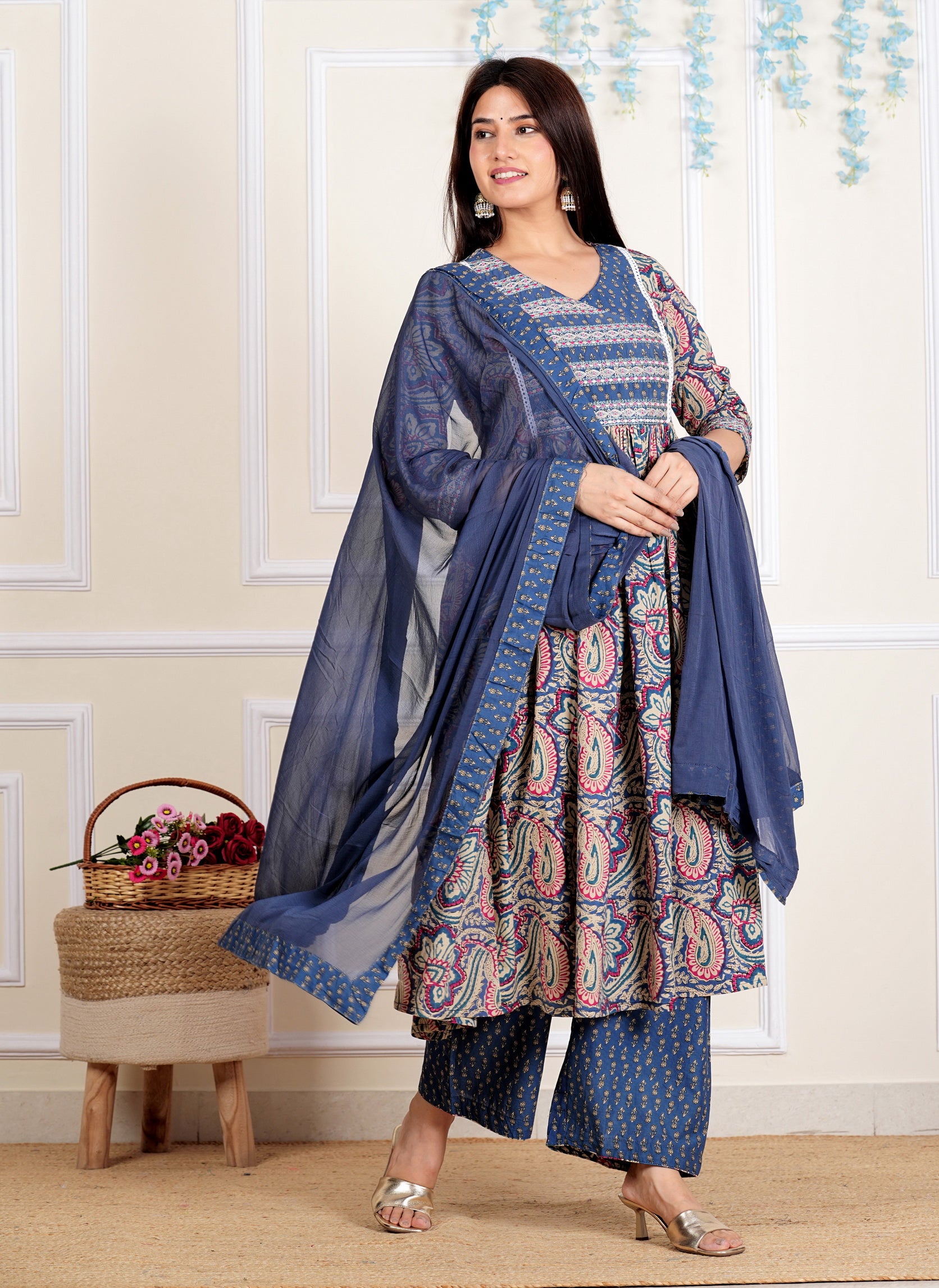 Be the centre of attention in this chic Blue Embroidered Anarkali Cotton Kurta Set. Made from high-quality cotton, this set features elegant embroidery that adds a touch of sophistication. This set will bring out your unique style and personality, perfect for any occasion. Get ready to turn heads and make a statement!