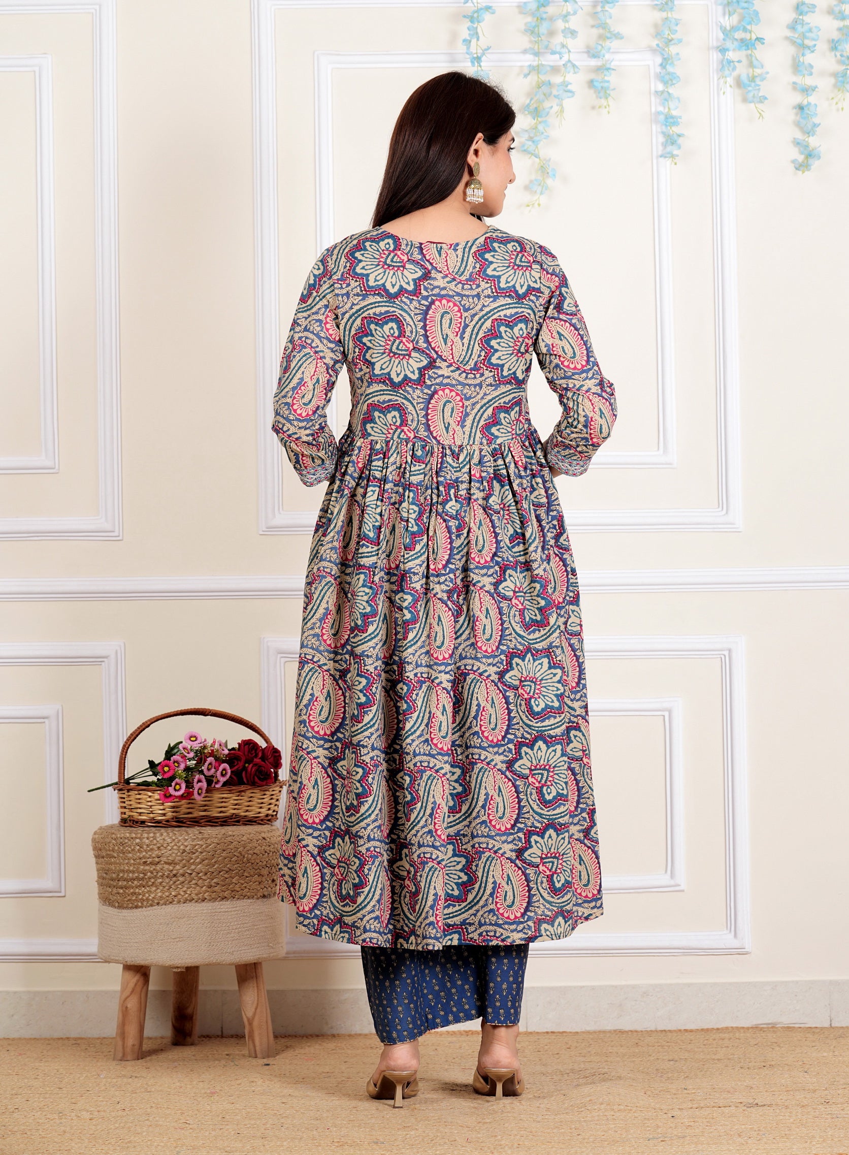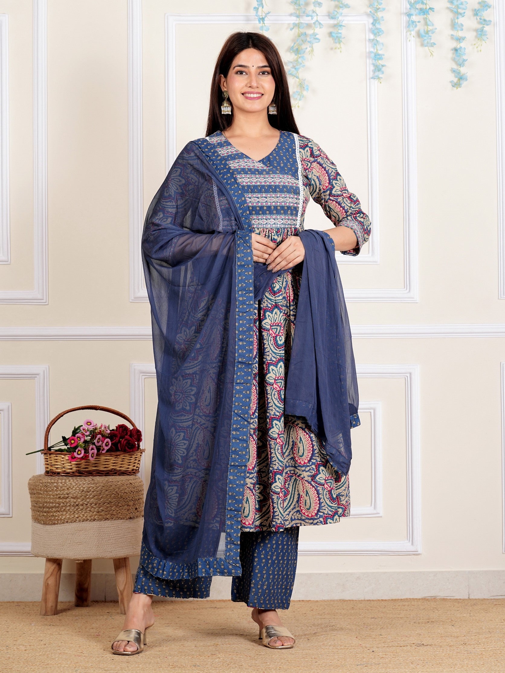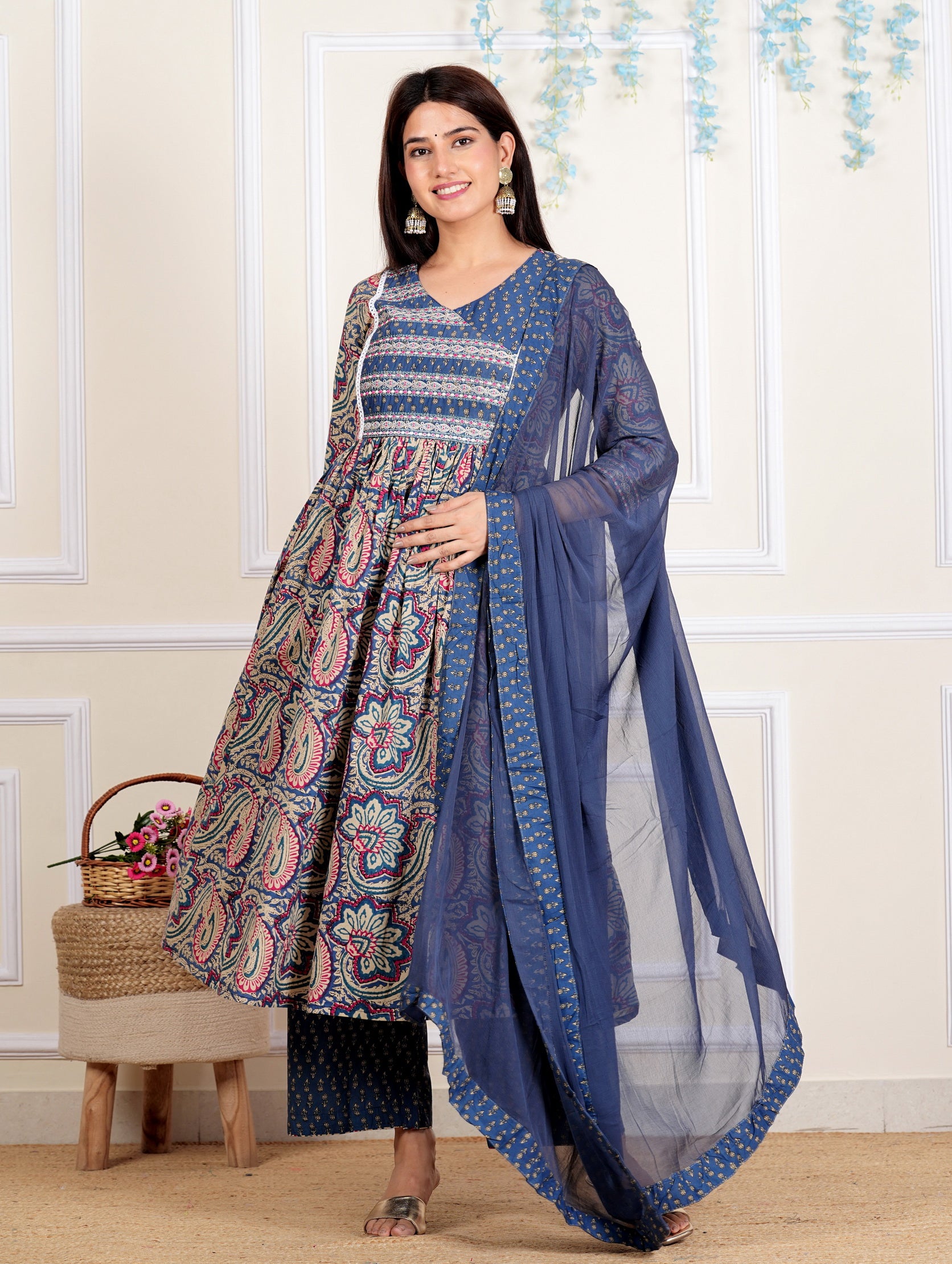 Be the centre of attention in this chic Blue Embroidered Anarkali Cotton Kurta Set. Made from high-quality cotton, this set features elegant embroidery that adds a touch of sophistication. This set will bring out your unique style and personality, perfect for any occasion. Get ready to turn heads and make a statement!