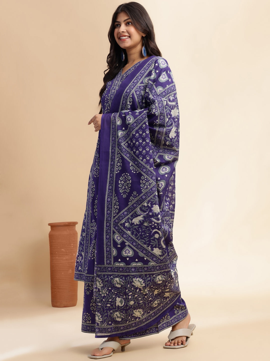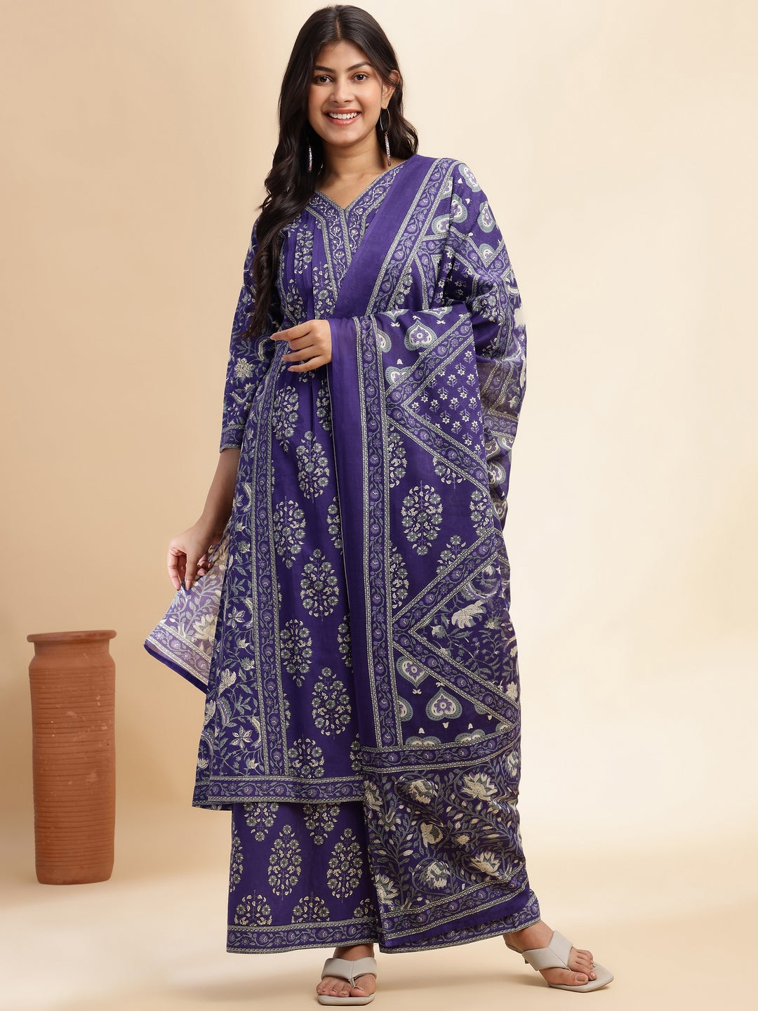Crafted from breathable cotton, this Blue Floral Print A-Line Kurta Set offers both comfort and style. The A-line design provides a flattering fit, while the intricate blue floral pattern adds a refined, elegant touch. Perfect for casual wear or festive occasions, this stitched kurta set blends traditional aesthetics with modern tailoring for a versatile addition to your wardrobe.