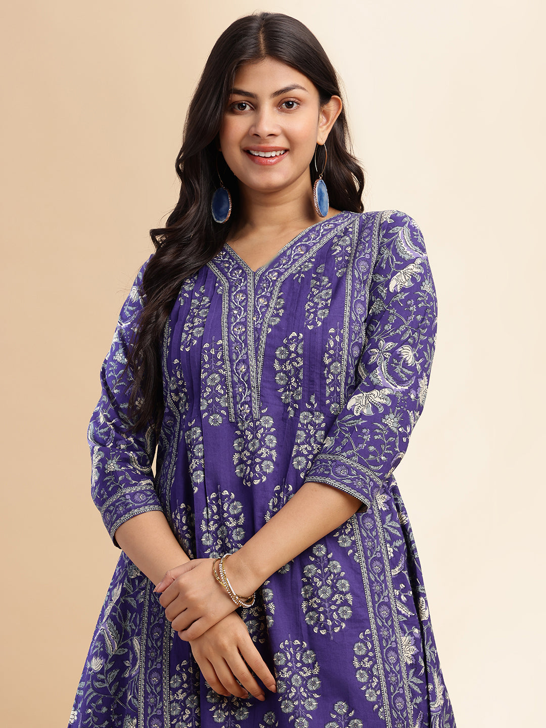 Blue Floral Print A-Line Cotton Stitched Kurta Set