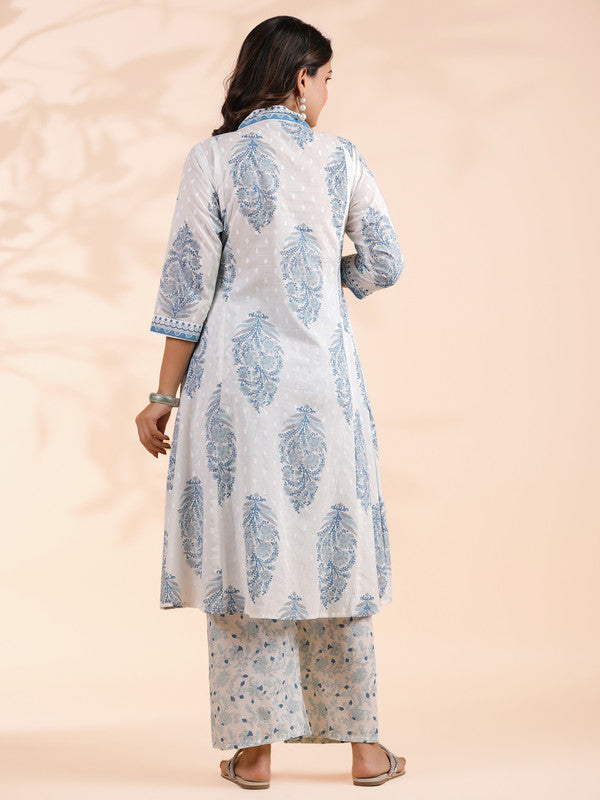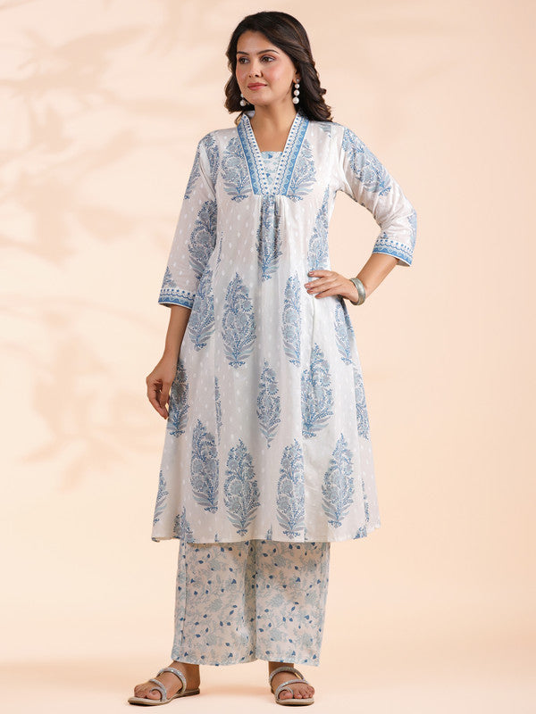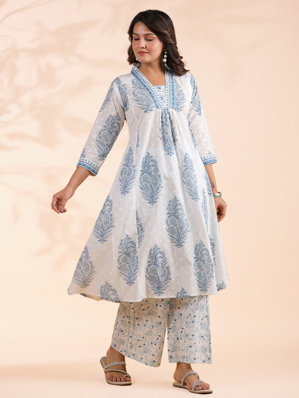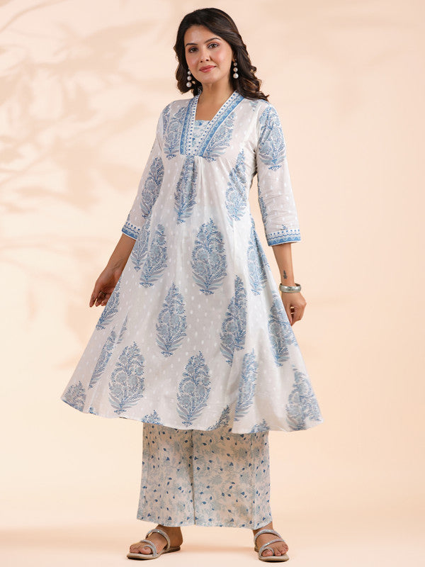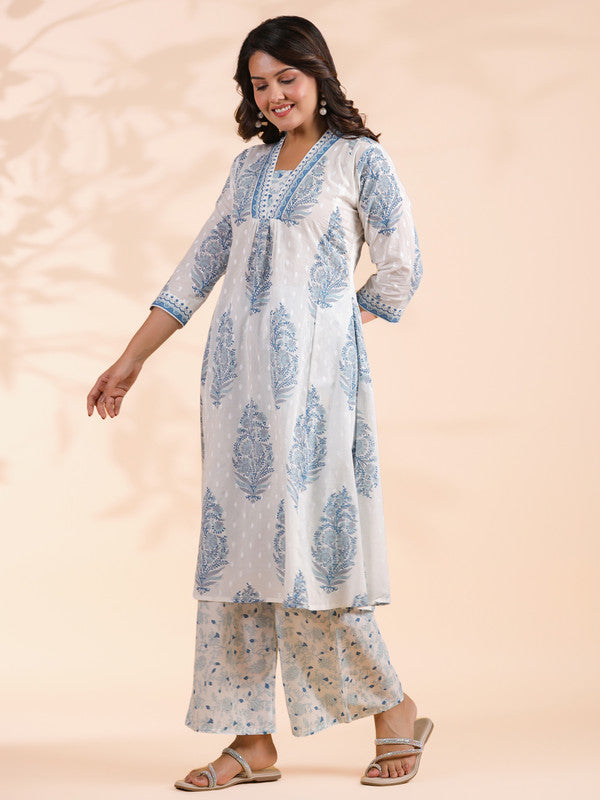 Blue Floral Print A-Line Cotton Stitched Kurta With Palazzo