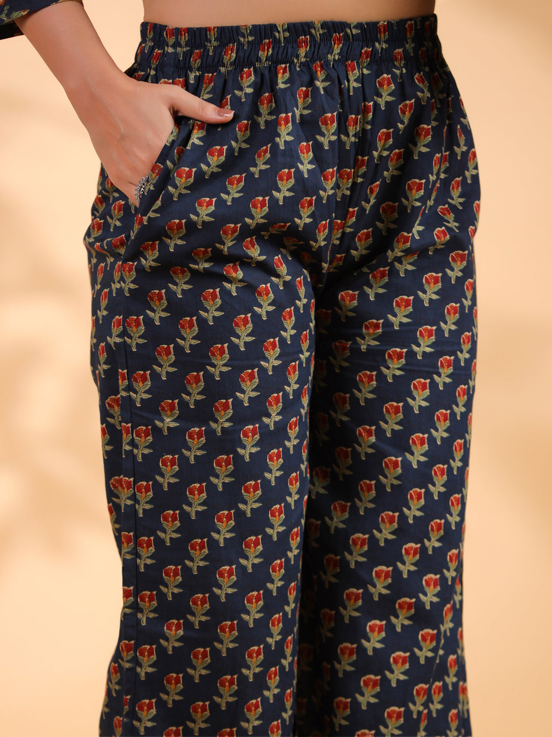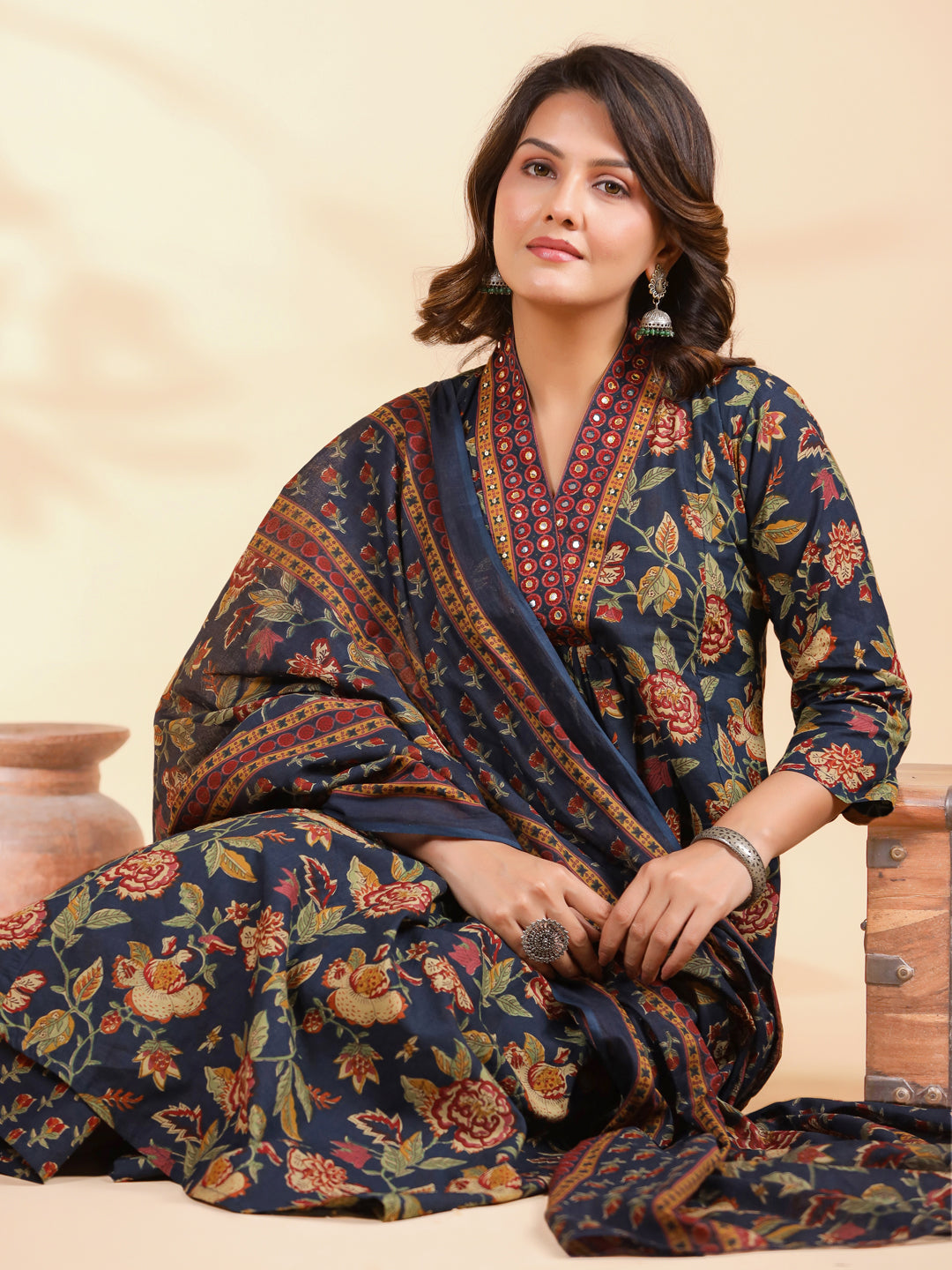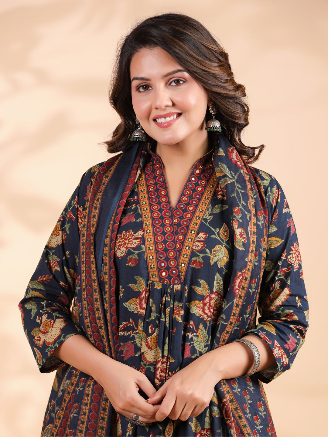 Blue Floral Print Alia Cut Cotton Stitched Kurta Set