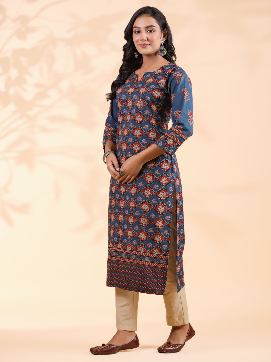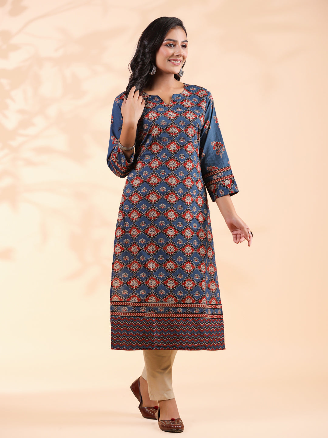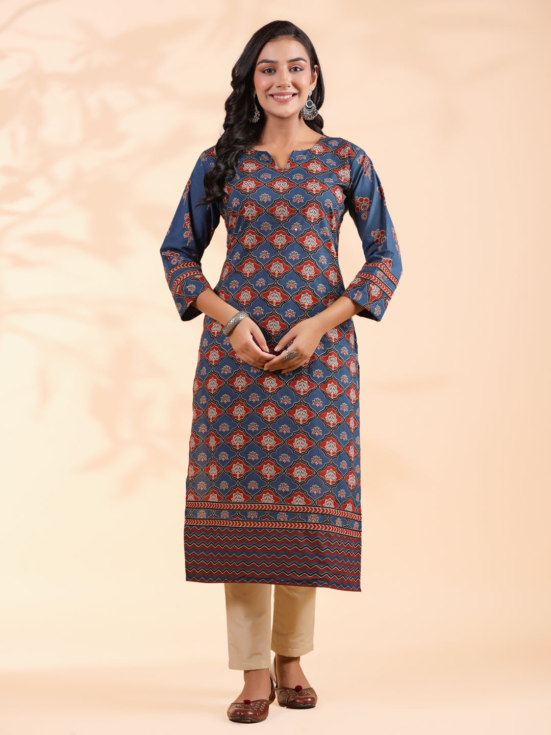 Introducing our Blue Floral Print Straight Cotton Stitched Kurta! With its unique floral print and comfortable cotton fabric, this kurta is perfect for any occasion. Stand out from the crowd with this stylish and playful piece. (Flaunt your fashion sense in this quirky and comfortable Blue Floral Print Kurta!)