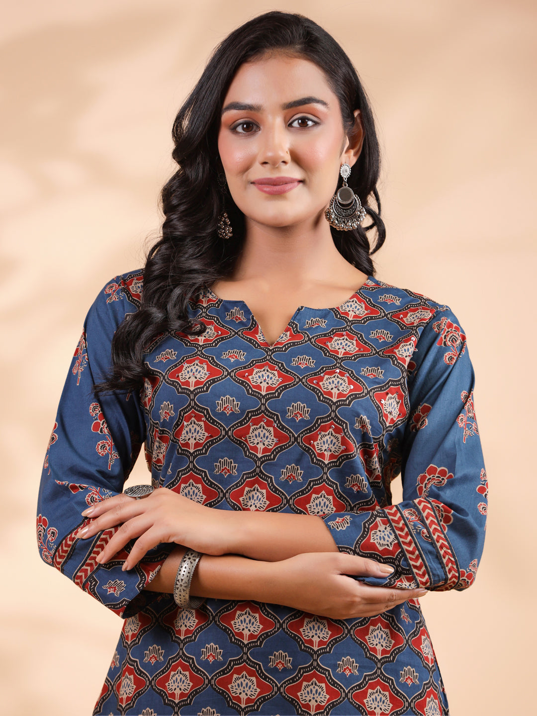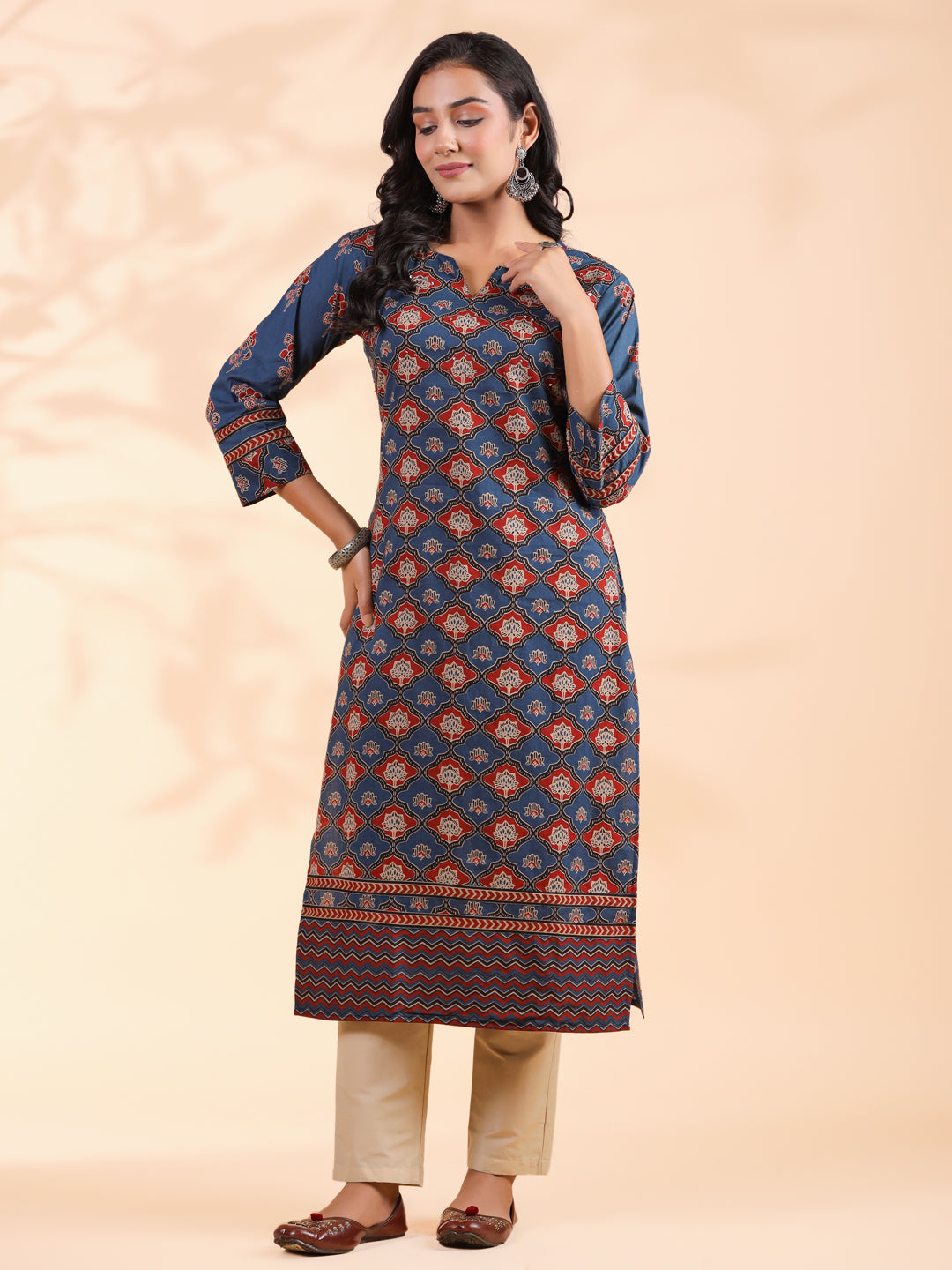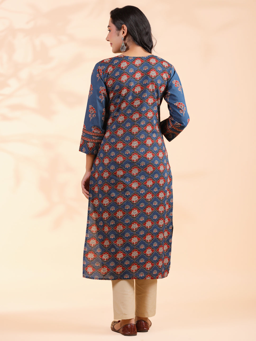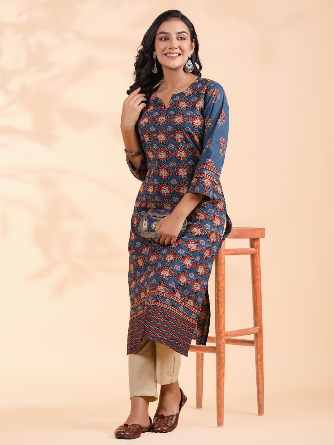 Introducing our Blue Floral Print Straight Cotton Stitched Kurta! With its unique floral print and comfortable cotton fabric, this kurta is perfect for any occasion. Stand out from the crowd with this stylish and playful piece. (Flaunt your fashion sense in this quirky and comfortable Blue Floral Print Kurta!)