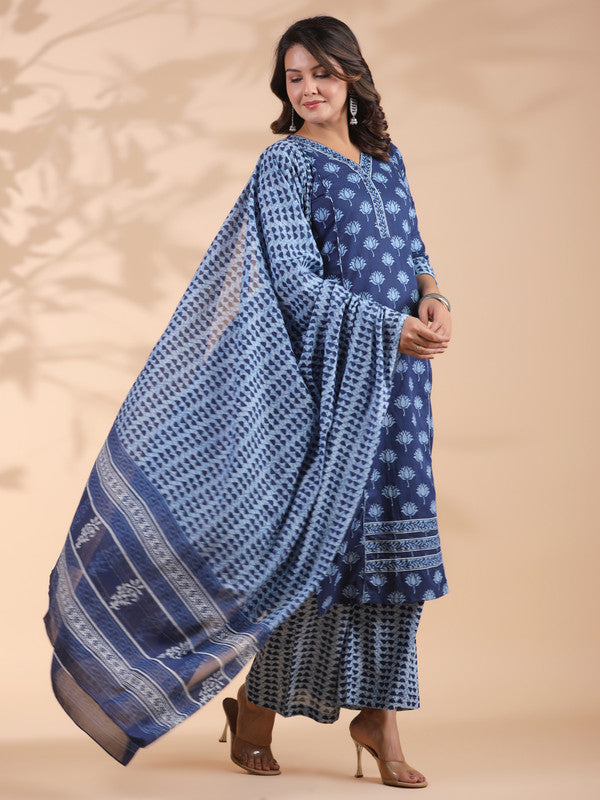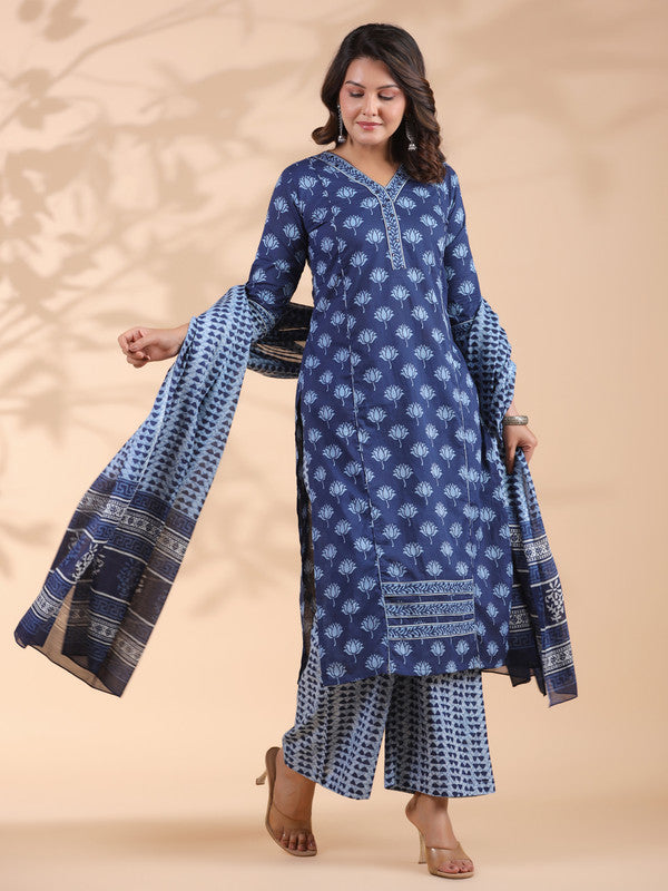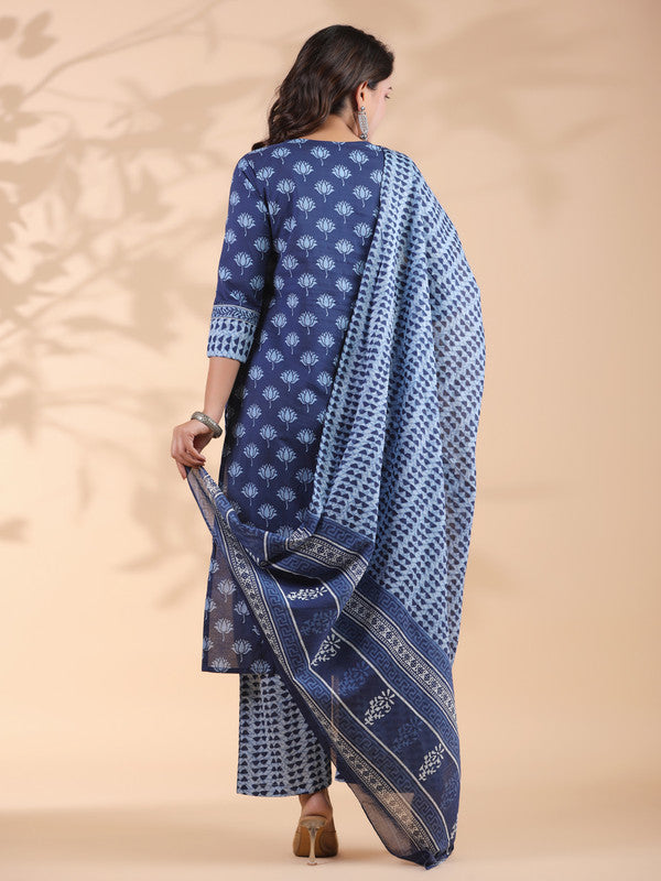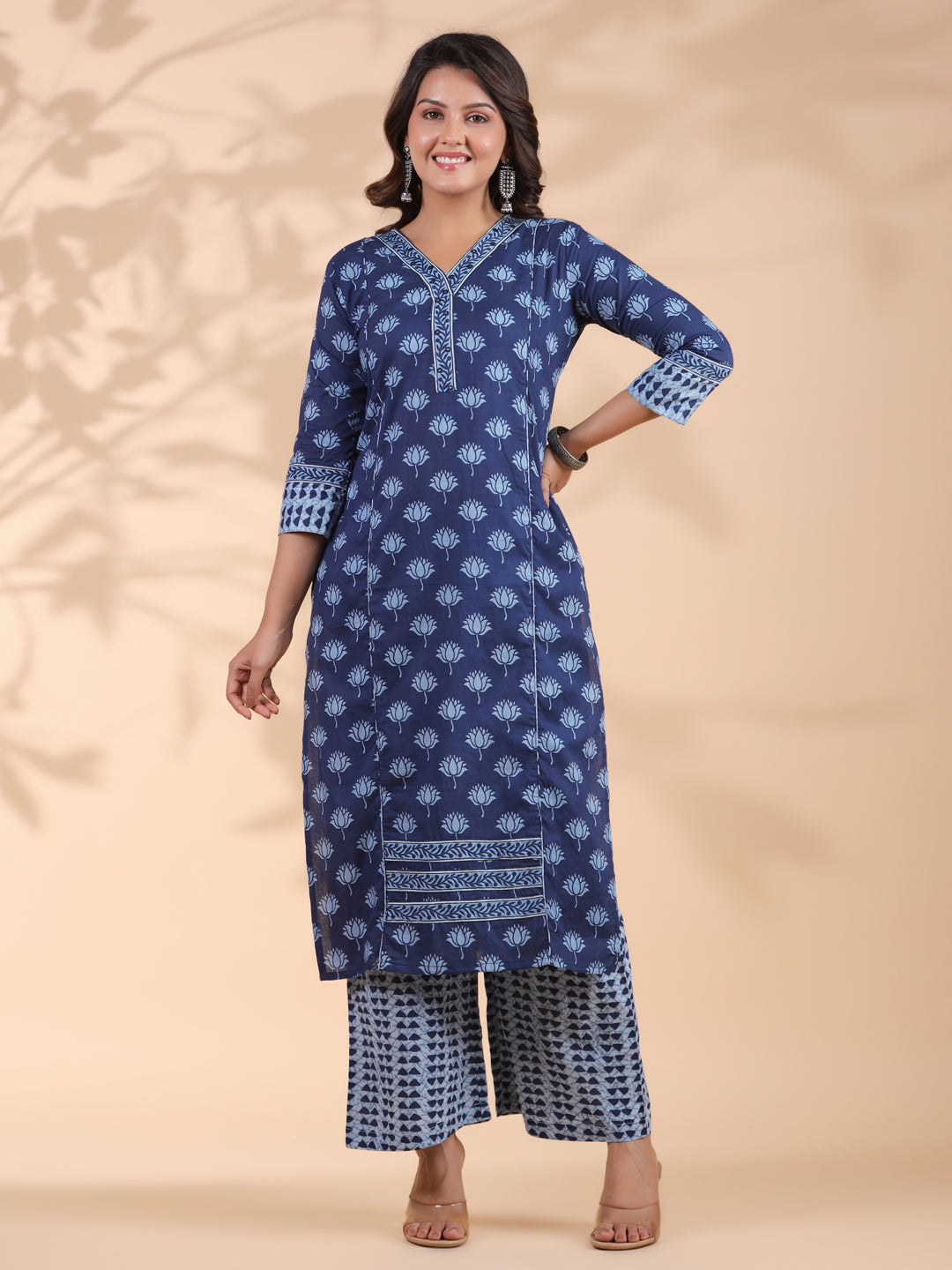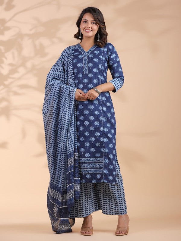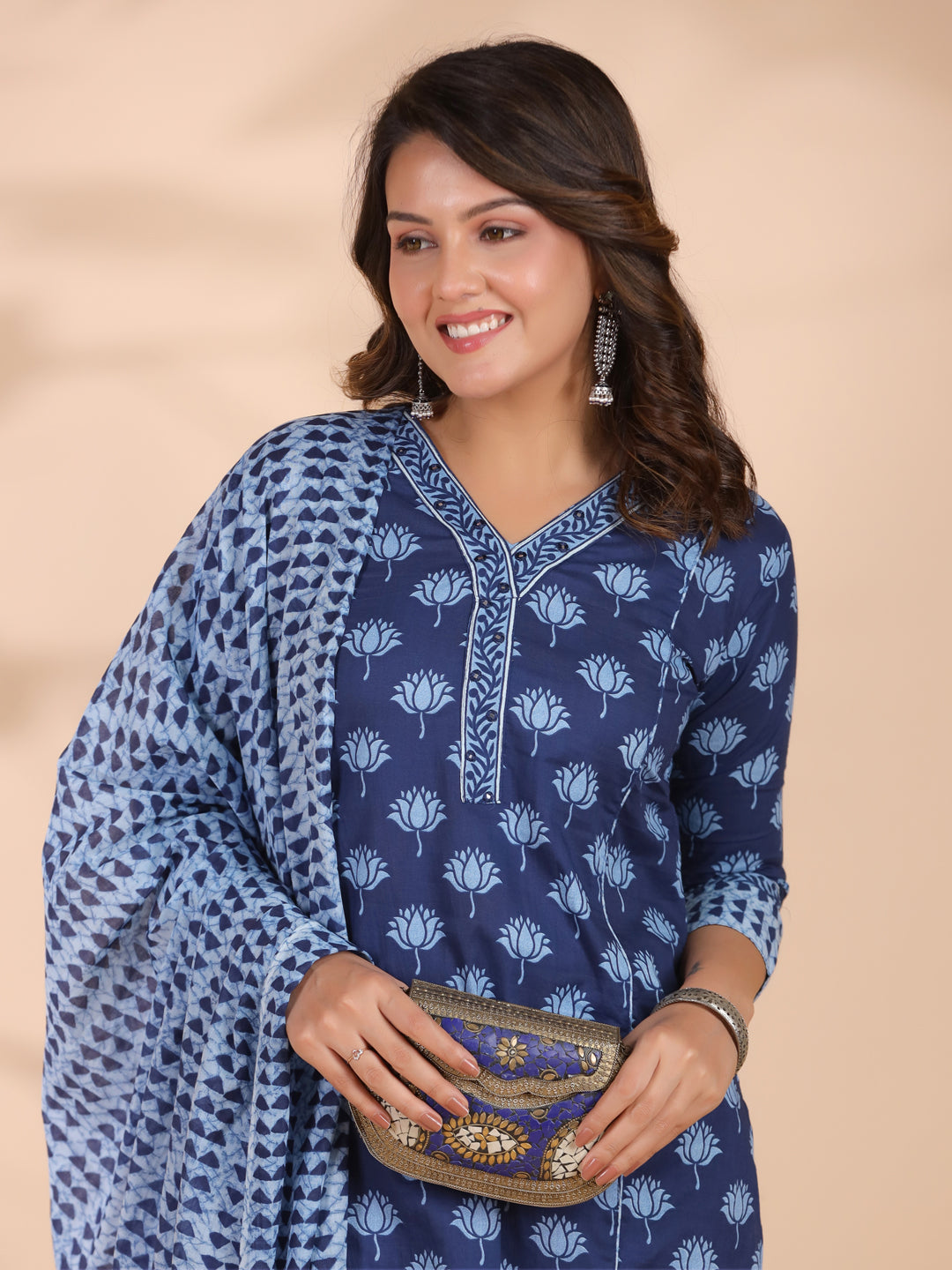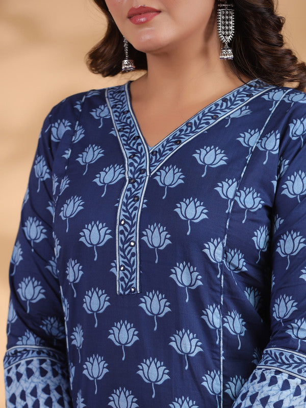 Blue Floral Print With Mirror Work Straight Cotton Stitched Kurta Set