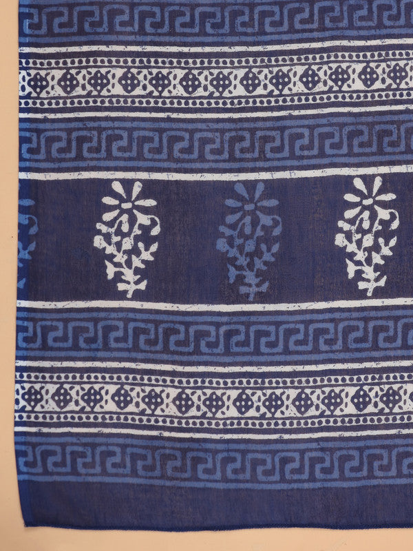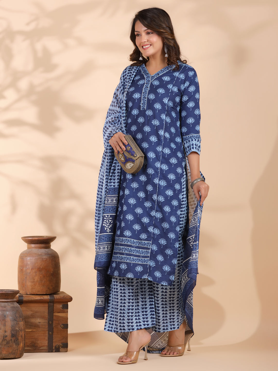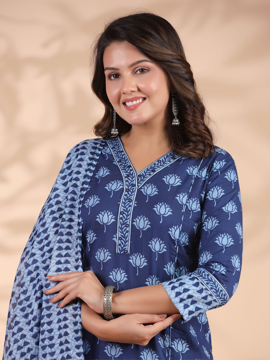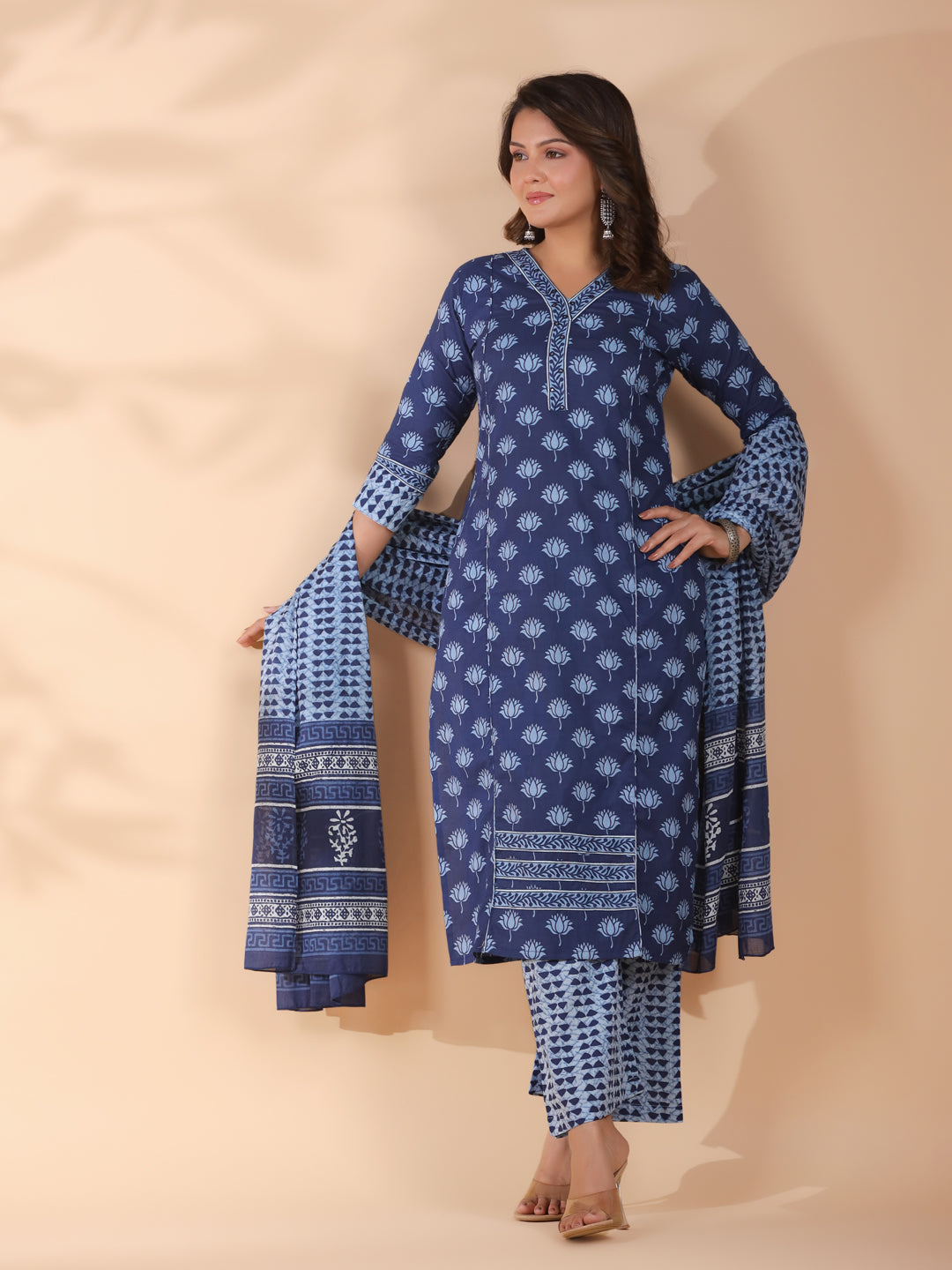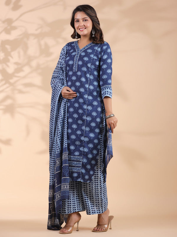Blue Floral Print With Mirror Work Straight Cotton Stitched Kurta Set