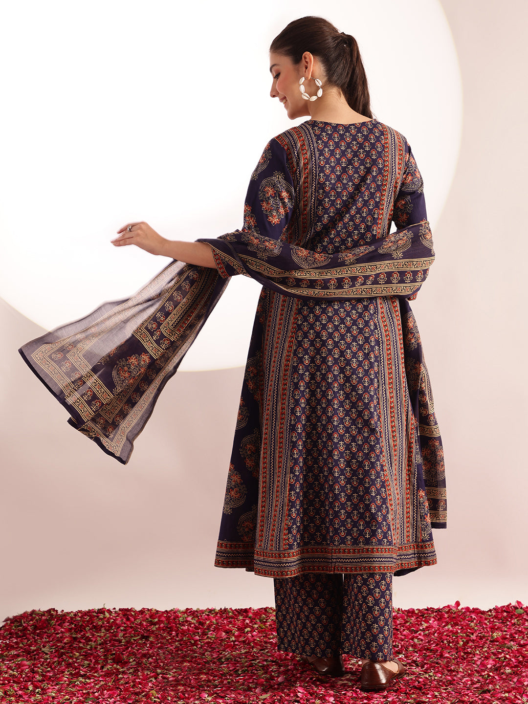 This blue floral printed A-line cotton kurta paired with matching palazzo and dupatta offers a blend of comfort and elegance. Crafted from breathable cotton, it ensures all-day comfort while the floral print adds a timeless charm. The A-line silhouette flatters various body types, and the coordinated palazzo enhances ease of movement. Complete with a complementary dupatta, this set is ideal for both casual and semi-formal occasions, balancing style with practicality effortlessly.