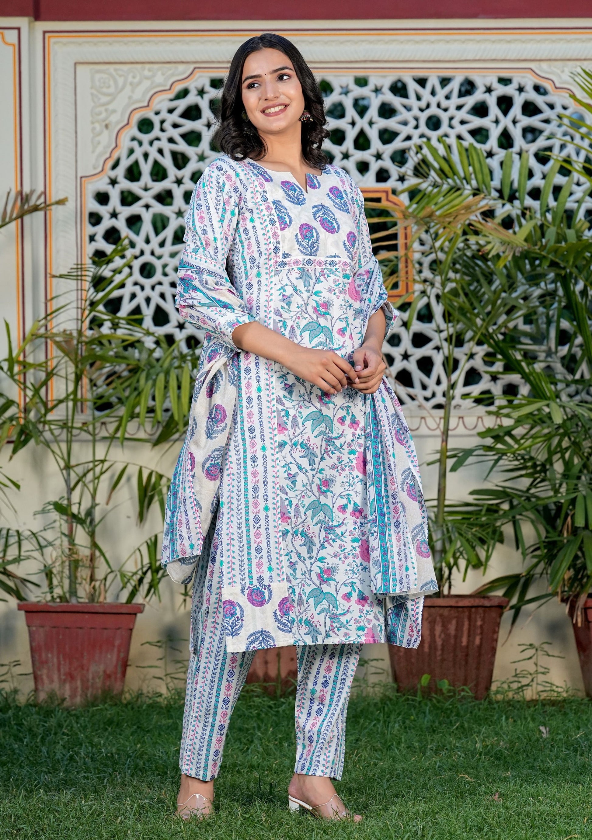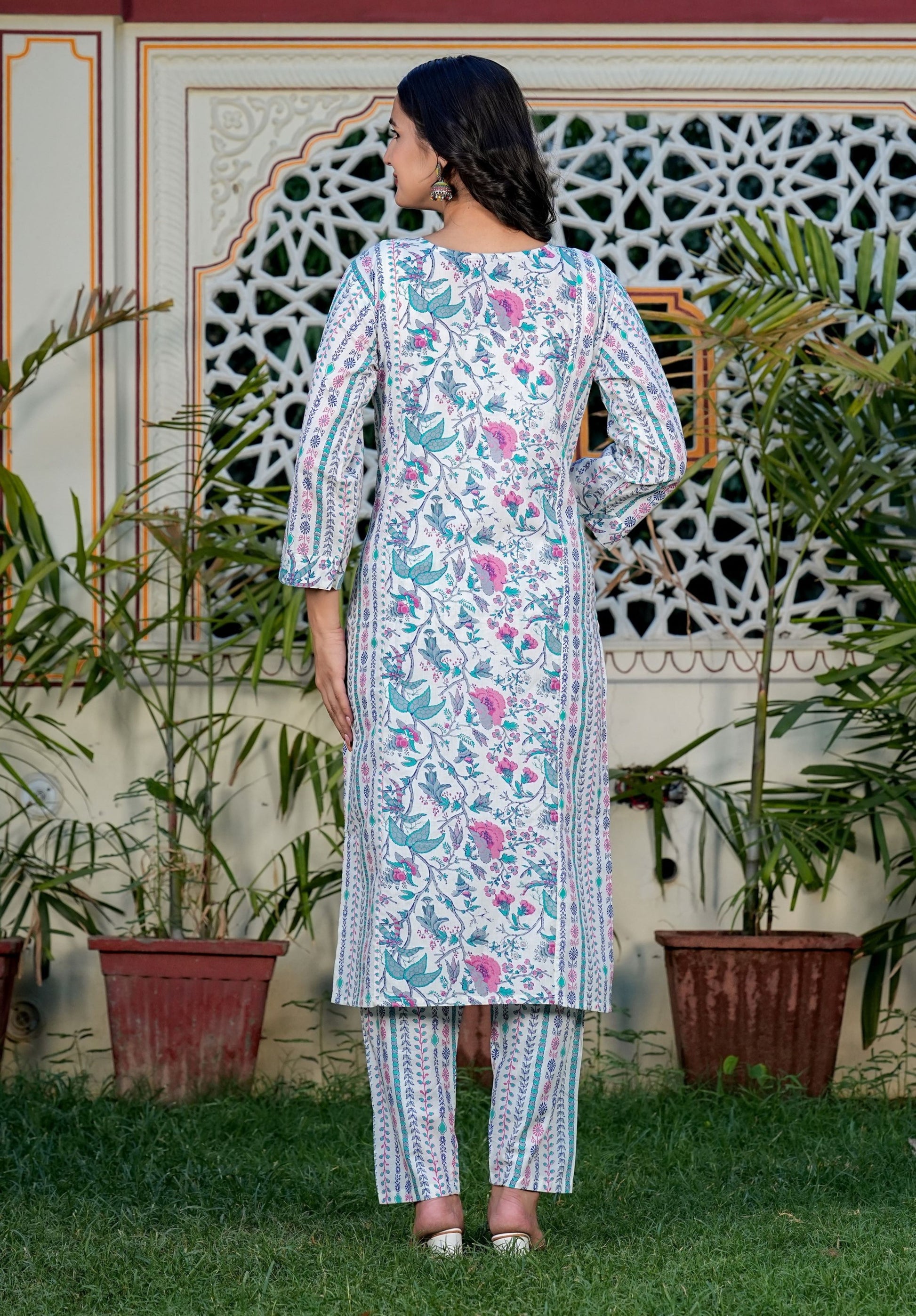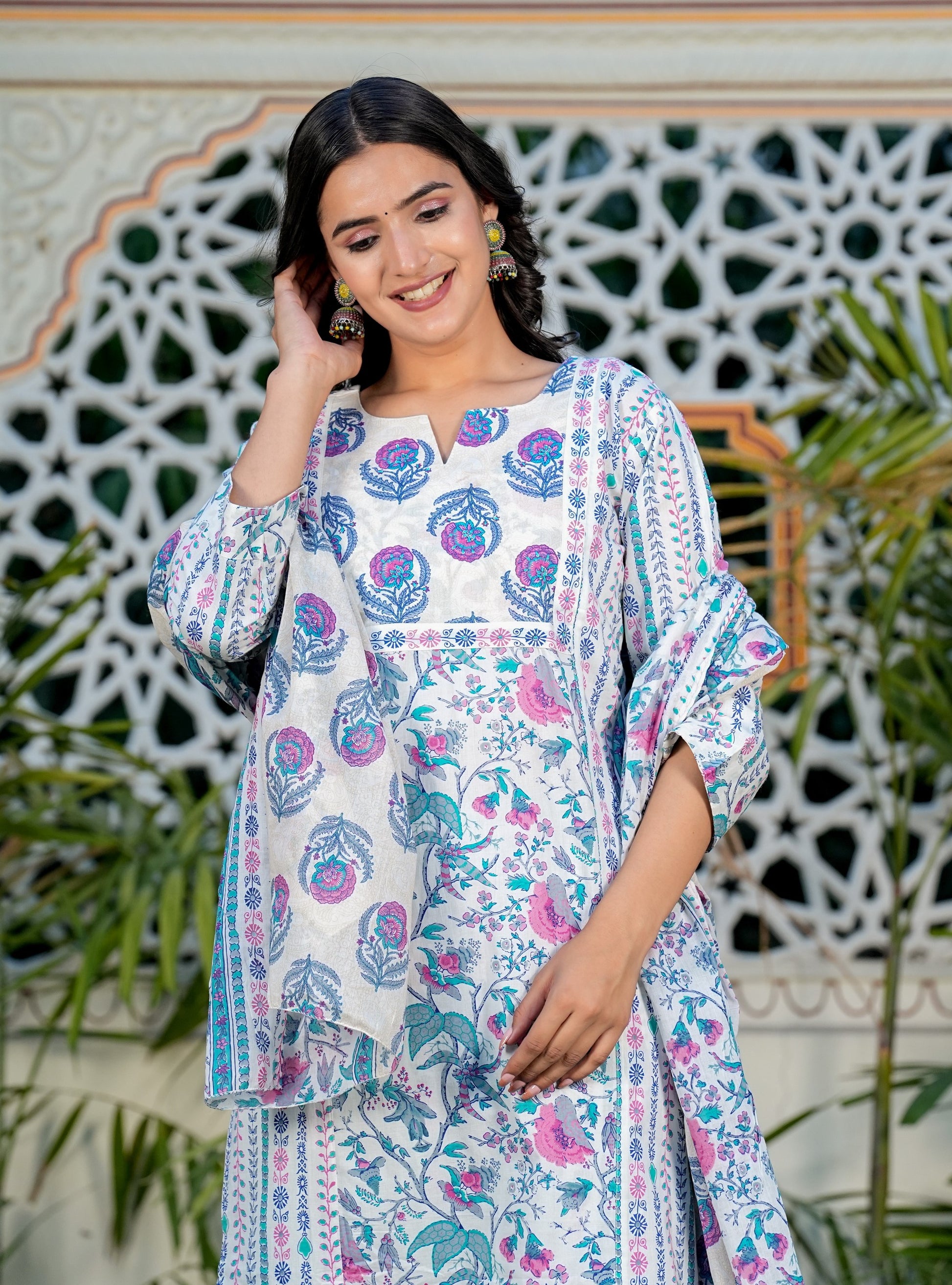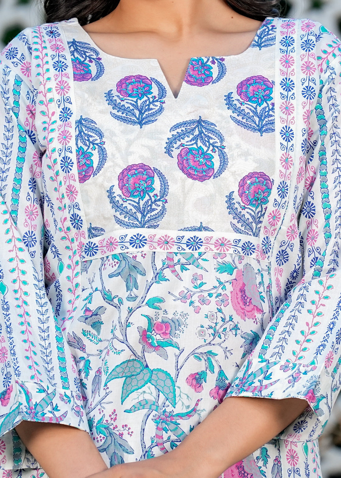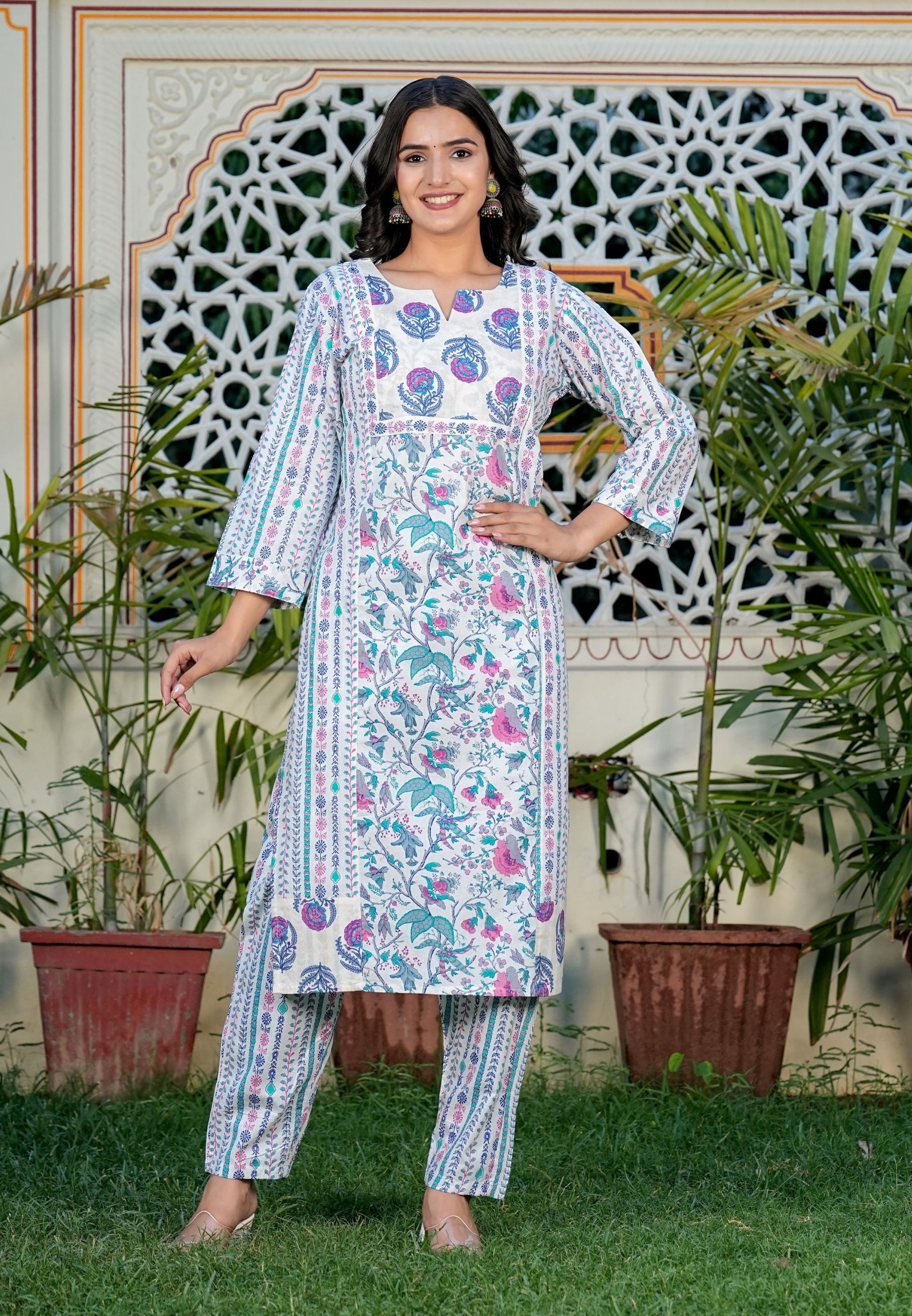 Get ready to bloom in this Blue Floral Printed Straight Cotton Kurta Set! Made with lightweight cotton, this set features a playful print and a comfortable, straight fit. Perfect for a day out or a casual event, this kurta set will keep you looking and feeling your best.