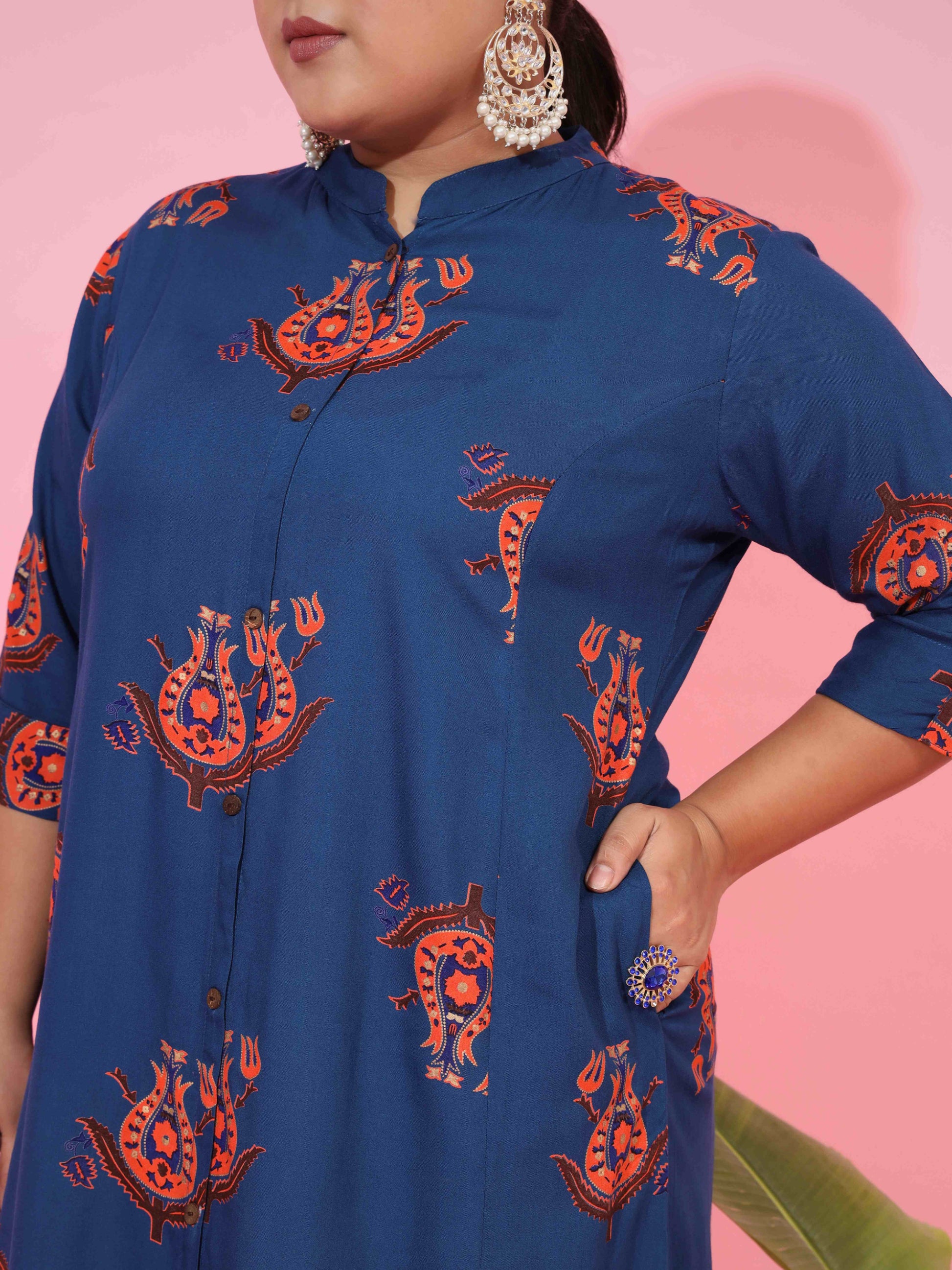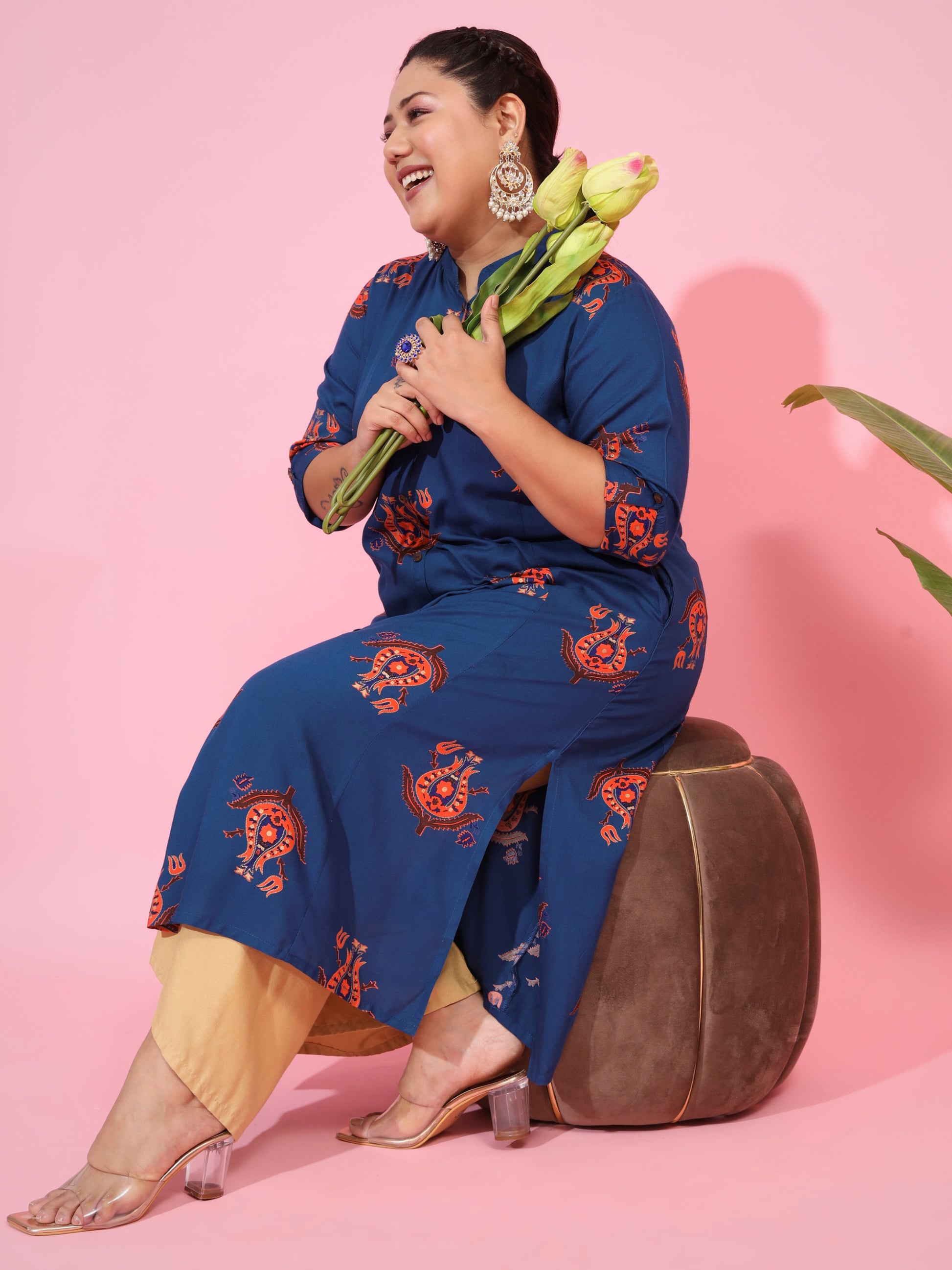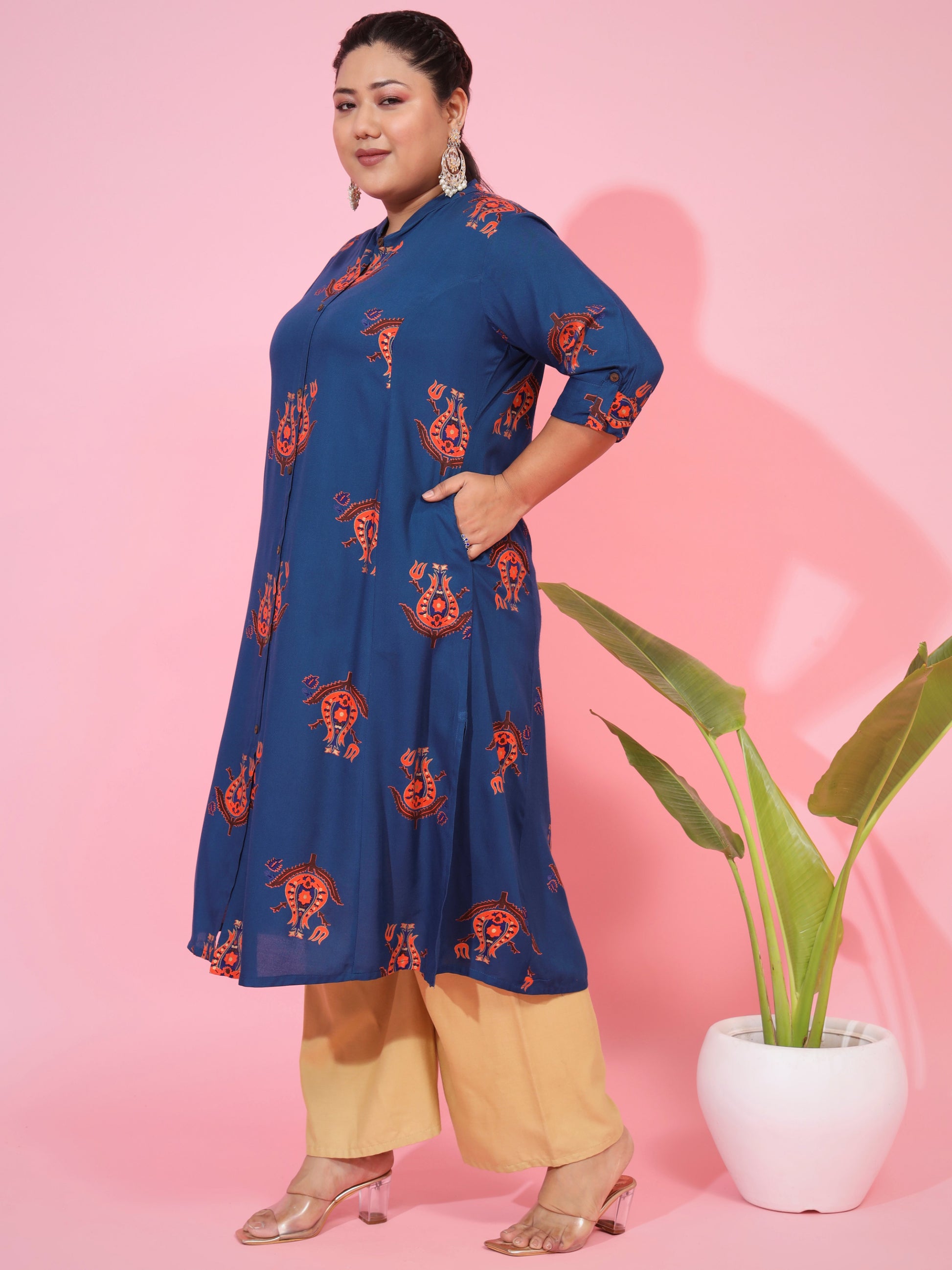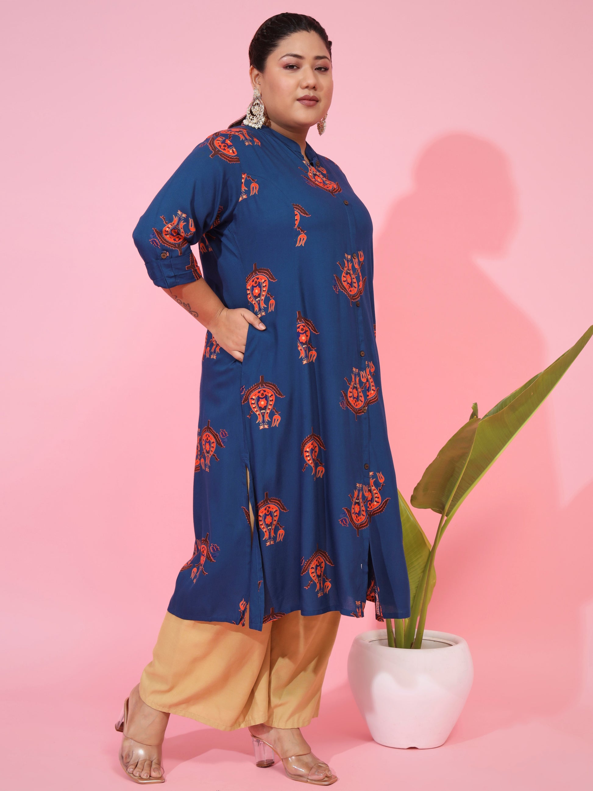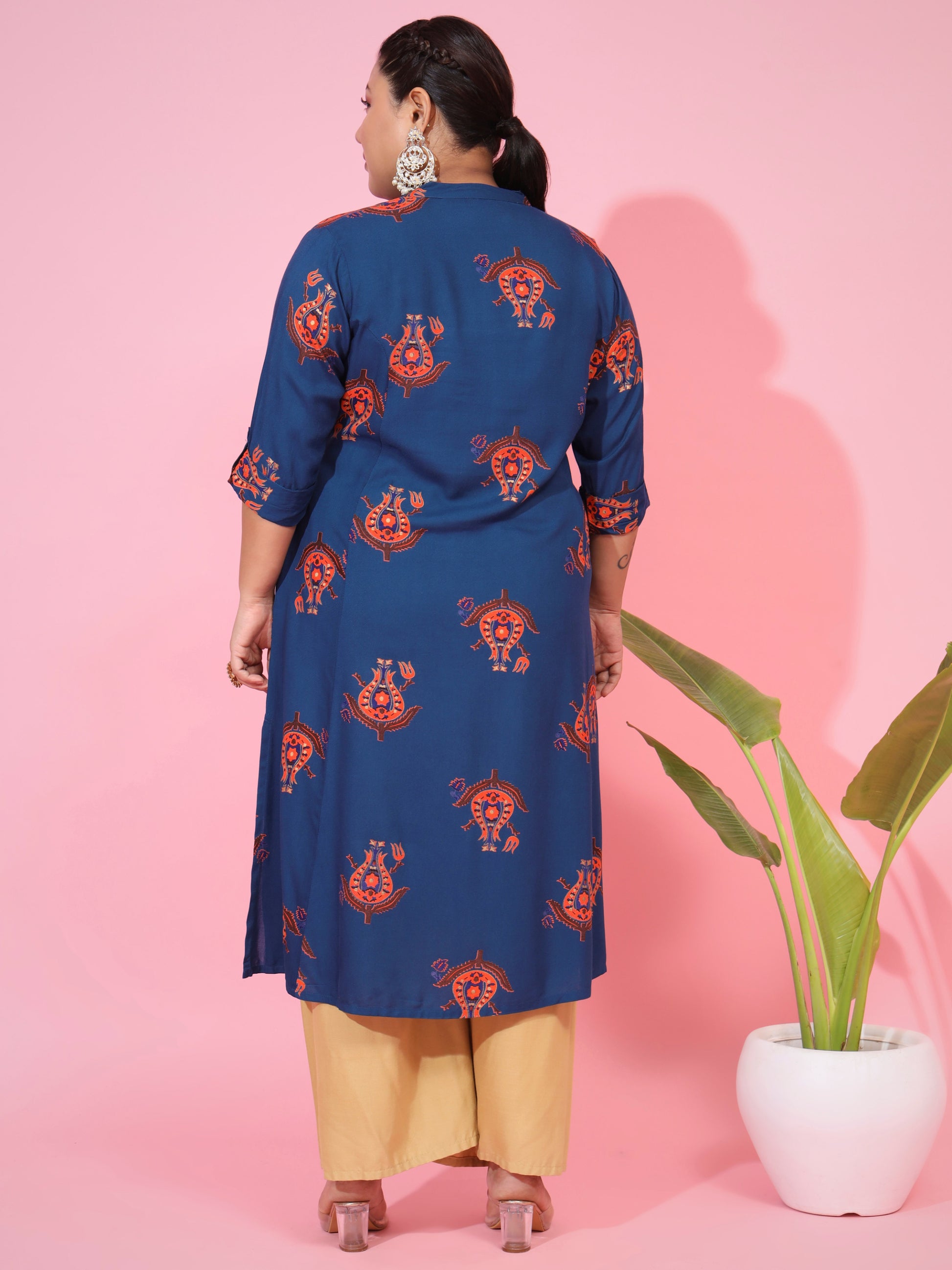 Look fashionable and chic with this stylish Vbuyz Women's Blue Rayon A-Line Kurta. It features a mandarin/chinese neck, 3/4 sleeve, foil printed design, and multiple slits with pockets. Crafted from rayon, it ensures comfort and a perfect party wear look when paired with high heels.