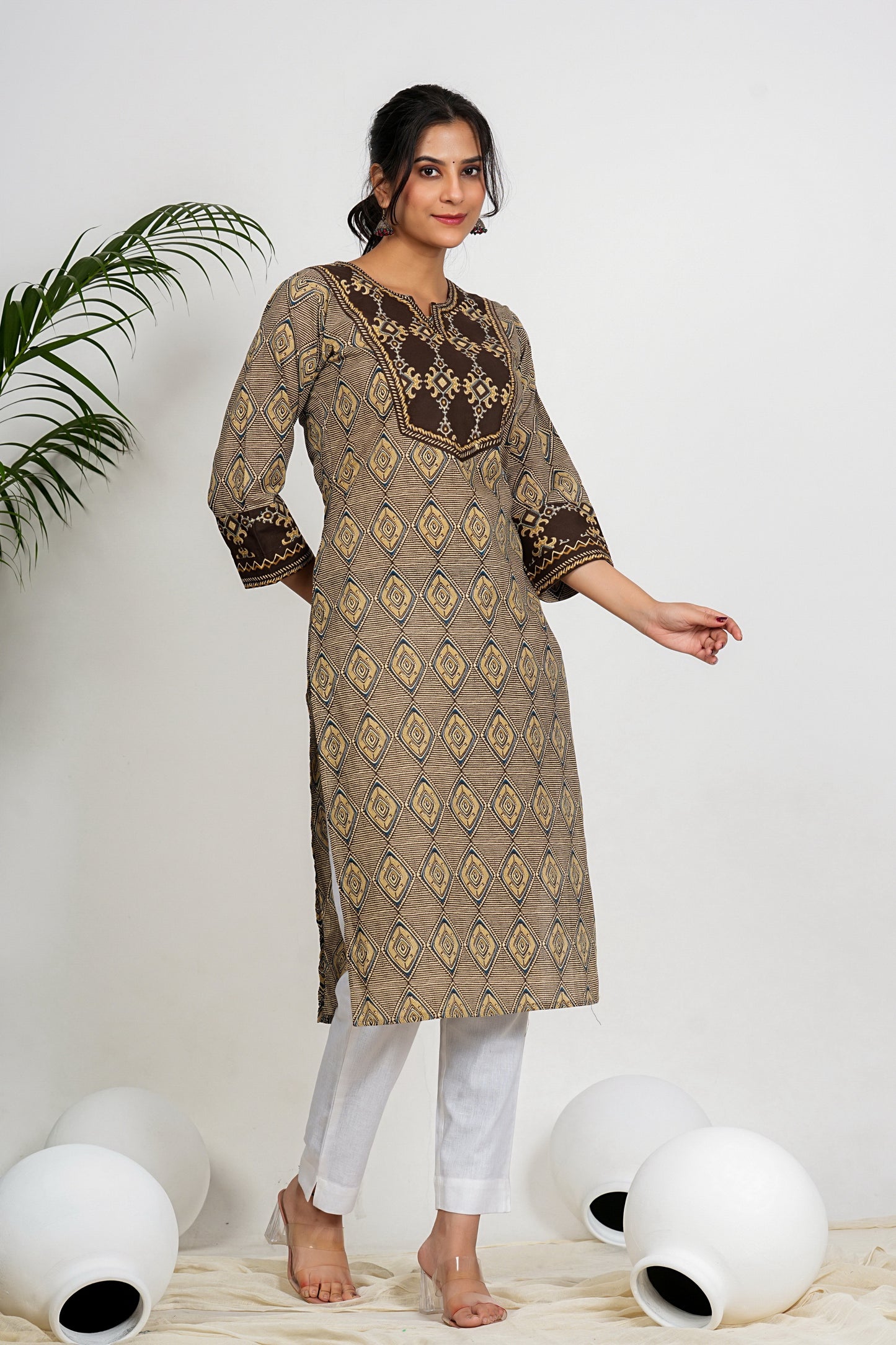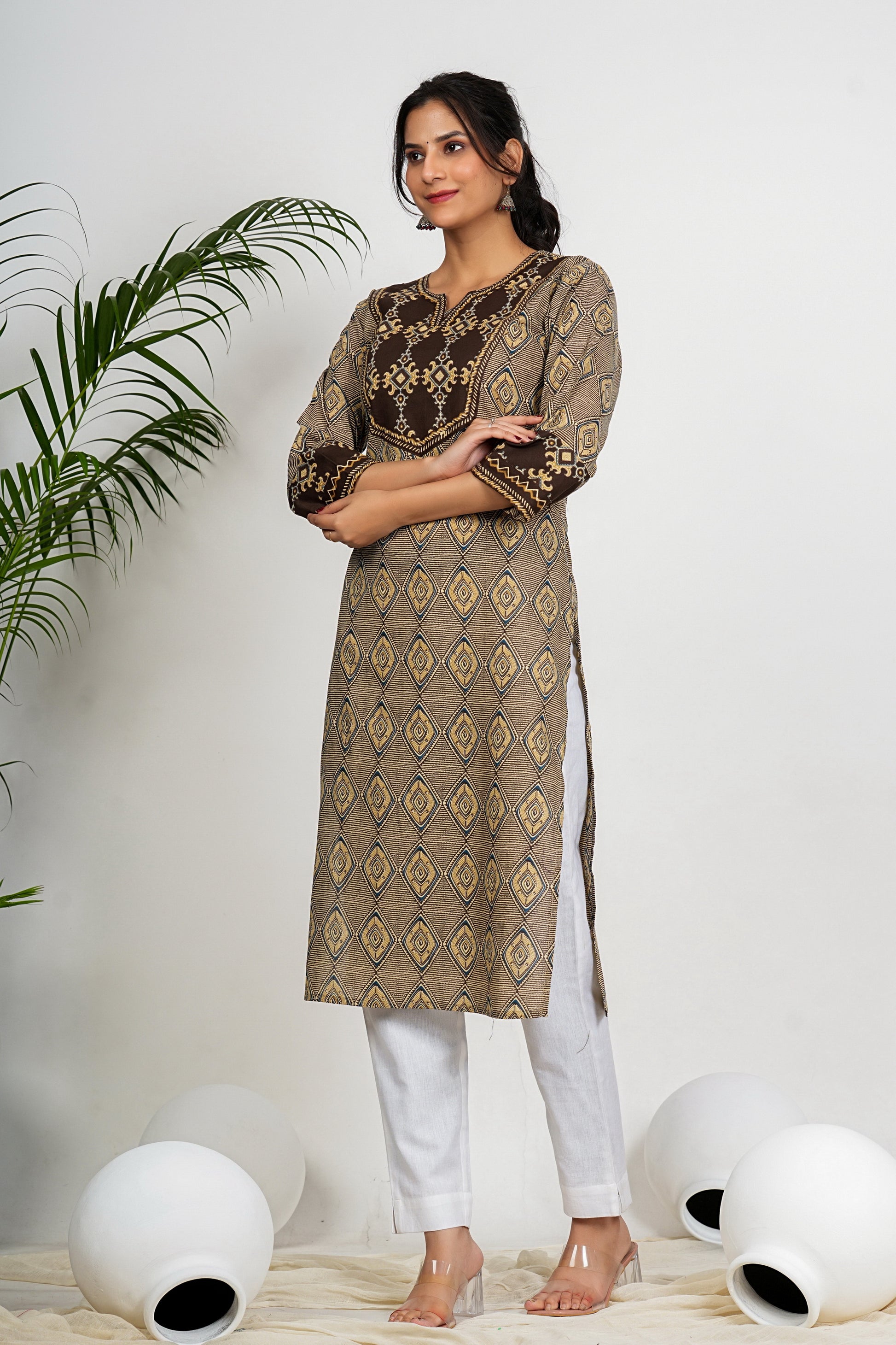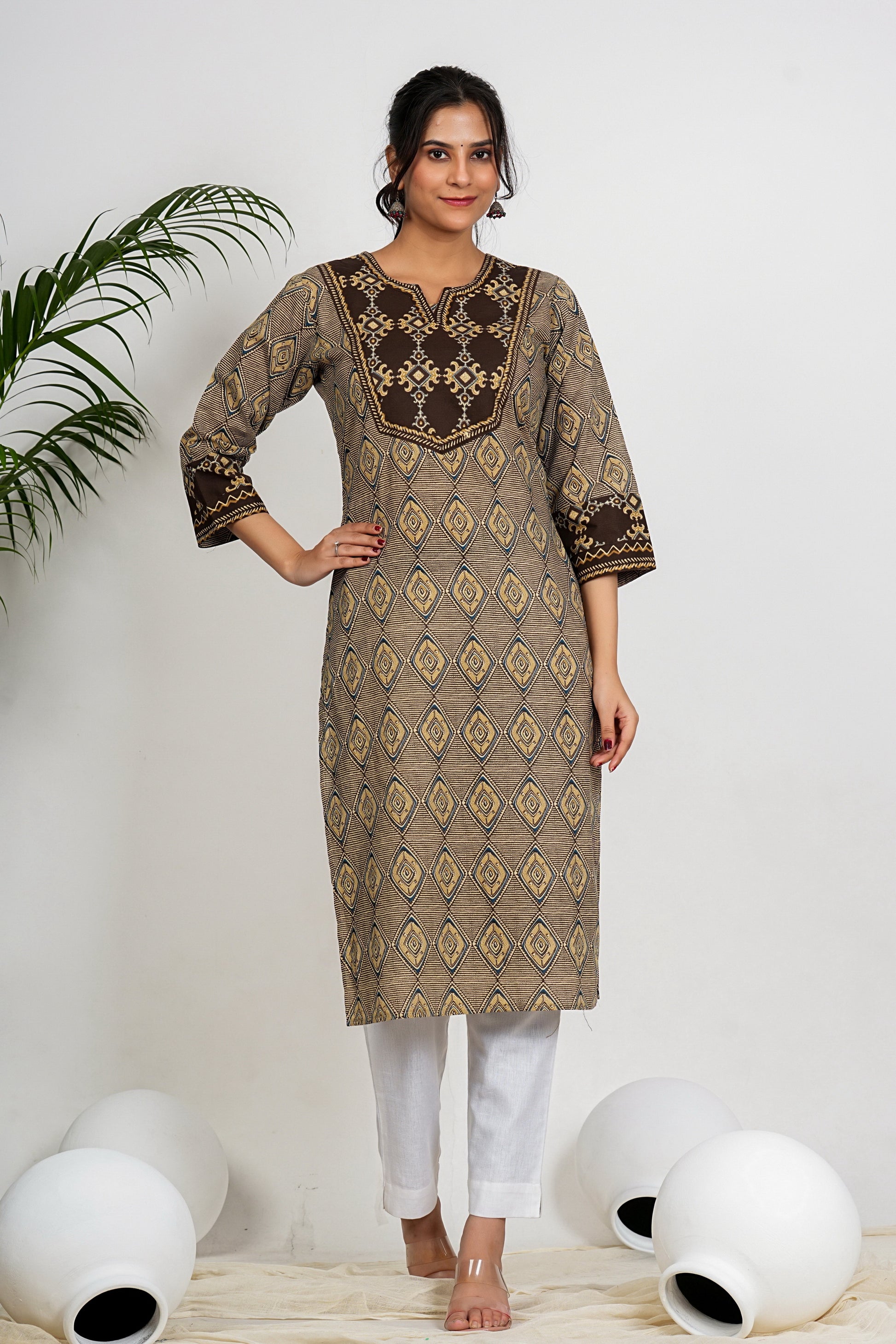 Get ready to add some fun and quirk to your wardrobe with our Brown and Beige Checkered Print Straight Cotton Kurta. Made with soft and comfortable cotton, this kurta features a playful checkered print that will elevate your style. Perfect for any casual occasion, this kurta is sure to make a statement!