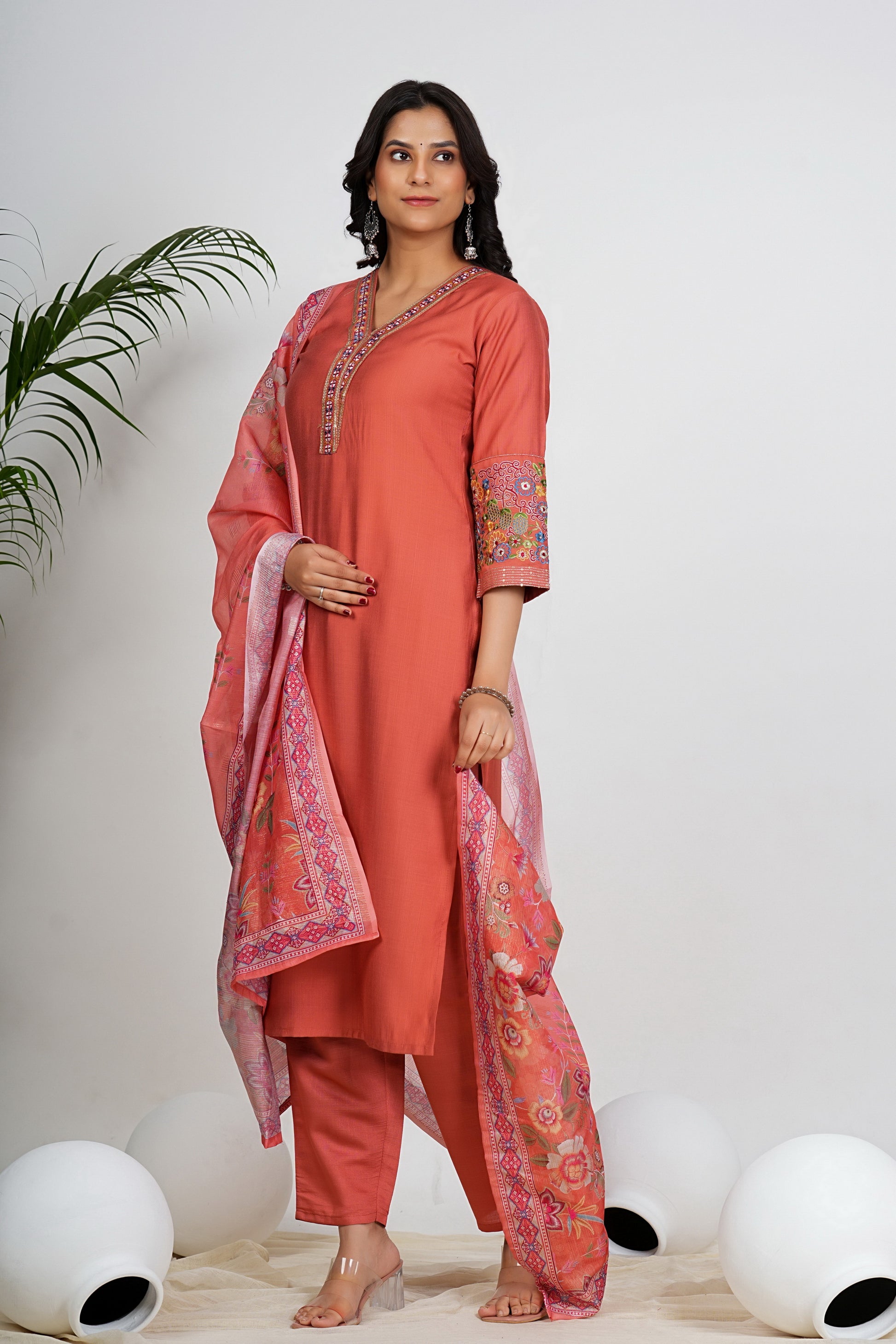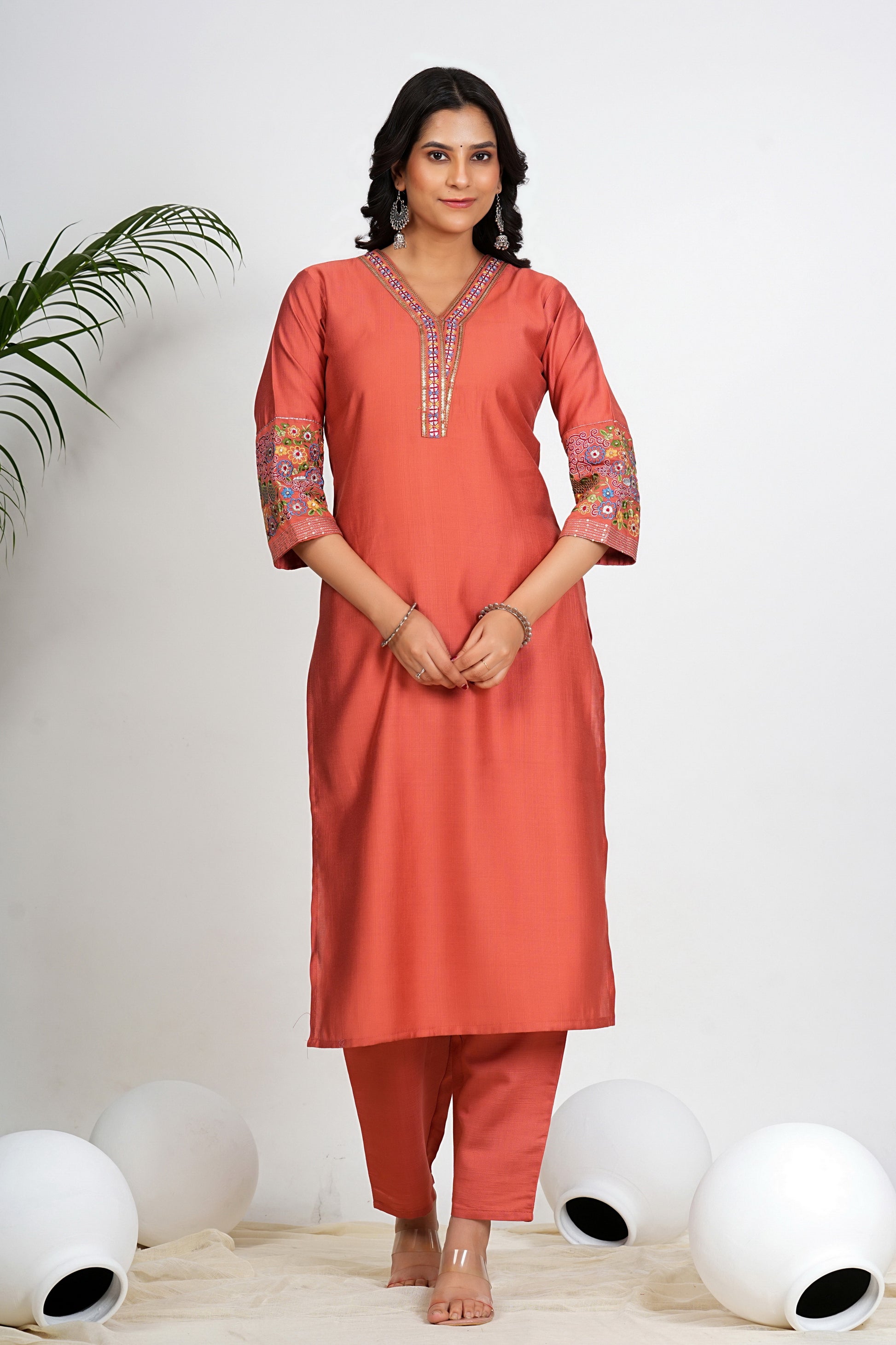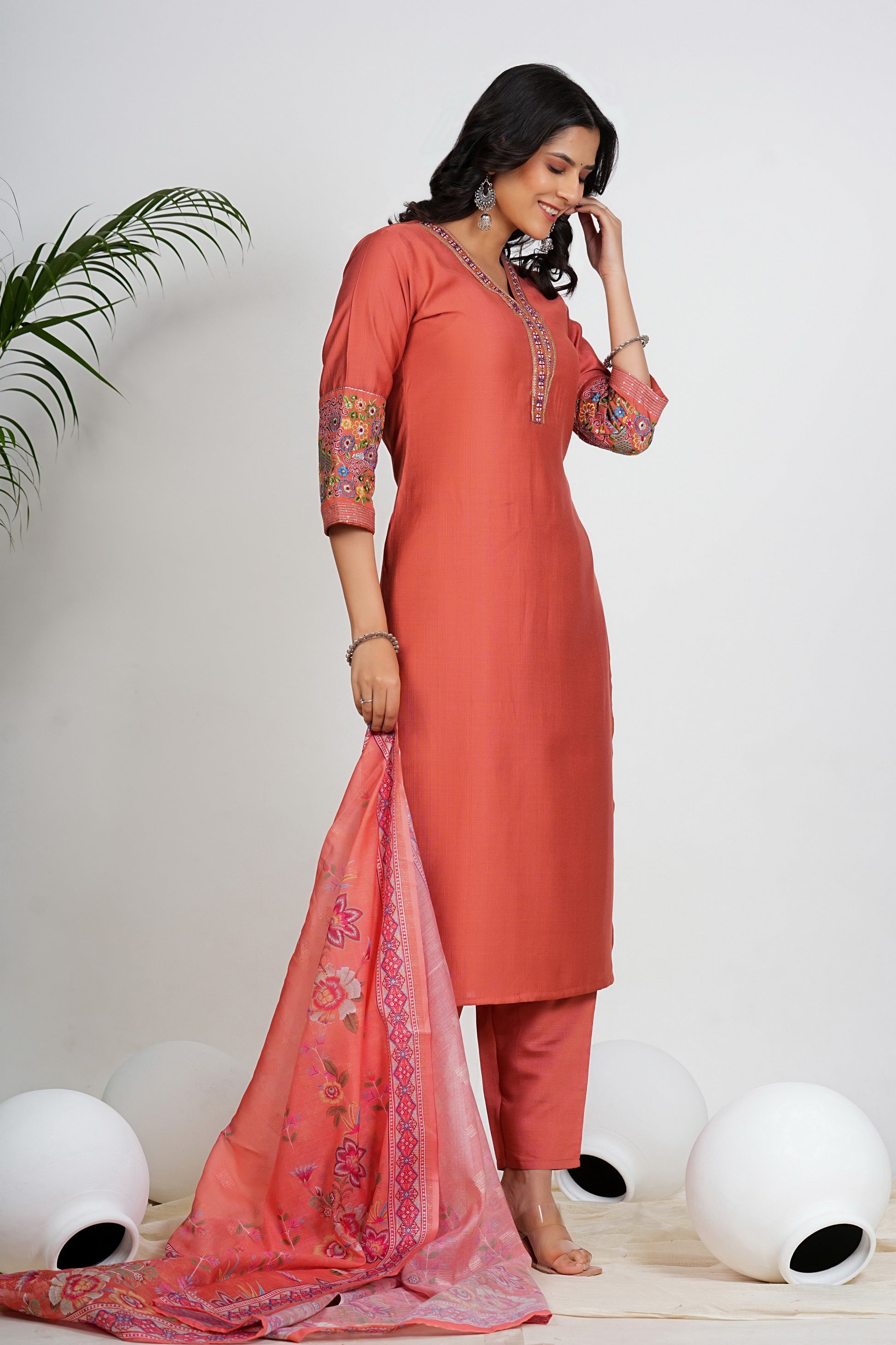 Coral Pink Solid With Embroidery Straight Roman Silk Kurta Set