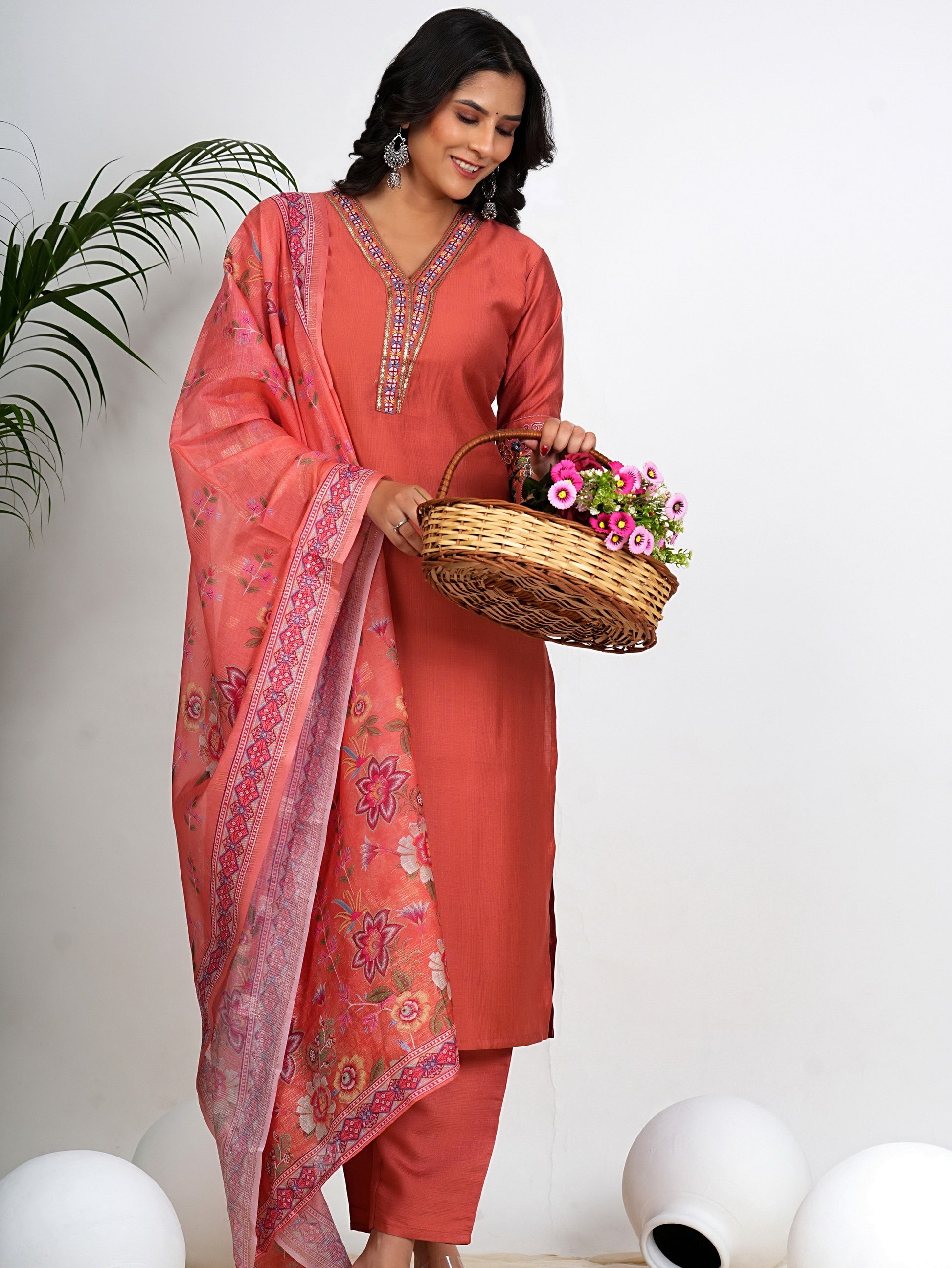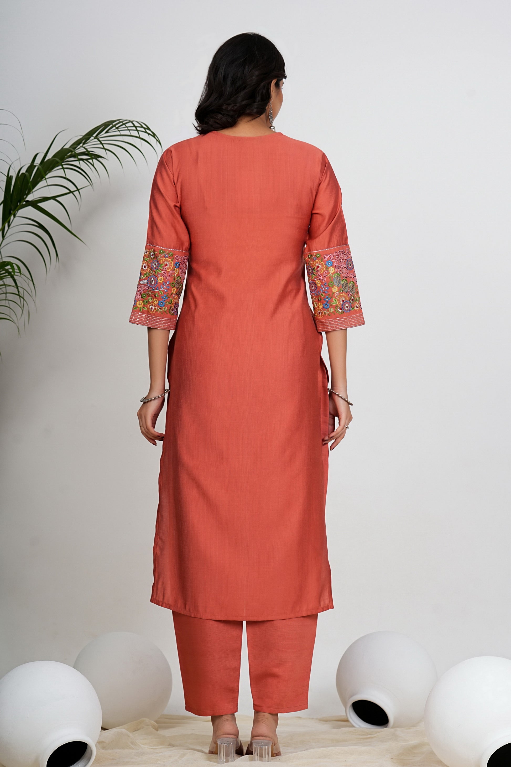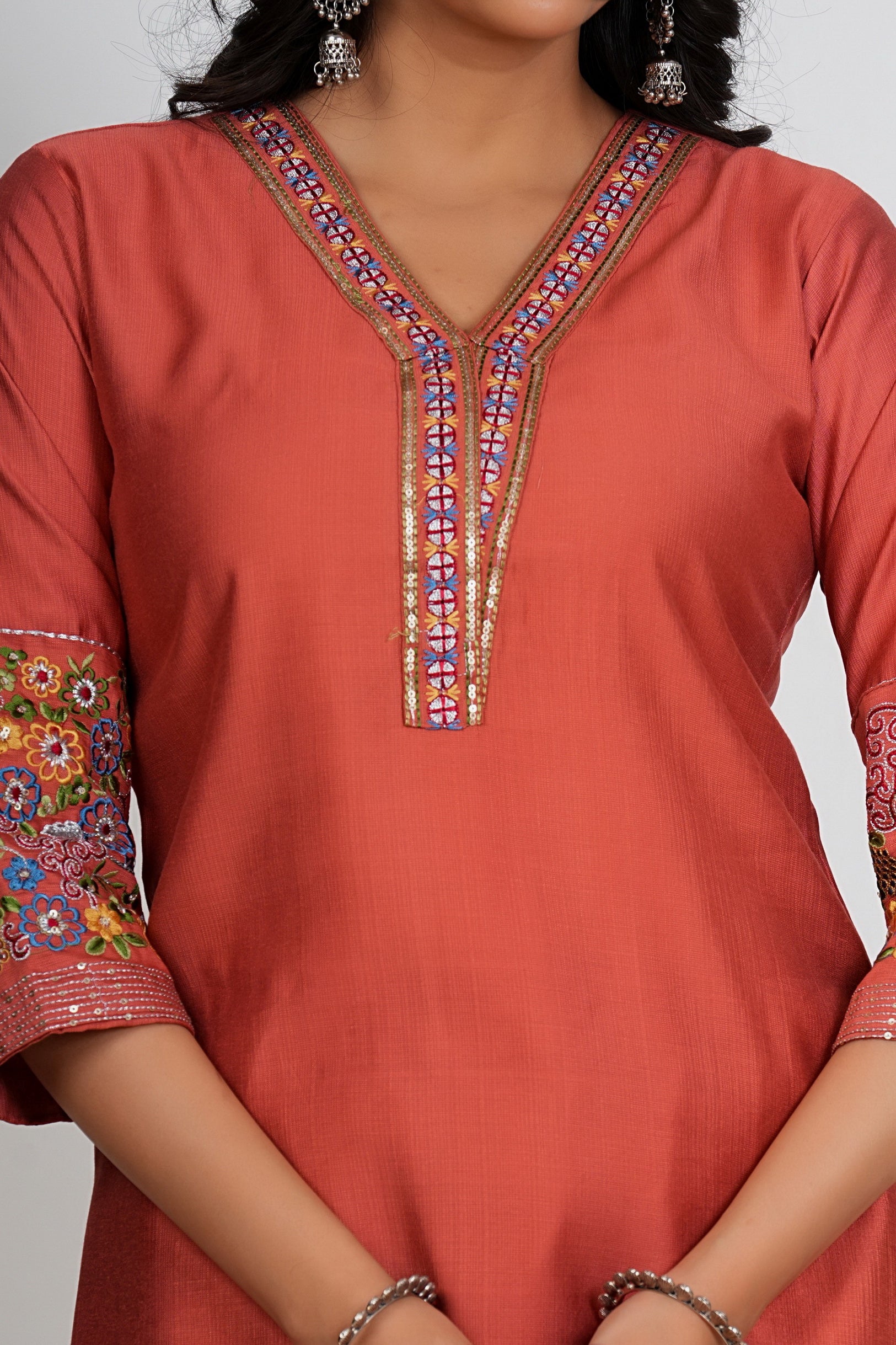 Coral Pink Solid With Embroidery Straight Roman Silk Kurta Set