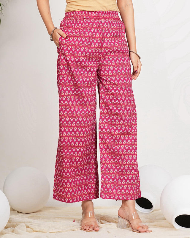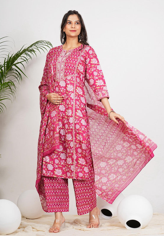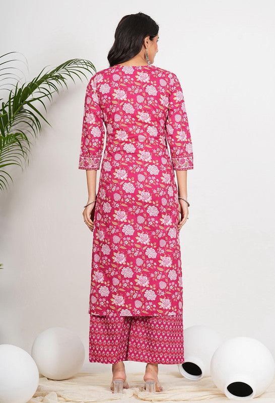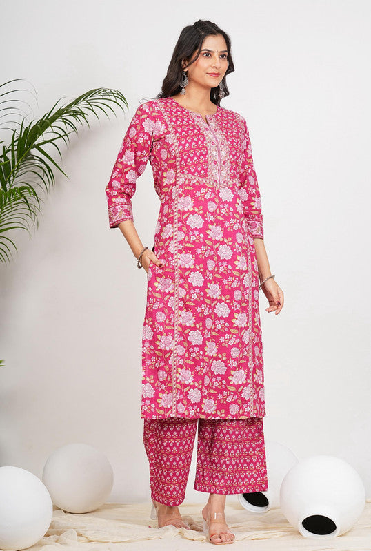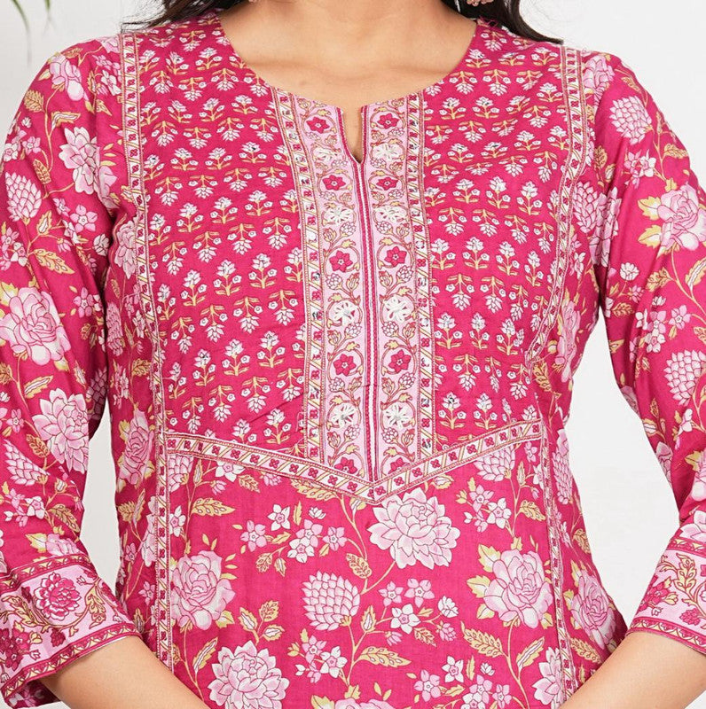 Dark Pink Floral Print Straight Cotton Stitched Kurta Set