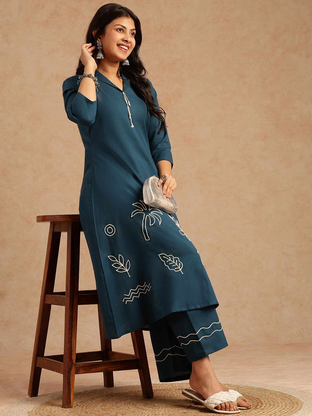Elevate your ethnic wardrobe with this Dark Teal Embroidery A-Line Kurta Set, expertly crafted from breathable khadi cotton. The A-line silhouette offers a flattering fit while ensuring comfort for all-day wear. Intricate embroidery adds a touch of artisanal elegance, making it suitable for both casual and semi-formal occasions. This stitched kurta set blends traditional craftsmanship with modern style, delivering durability and refined sophistication.