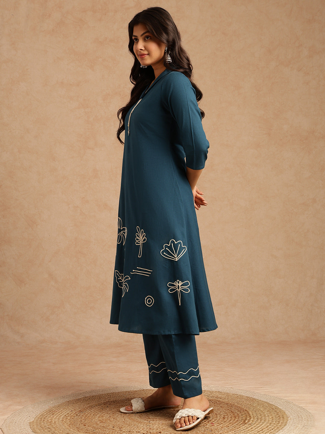 Dark Teal Embroidery A-Line Khadi Cotton Stitched Kurta Set