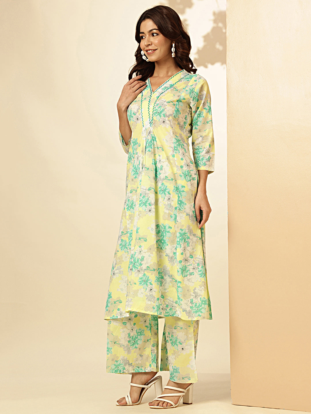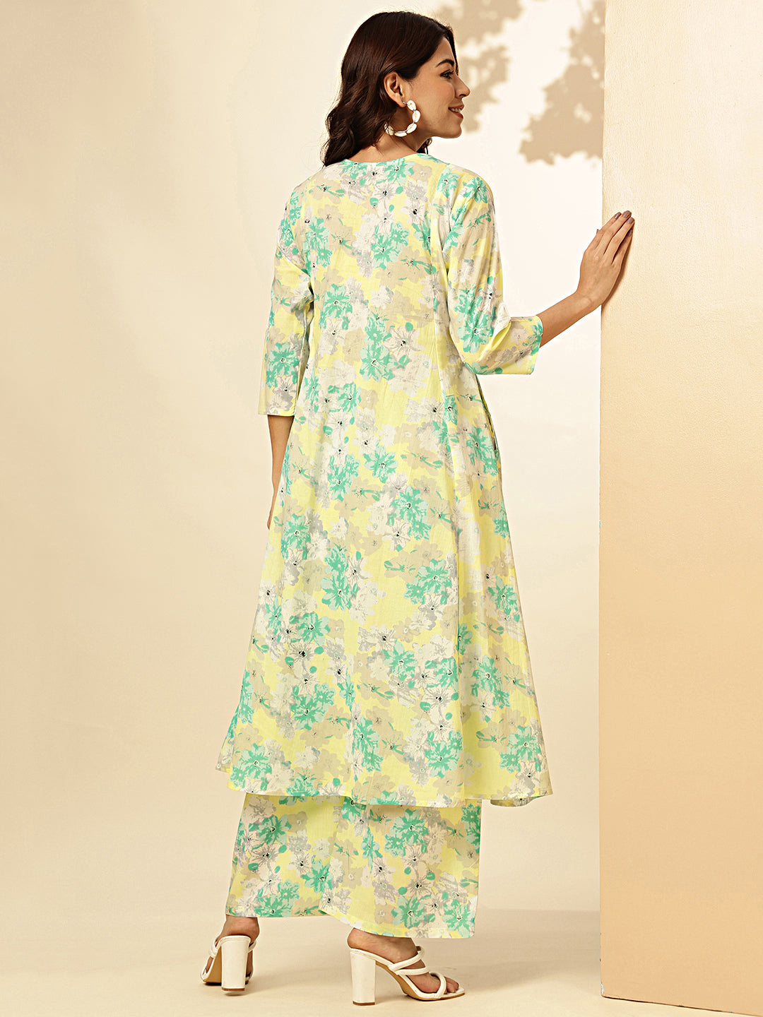 Aqua Blue Floral Printed Fit And Flare Cotton Stitched Kurta With Palazzo
