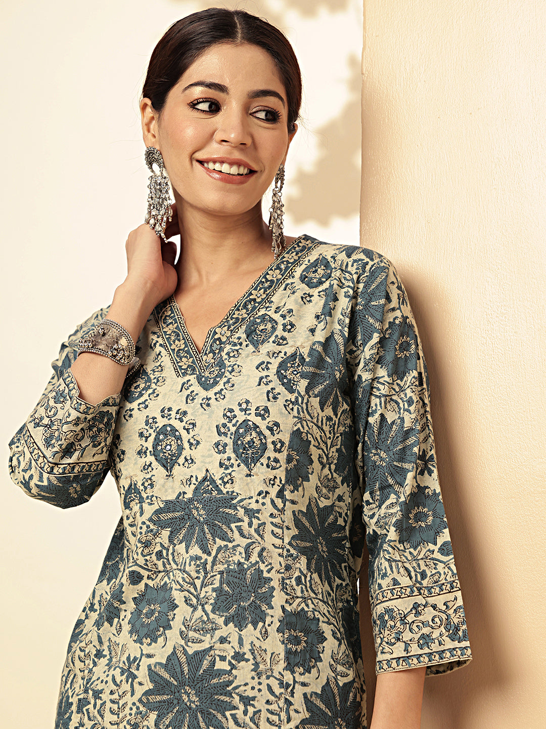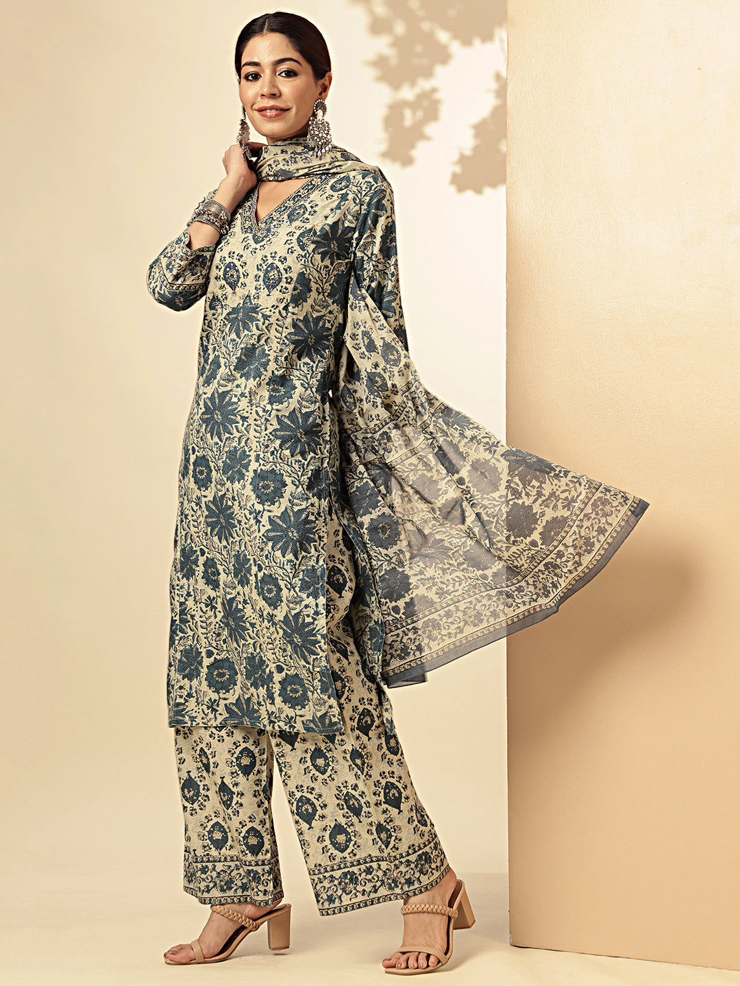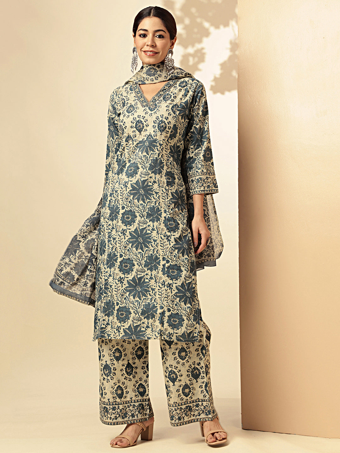 Aqua Blue Floral Printed Straight Cotton Stitched Kurta Set