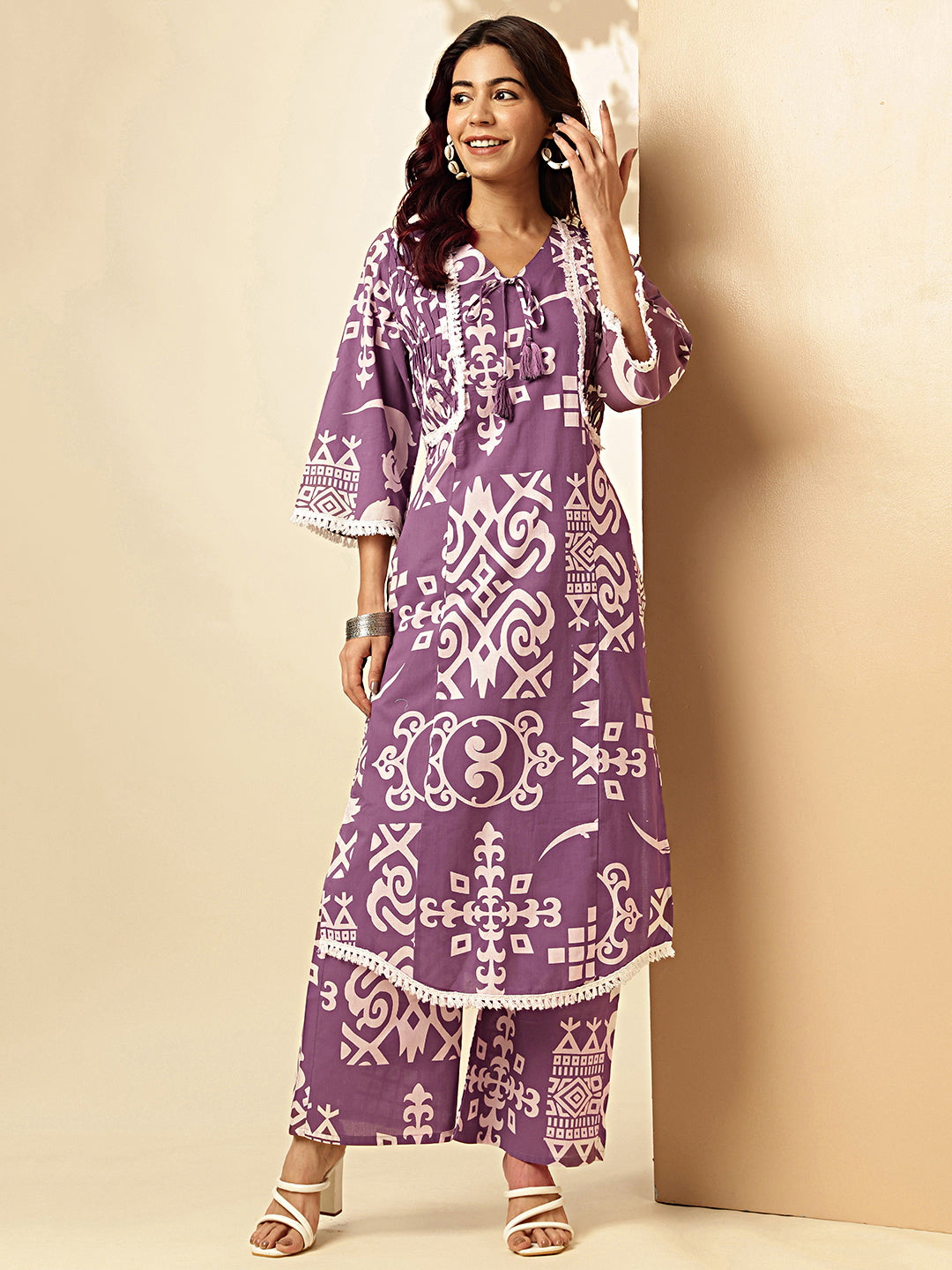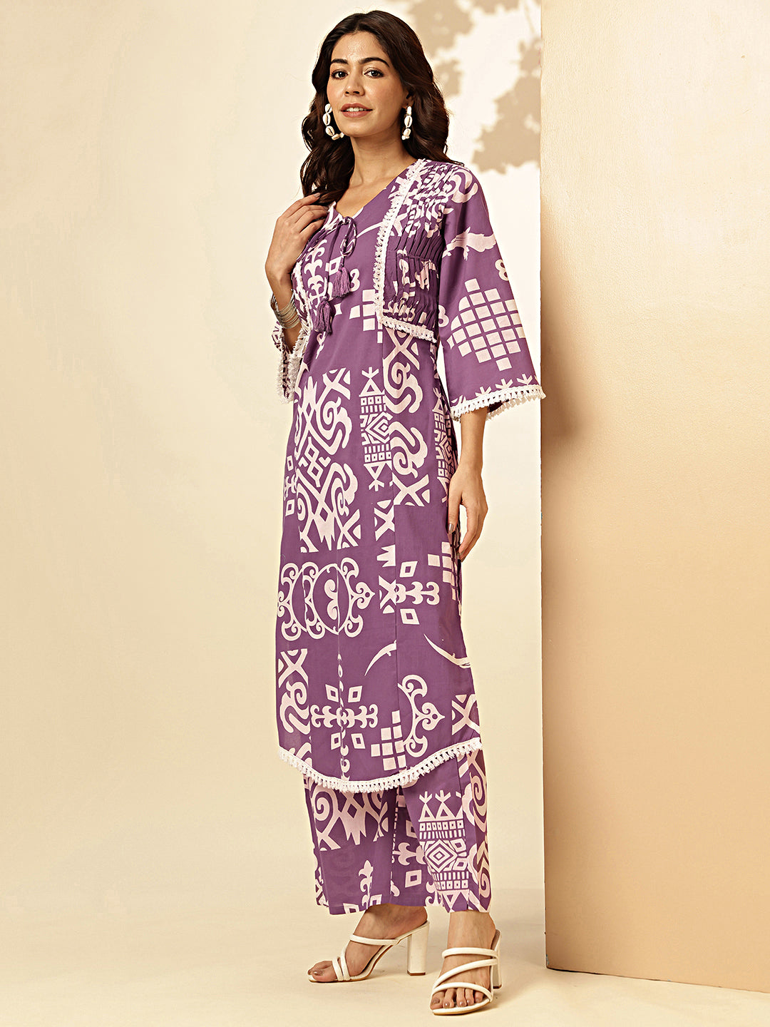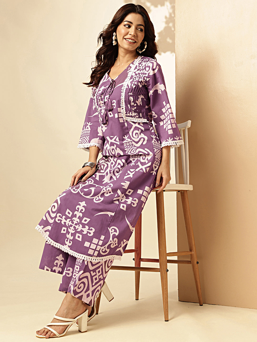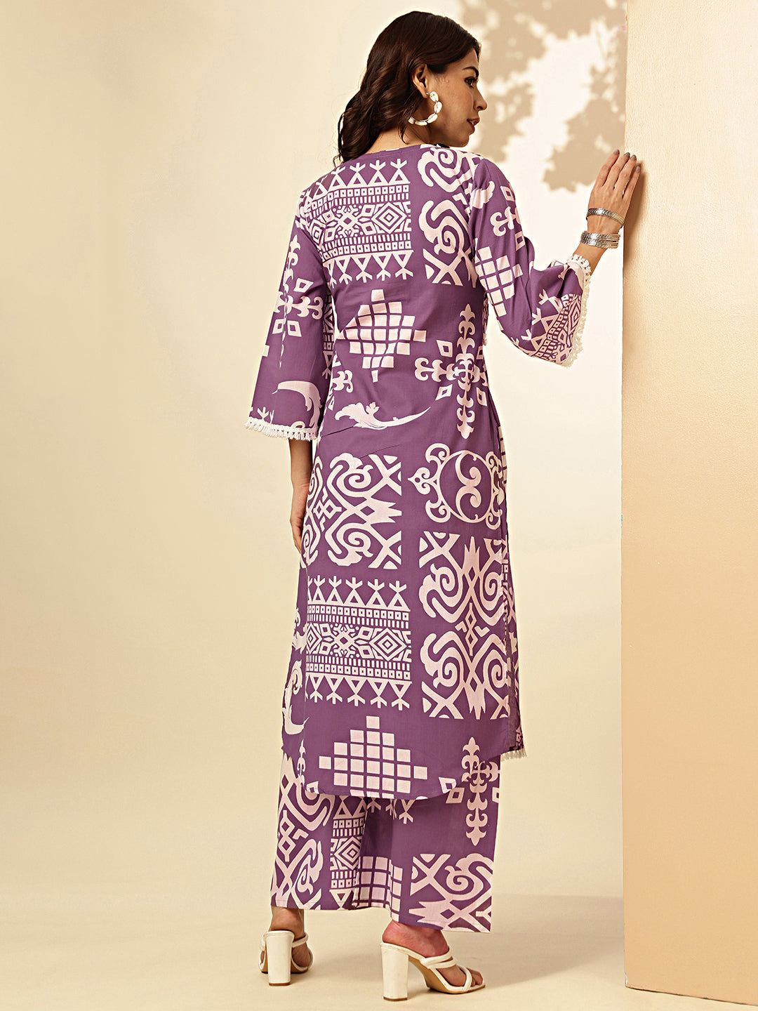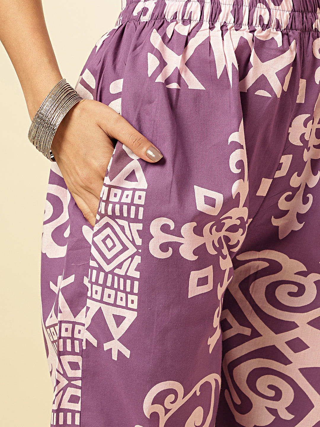 Violet Geometric Print With Embroidered Straight Cotton Stitched Kurta With Palazzo