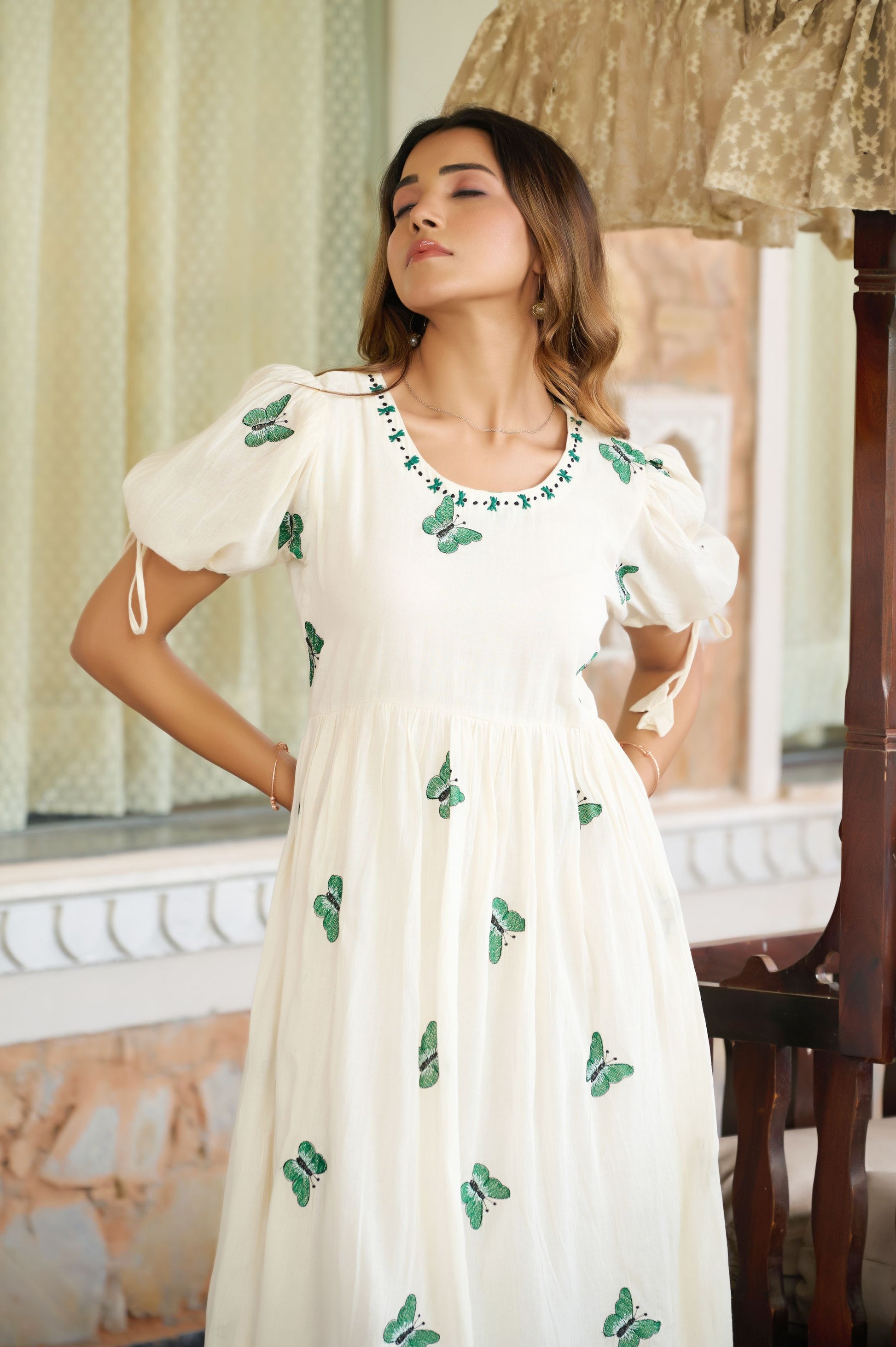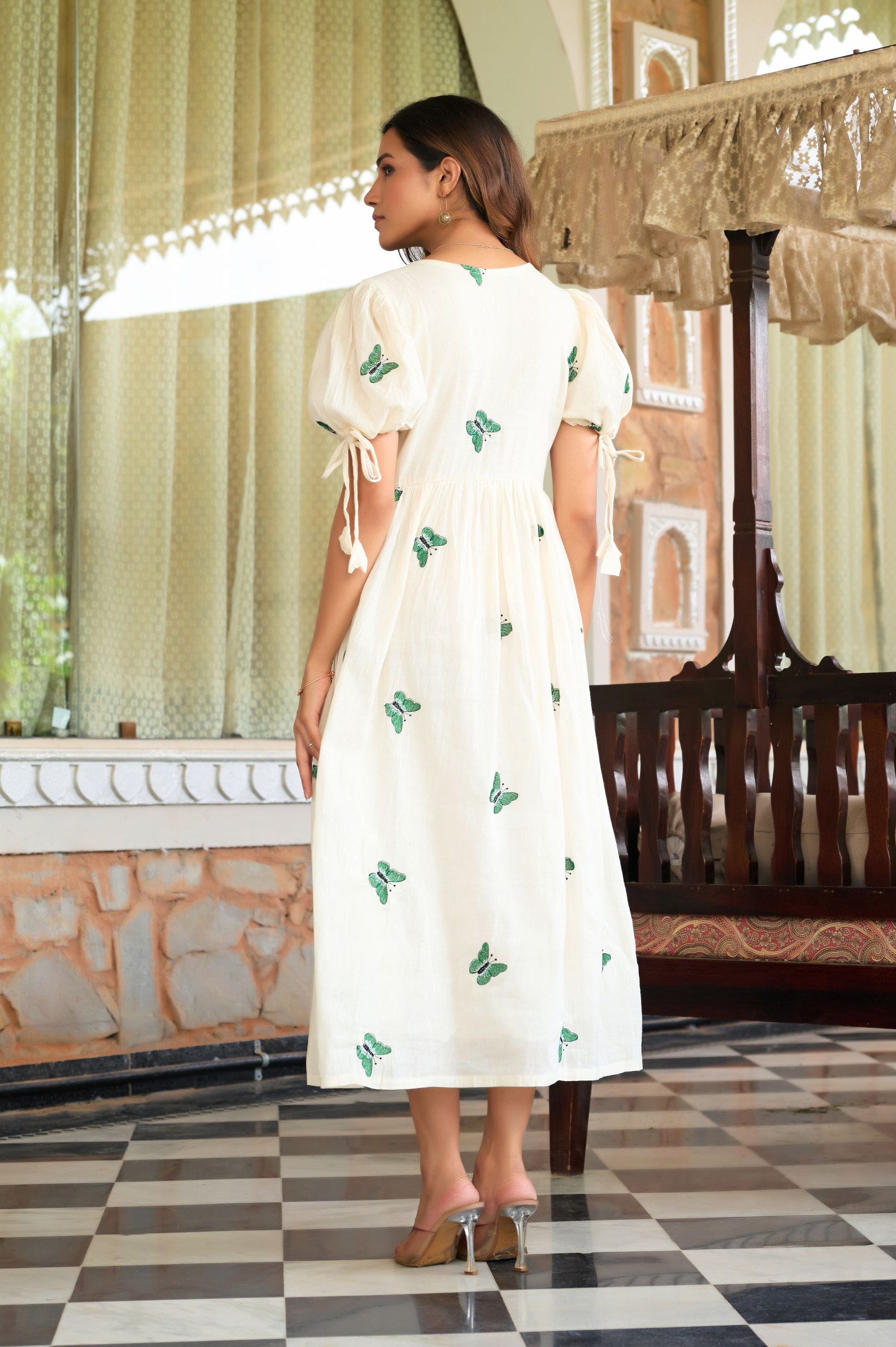 Green Butterfly Print A-Line Mul Cotton Stitched Dress