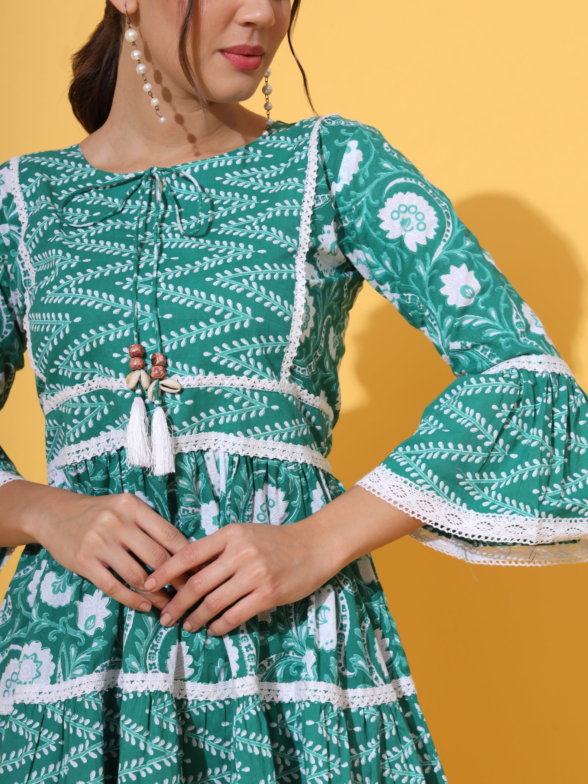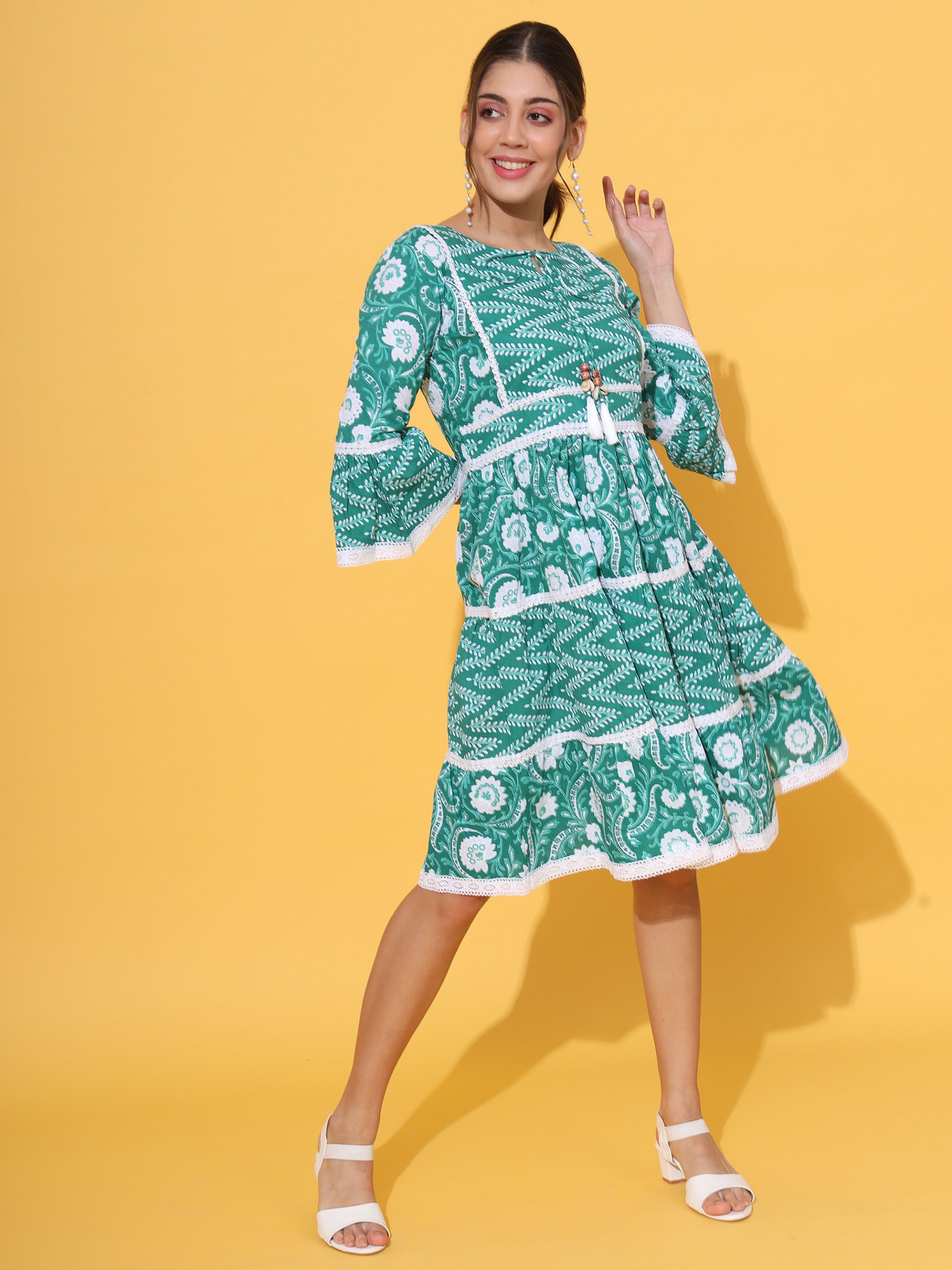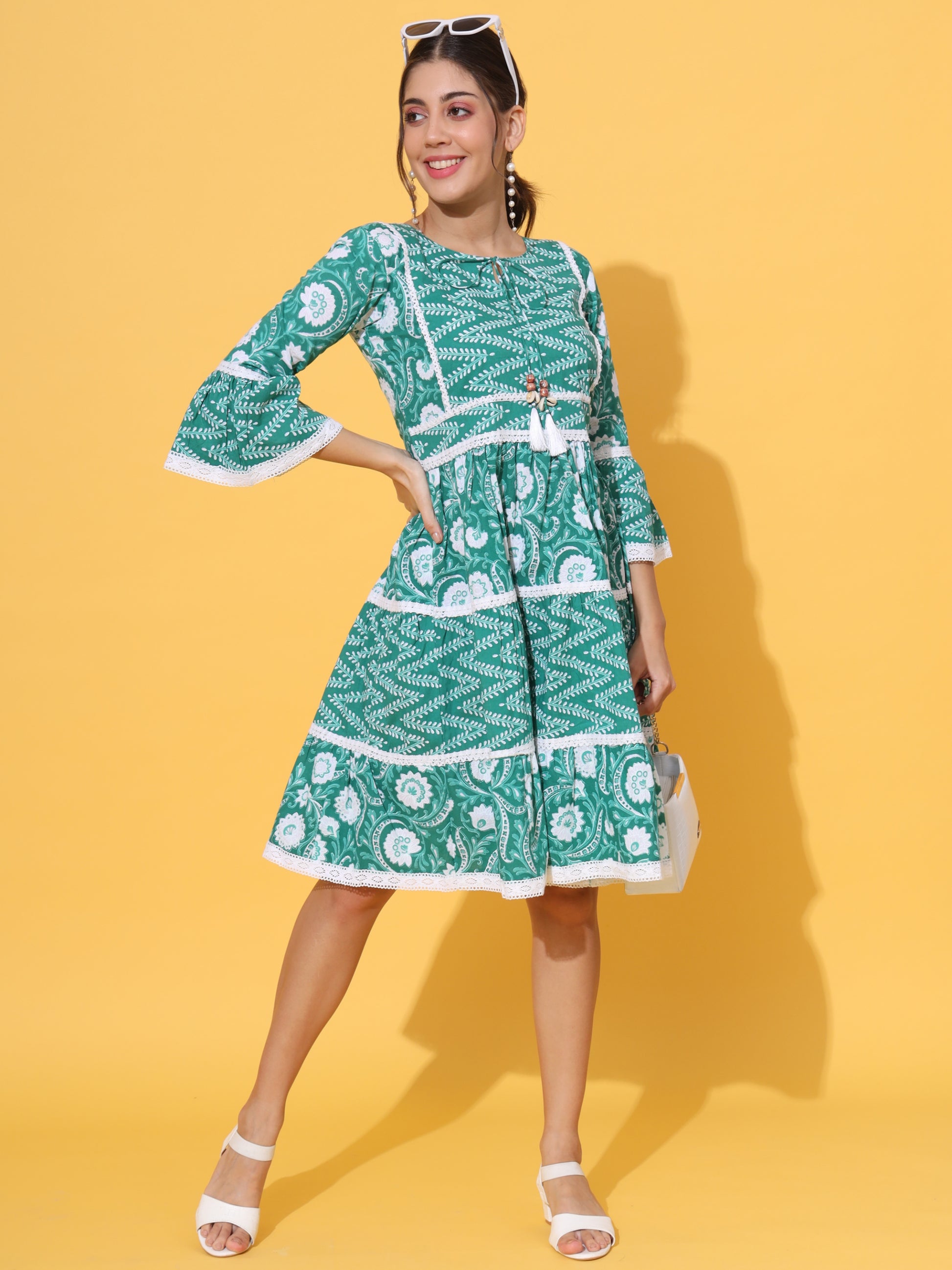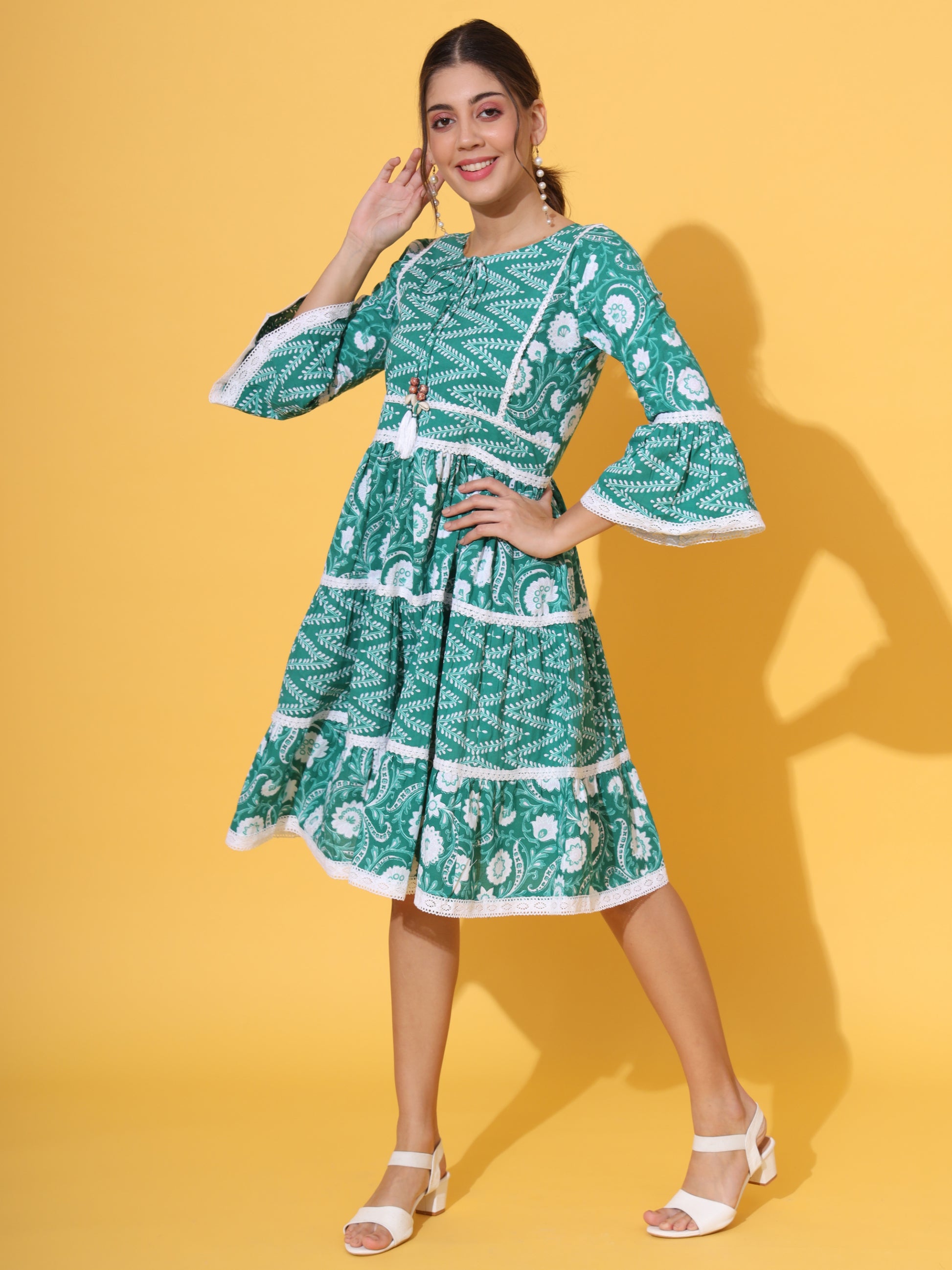Look spectacular in this green cotton knee-length dress! Crafted with a flared silhouette, the charming floral print, Schiflii lace, and dori tasseles will have you feeling stylish and chic. Perfect for any occasion, you'll be party-ready and casual-cool in this fashionable piece!