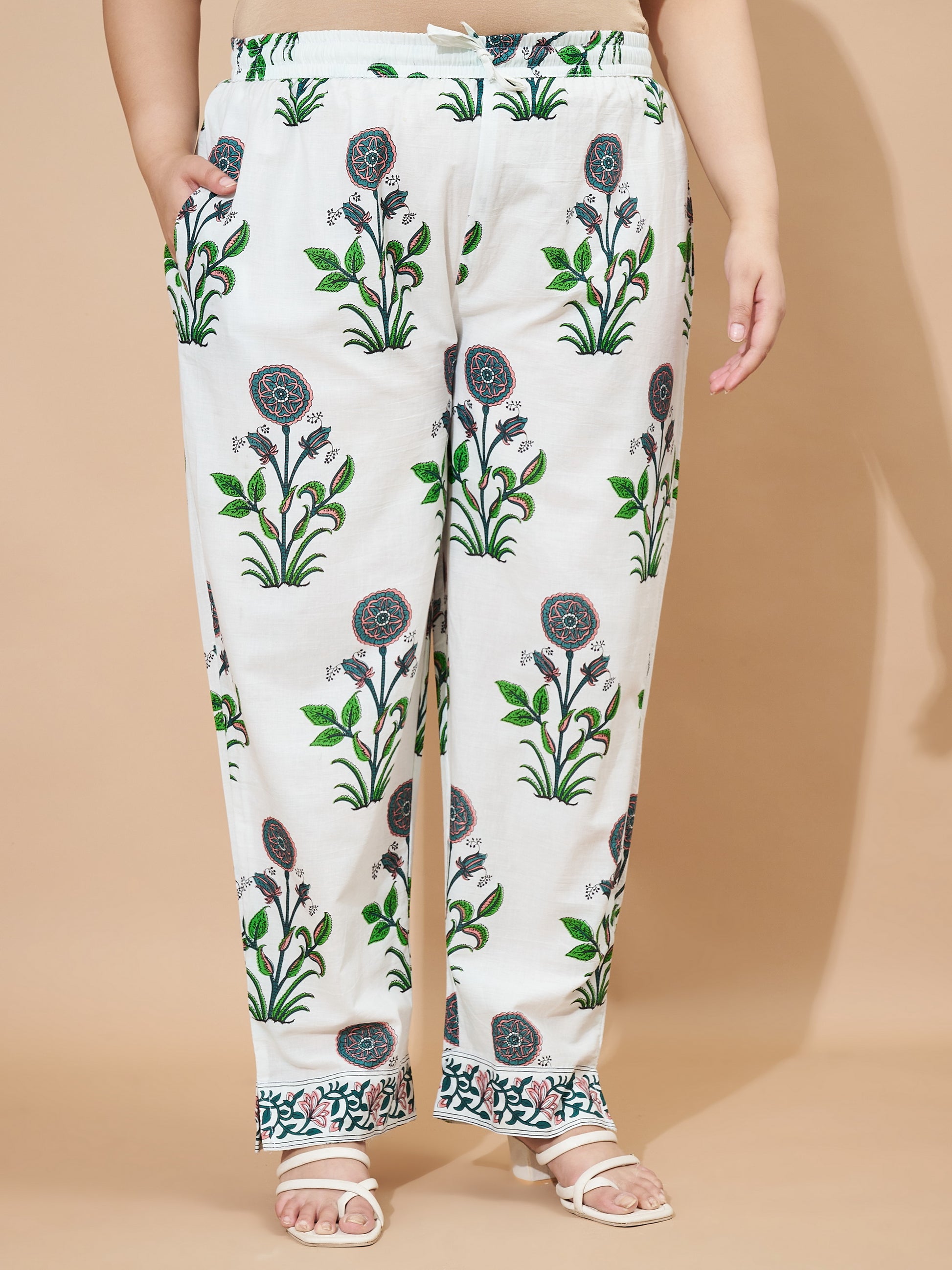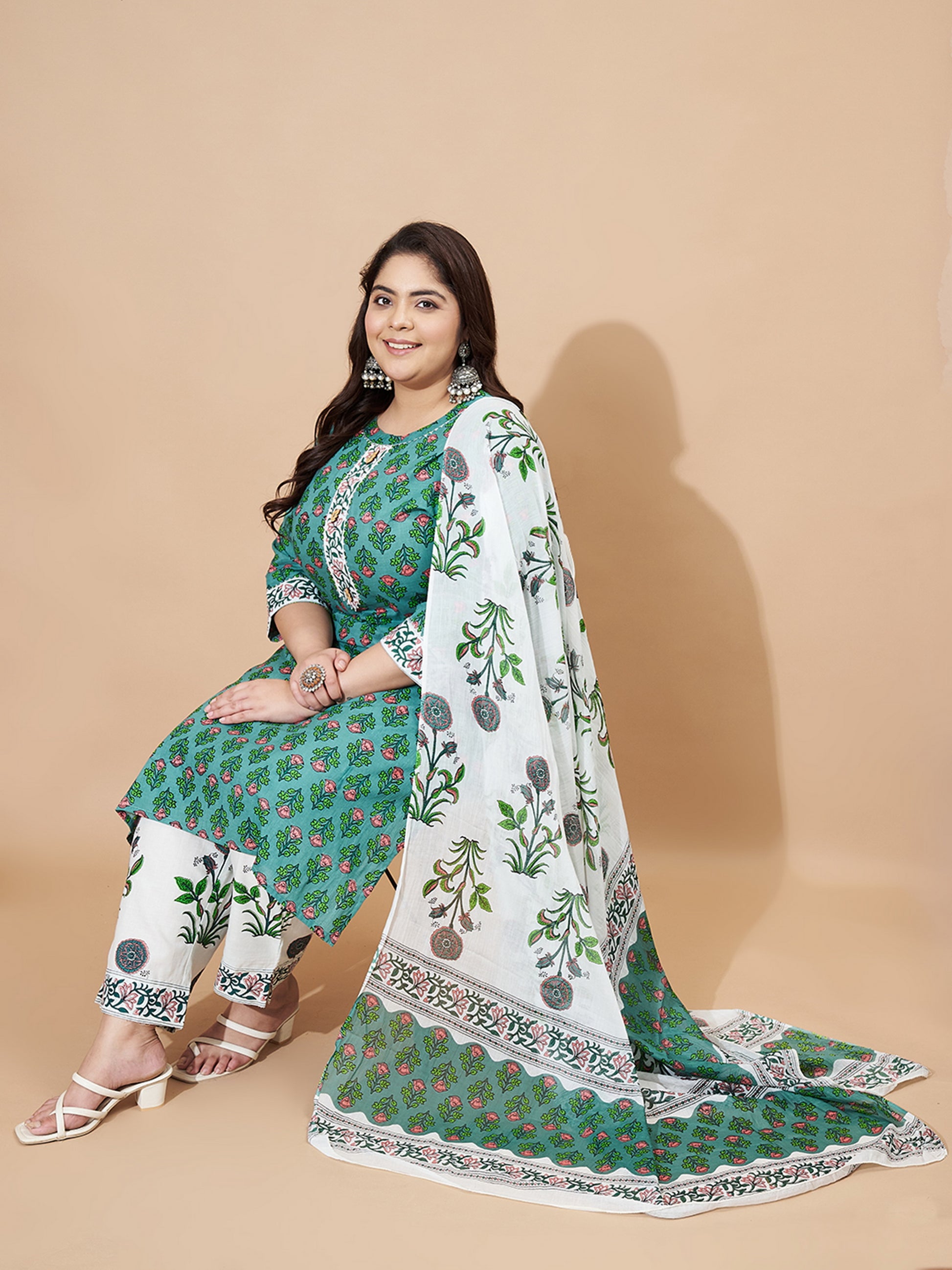 Green Floral Printed Straight Cotton Stiched Kurta Set