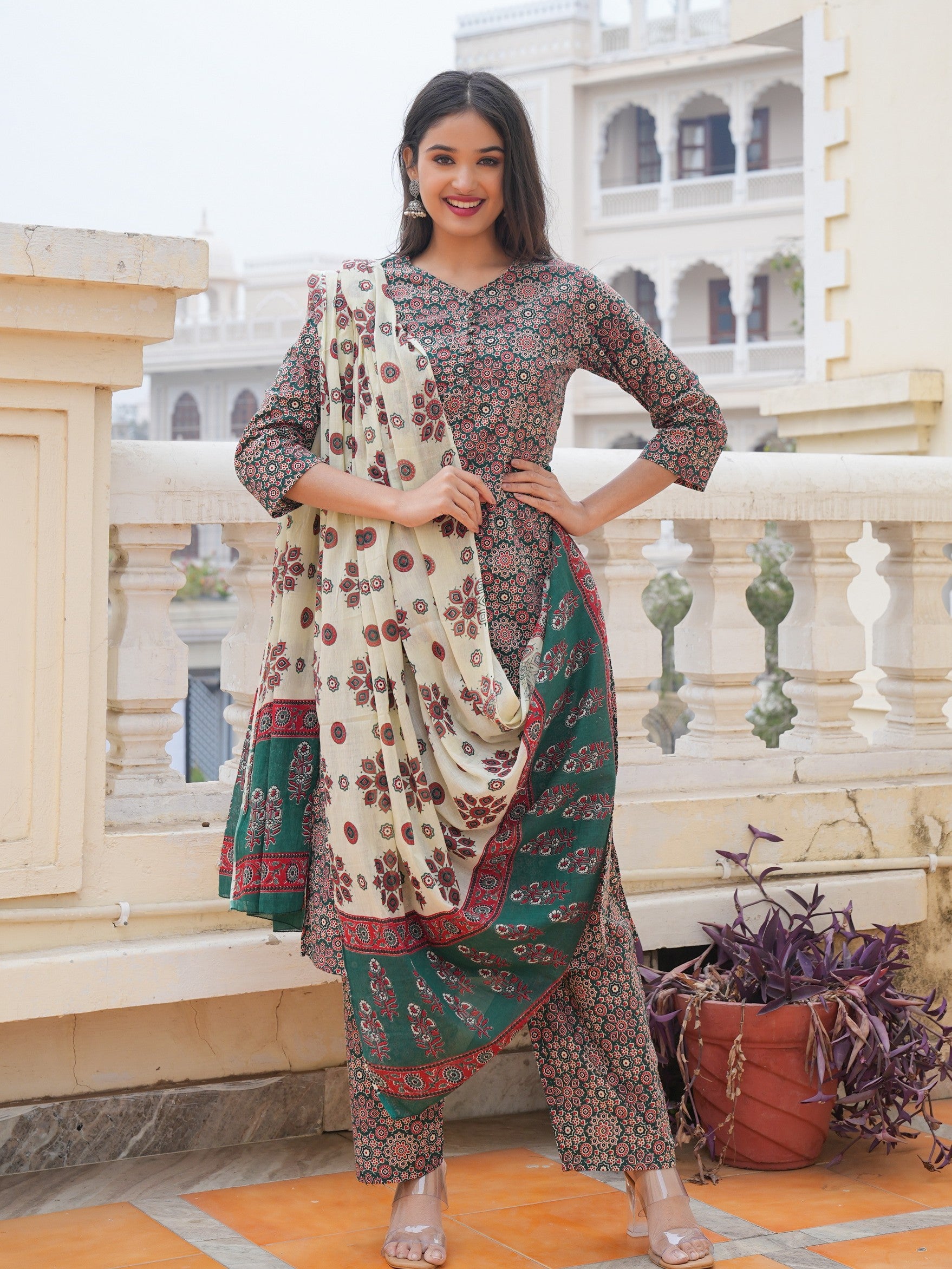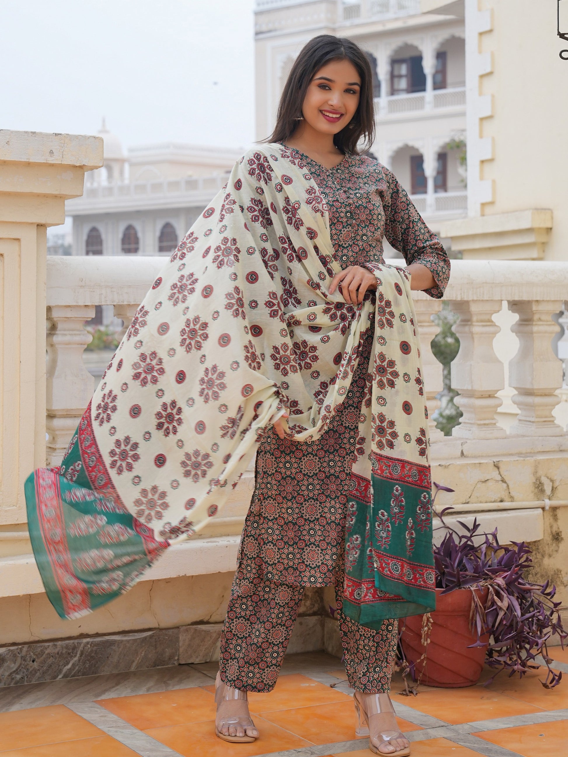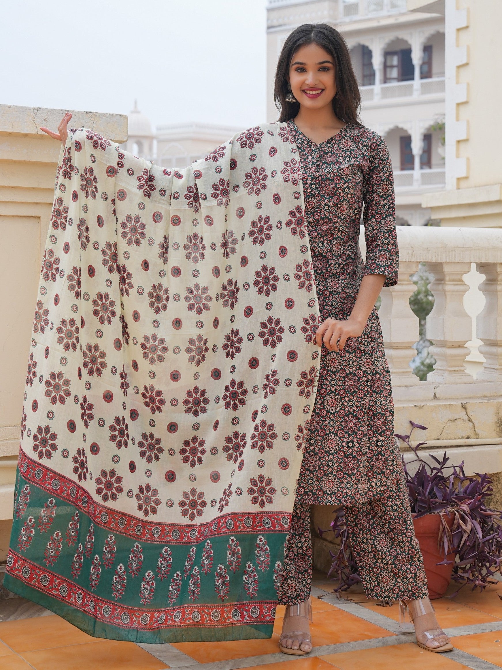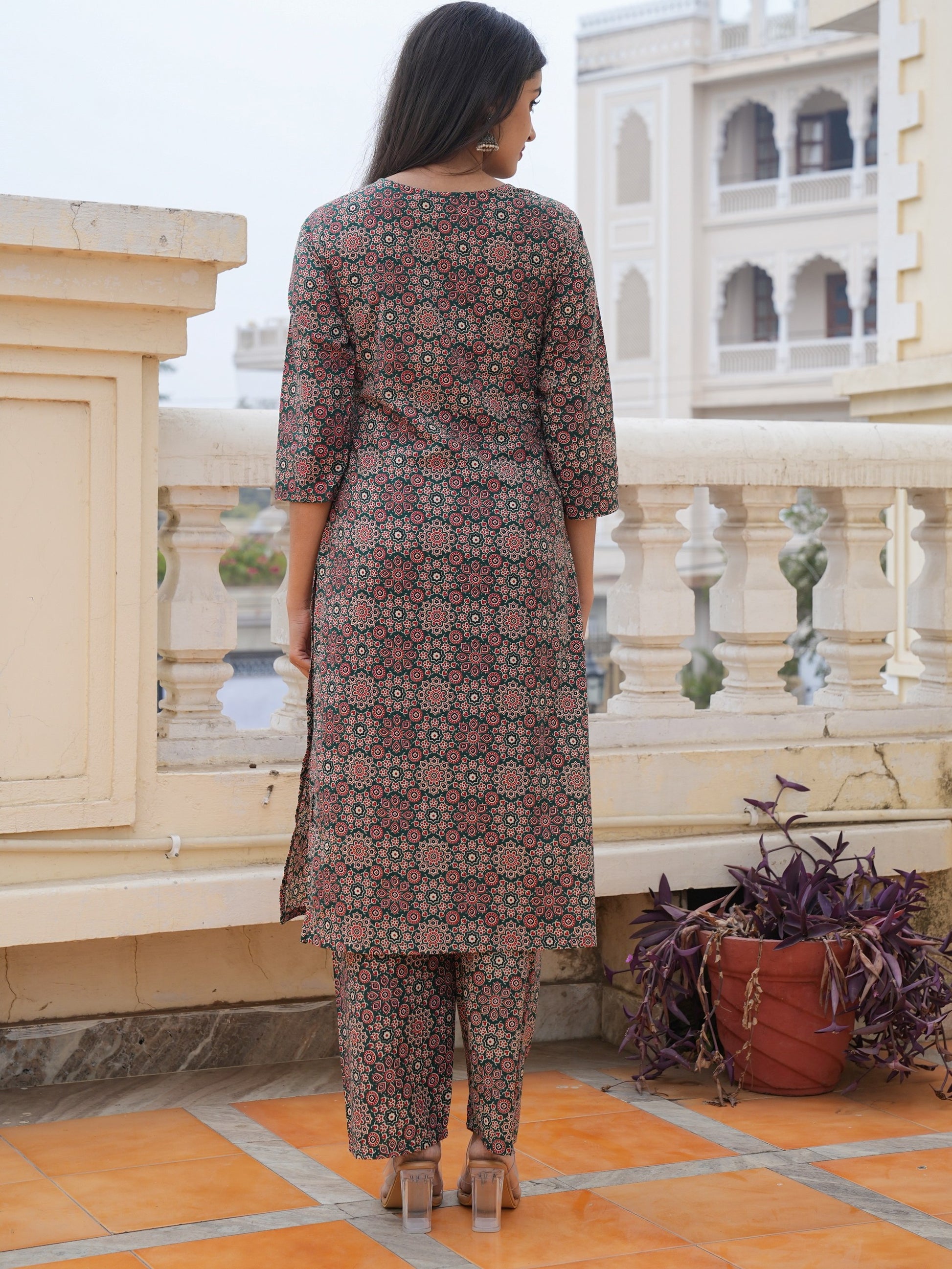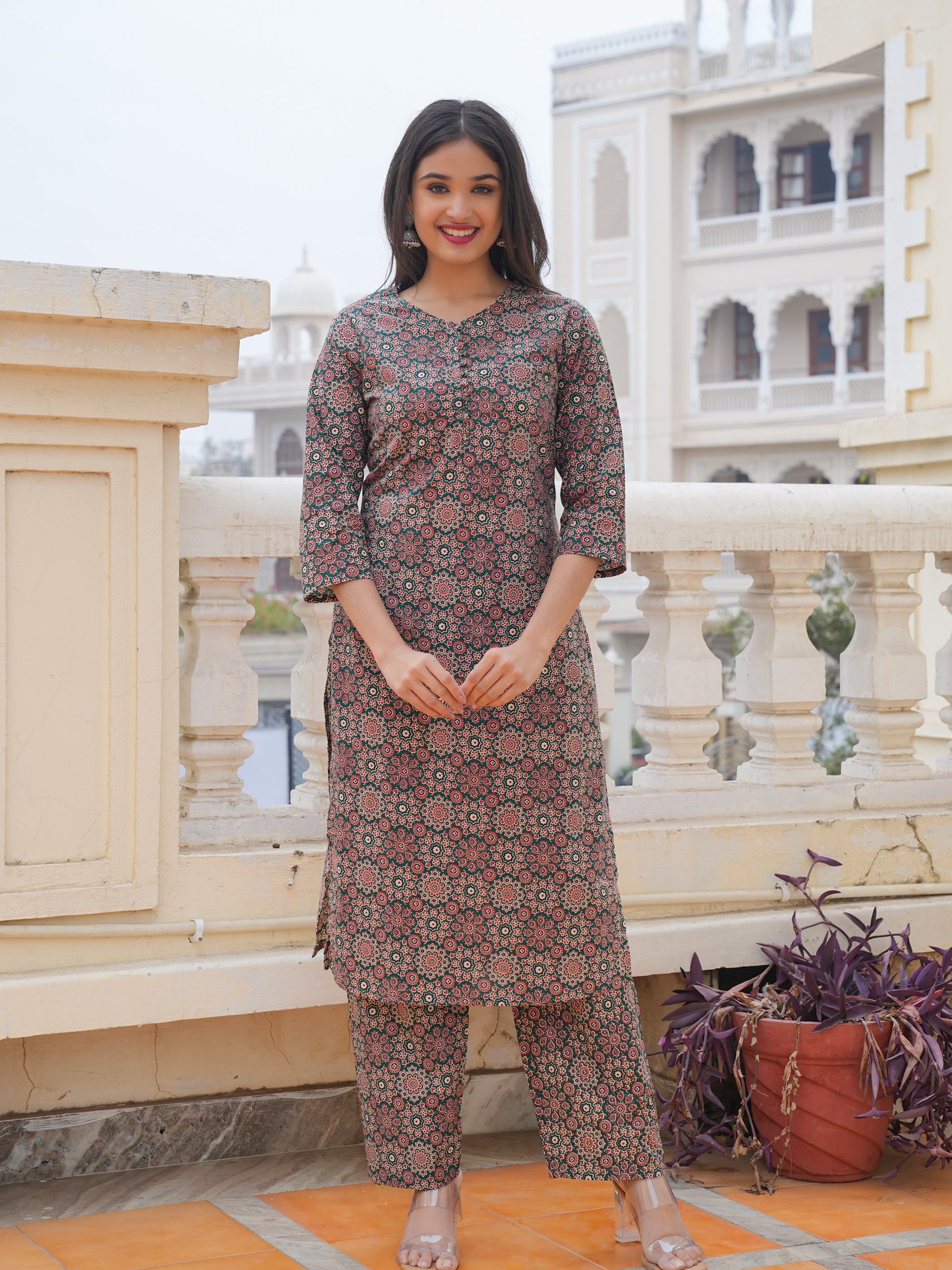 Green Cotton Printed Straight Kurta Set