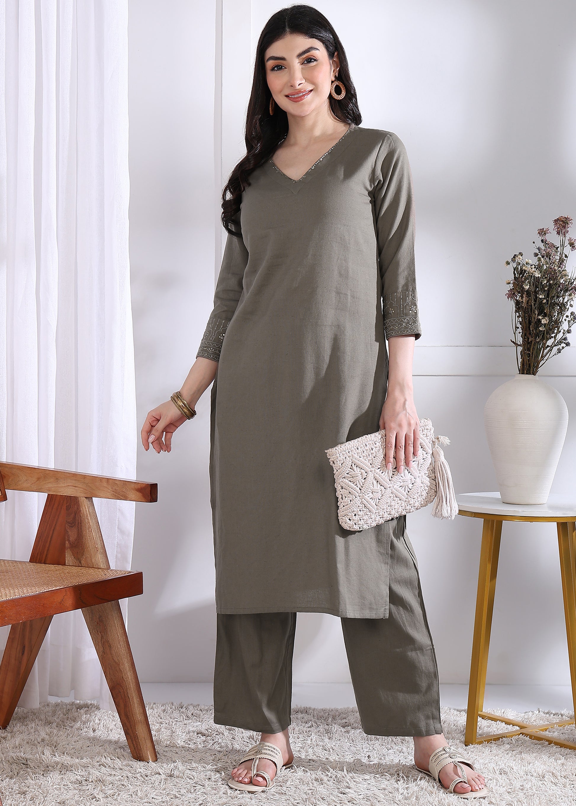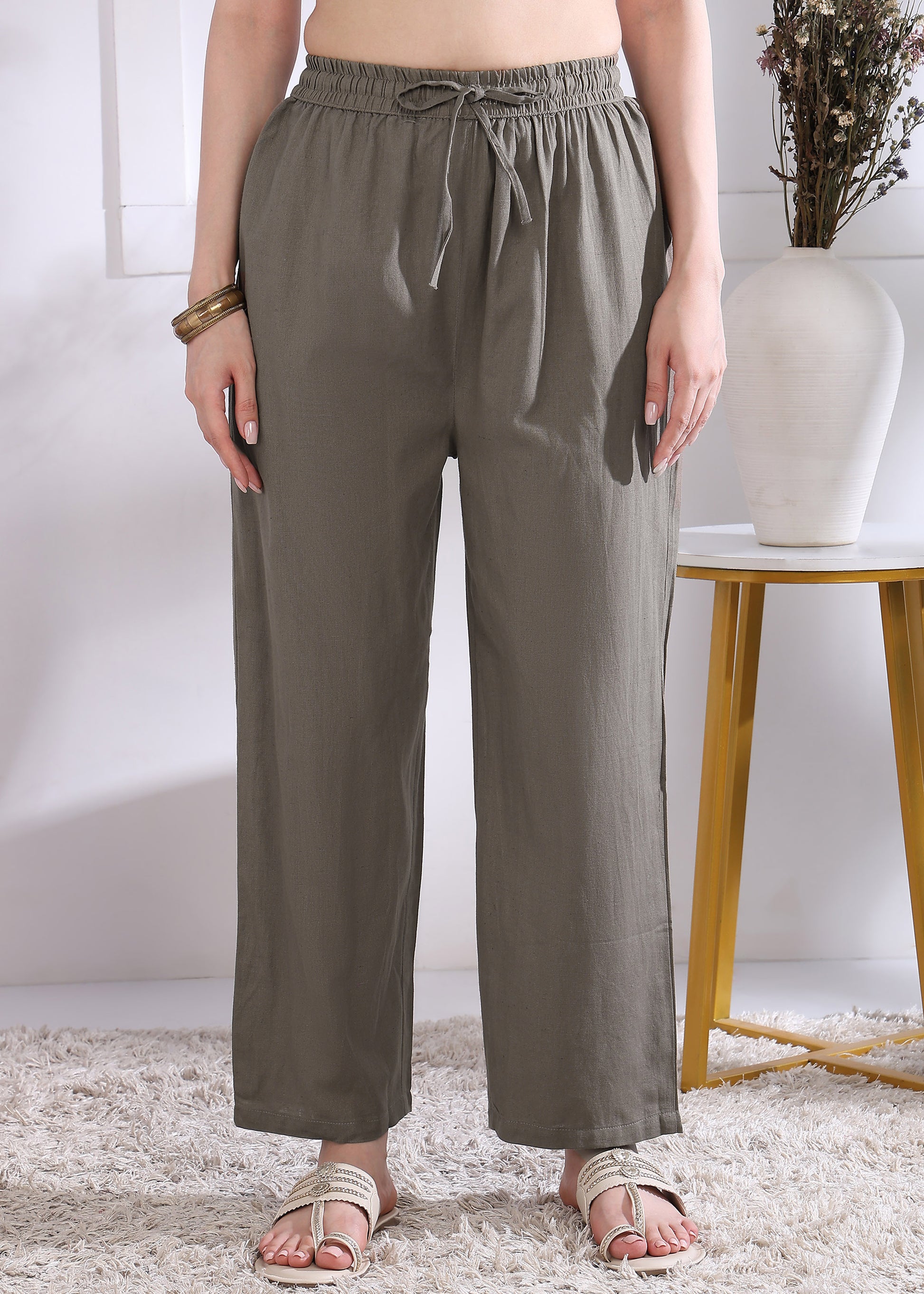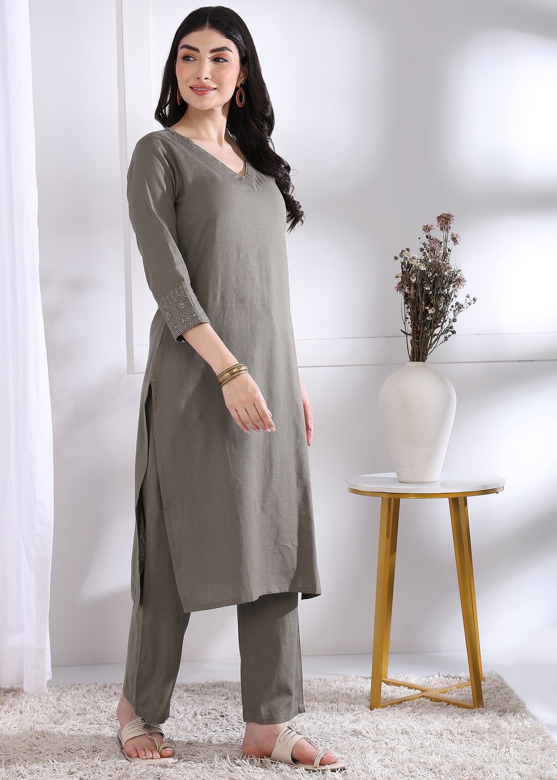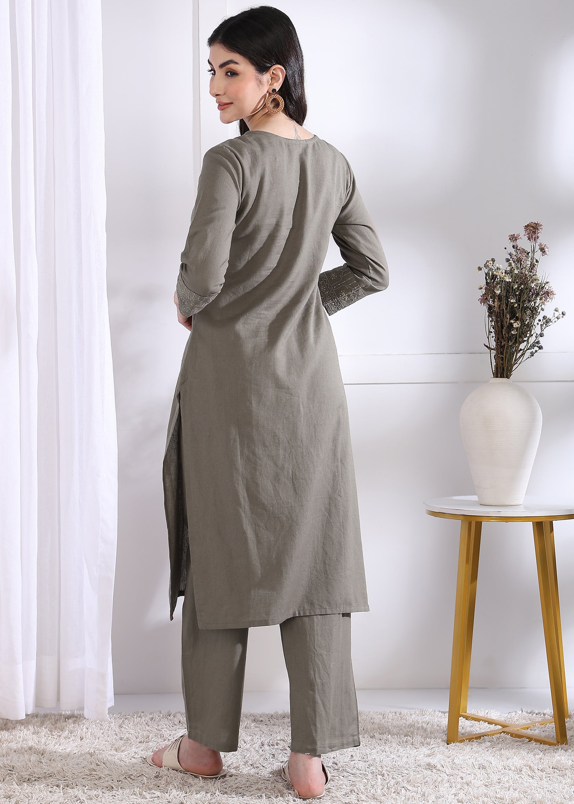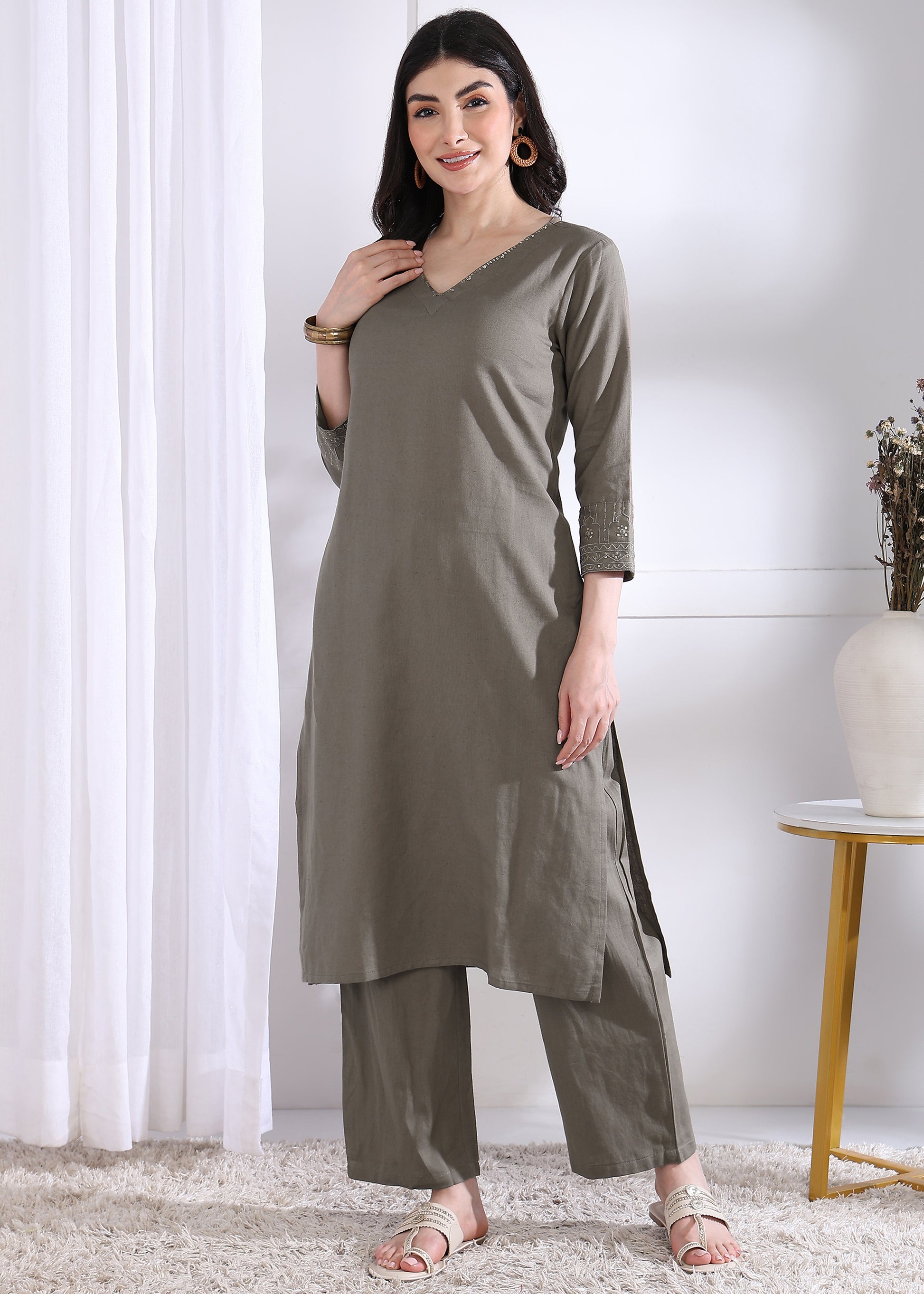 This grey solid straight kurta, crafted from breathable cotton, offers a comfortable and elegant fit. Paired with matching palazzo pants, it creates a stylish and versatile ensemble perfect for casual or semi-formal occasions. The stitched design ensures a neat silhouette, combining traditional charm with modern comfort. Ideal for those seeking effortless style with ease of movement.