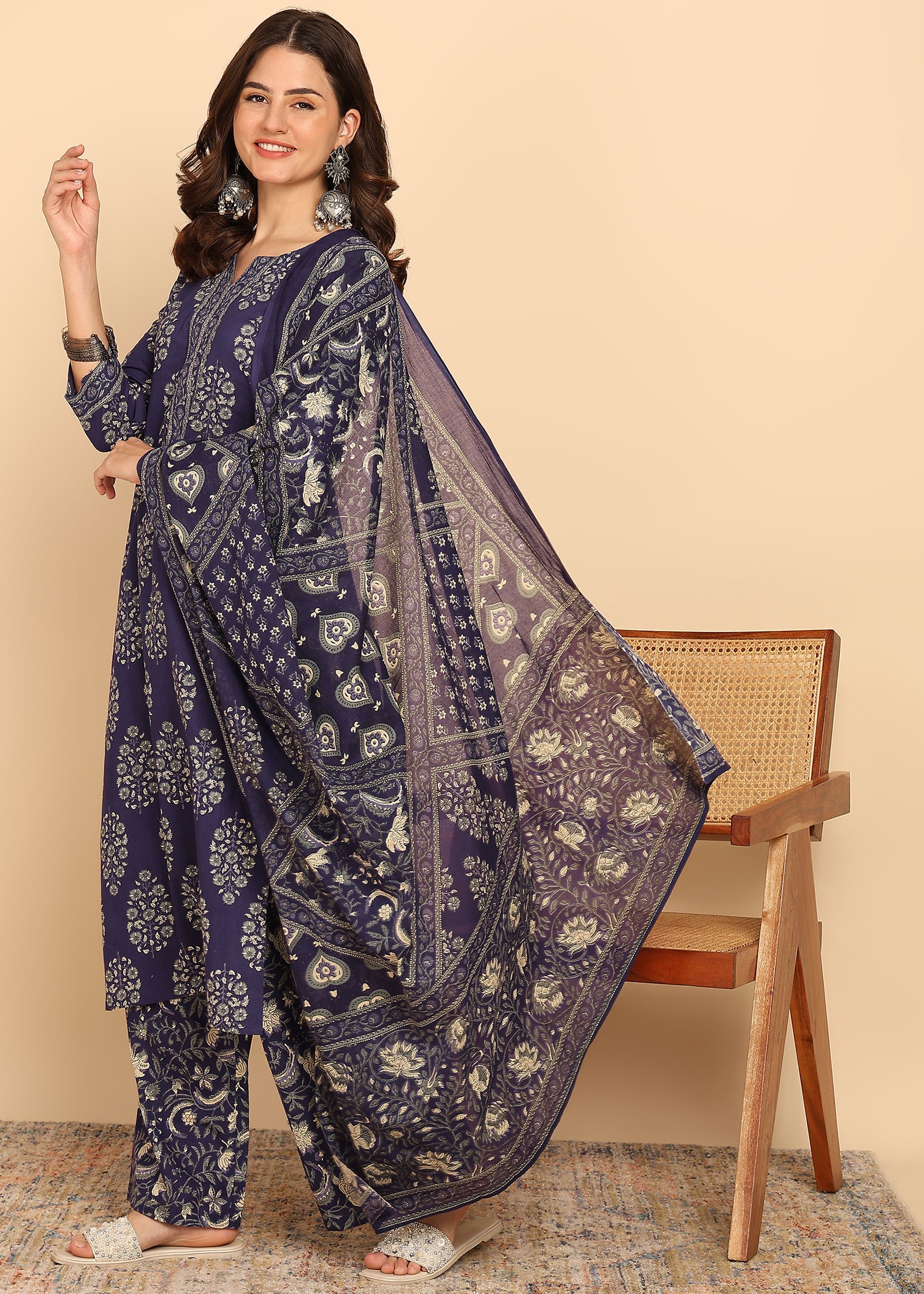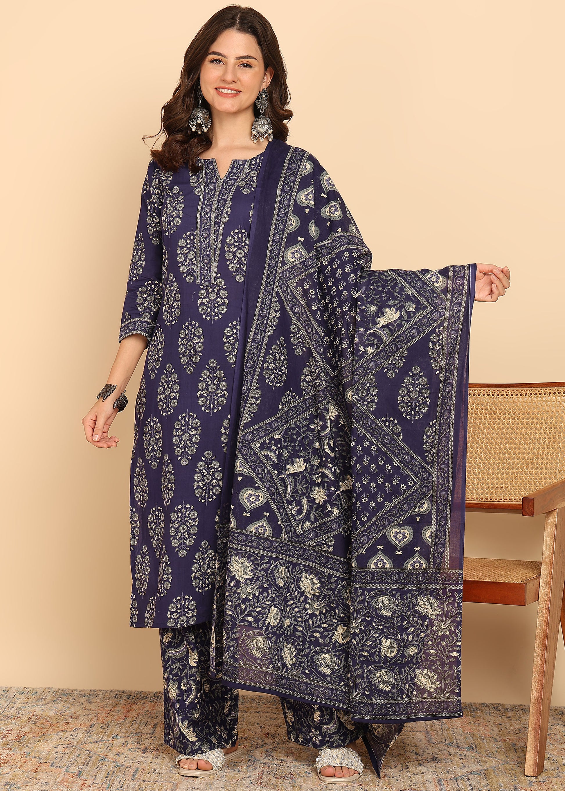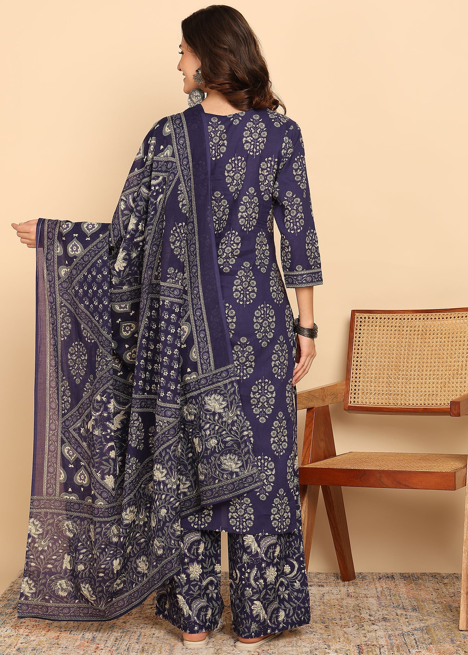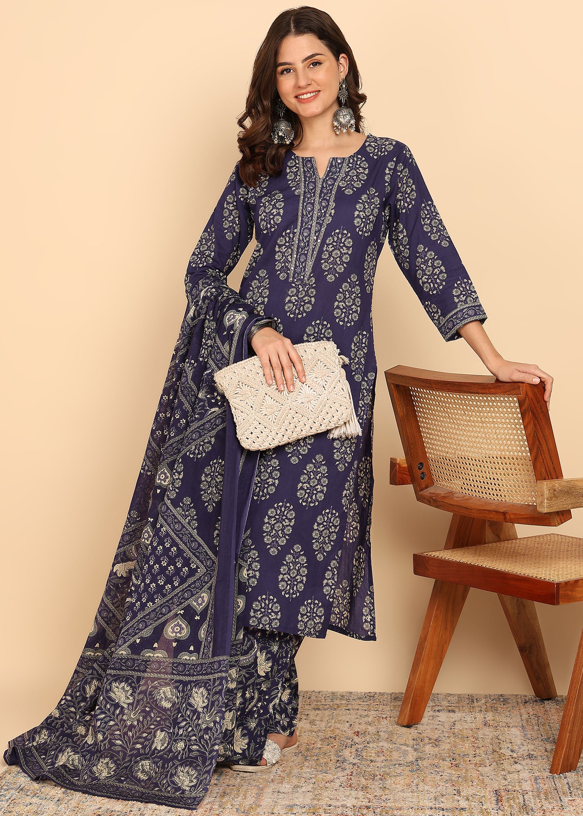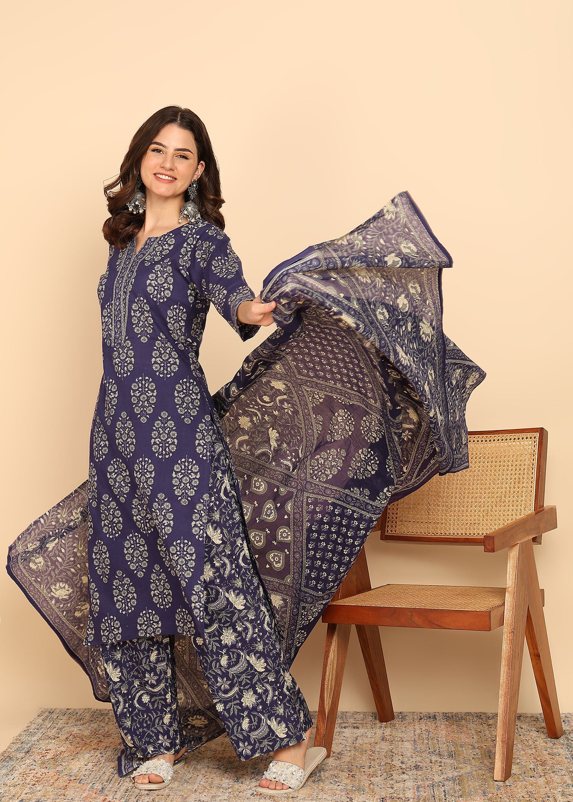 This Indigo Blue Floral Printed set features a straight-cut cotton kurta paired with comfortable palazzo pants and a matching dupatta. Crafted from breathable cotton, it ensures all-day comfort while the floral print adds a touch of elegance. Perfect for casual outings or festive occasions, this ensemble combines style and ease effortlessly.