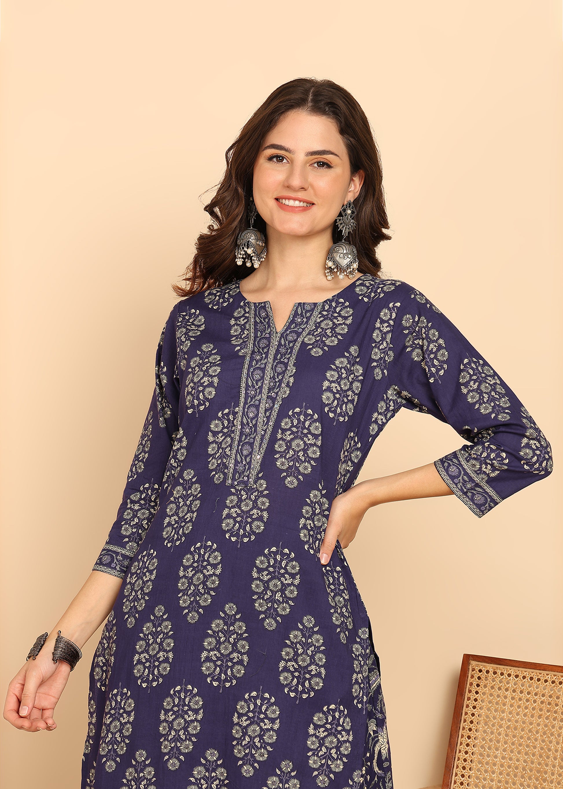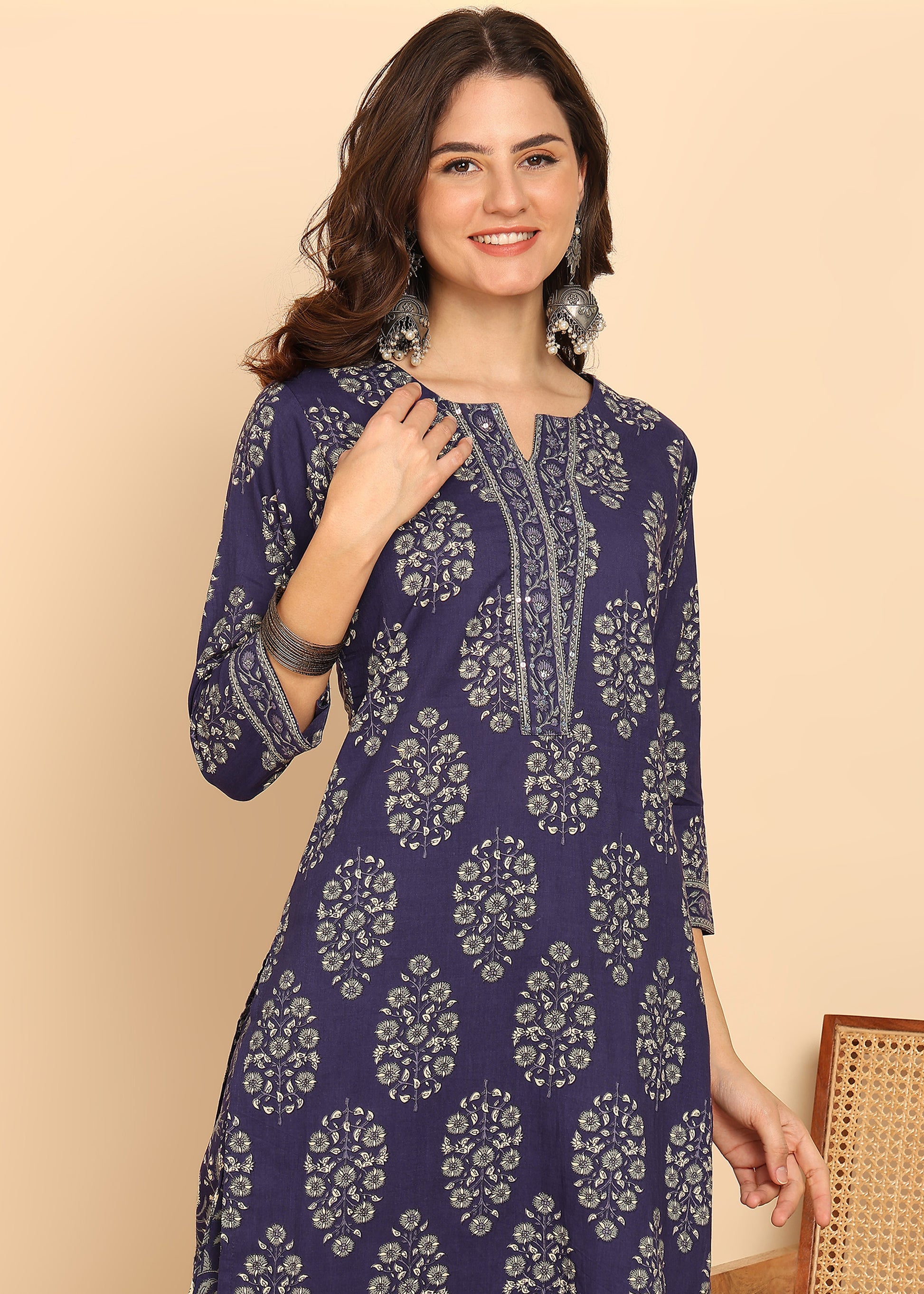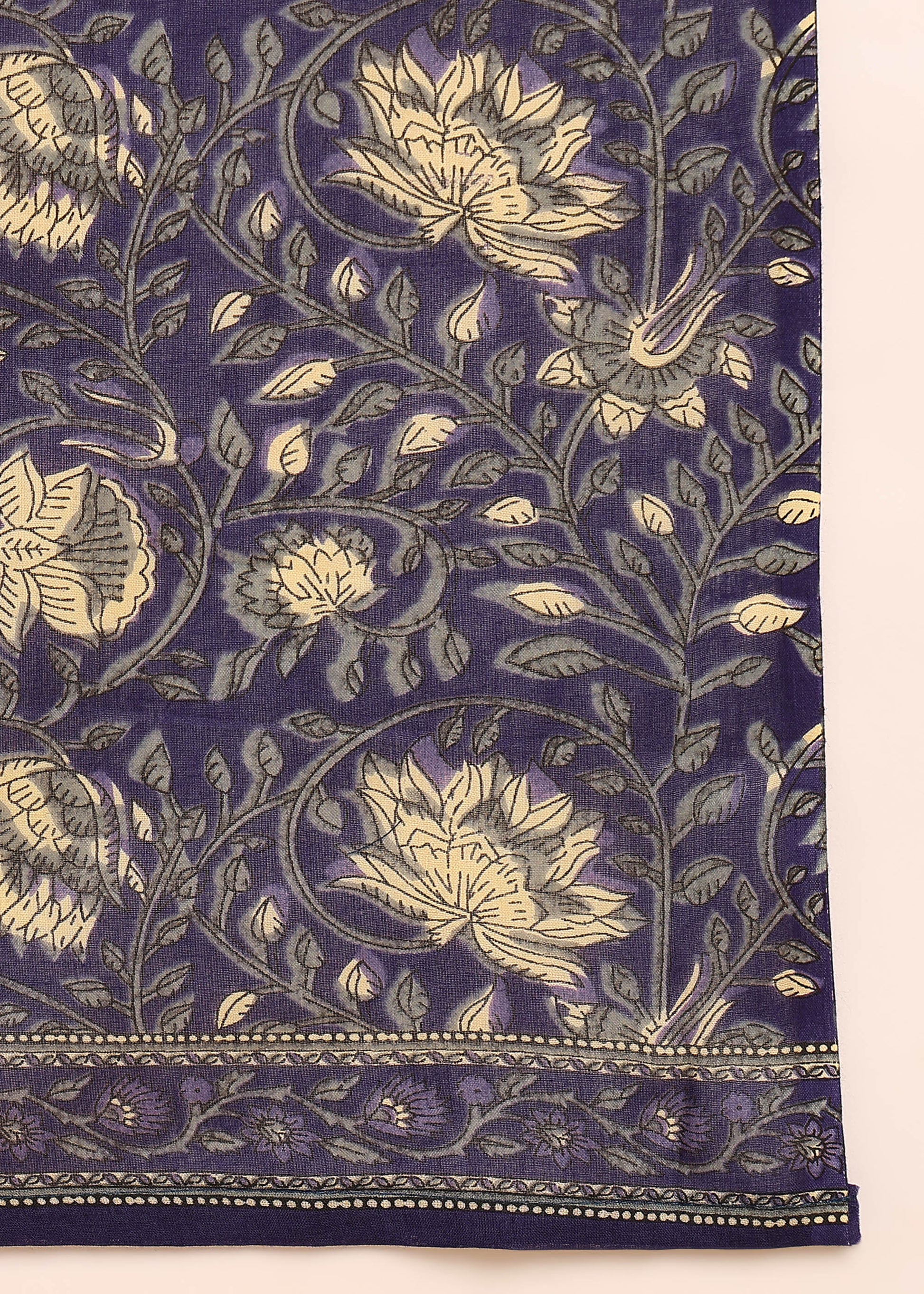 Indigo Blue Floral Printed Straight Cotton Stitched Kurta Set