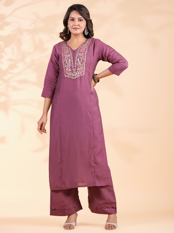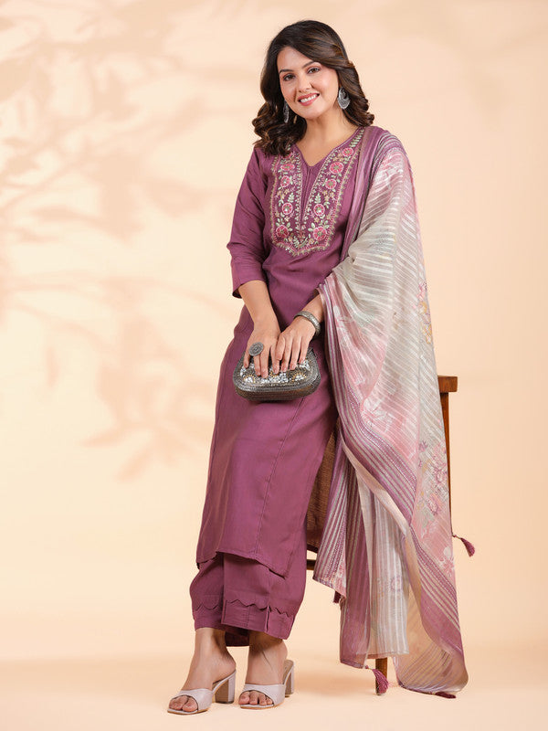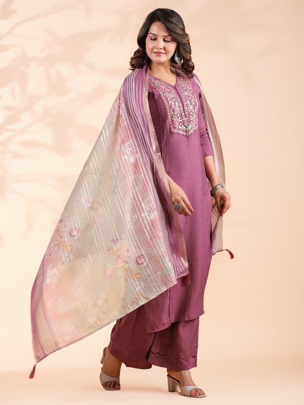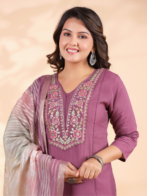 Lavender Embroidered Straight Roman Silk Stitched Kurta Set
