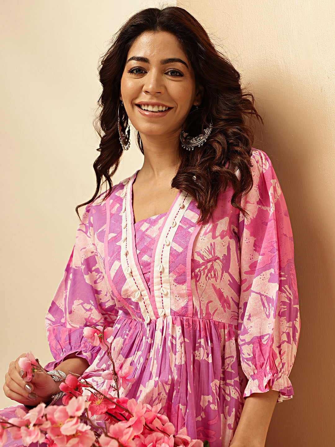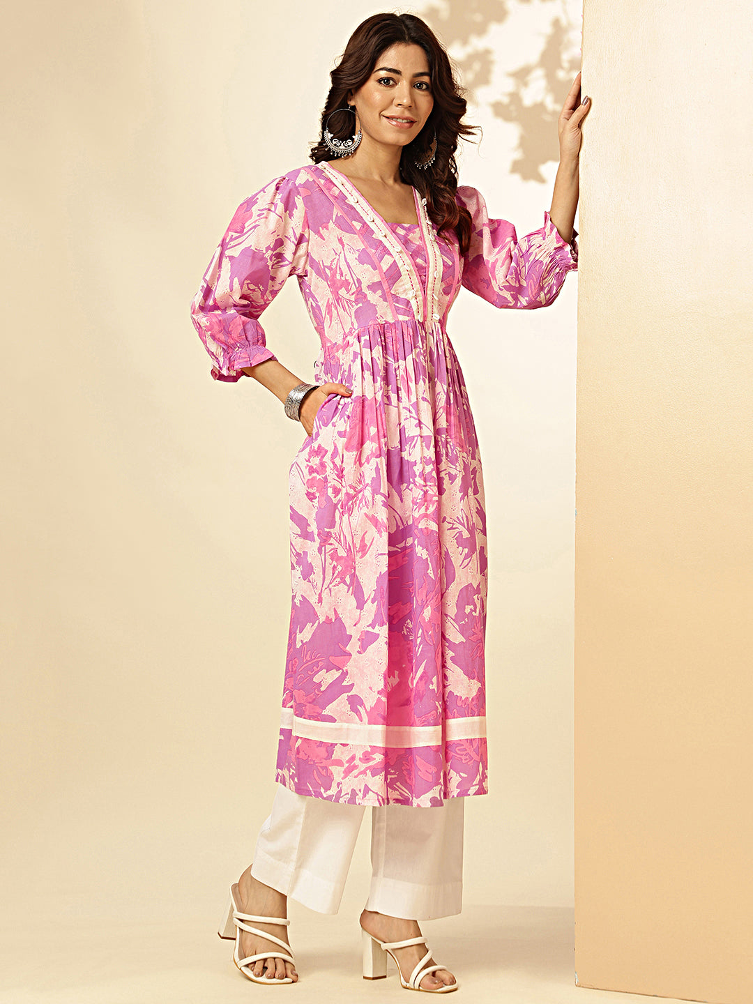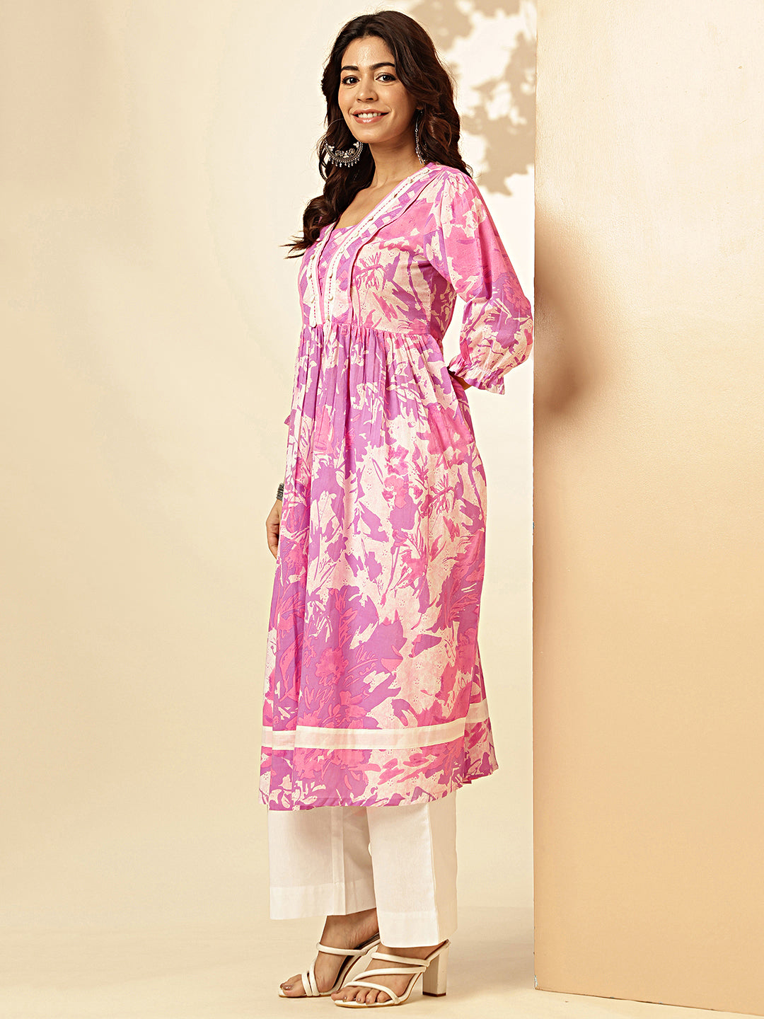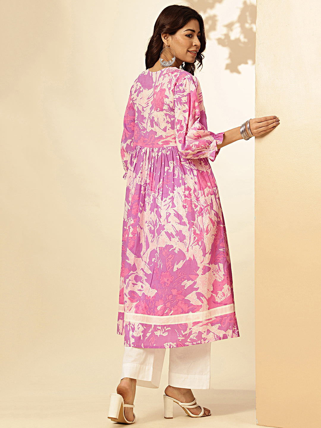 Lavender Graphics Print Fit And Flare Cotton Stitched Kurta