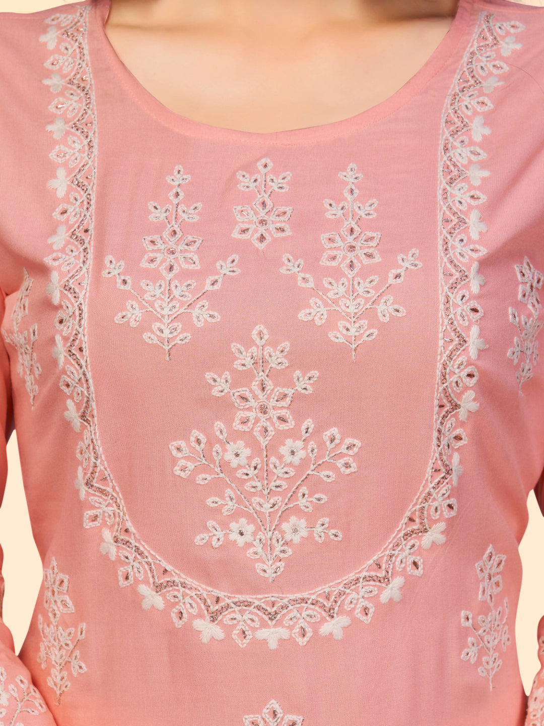 Feel dreamy in this beautiful Light Pink embroidered straight rayon Kurta Set! With its intricate embroidery, it's sure to attract admiration and compliments from your loved ones. Crafted in lightweight fabric, it's just perfect for summery days!