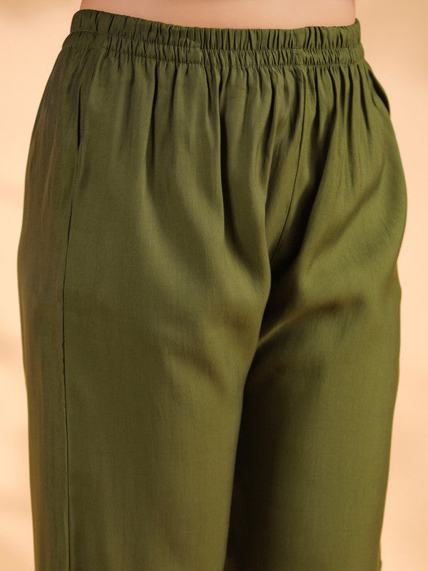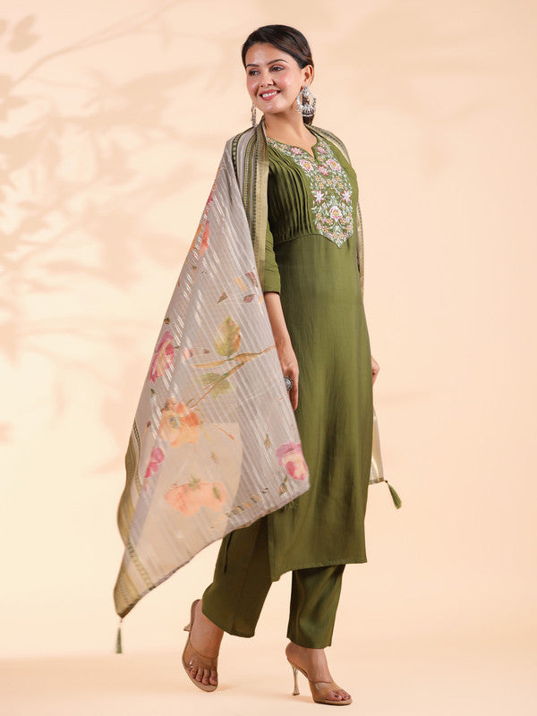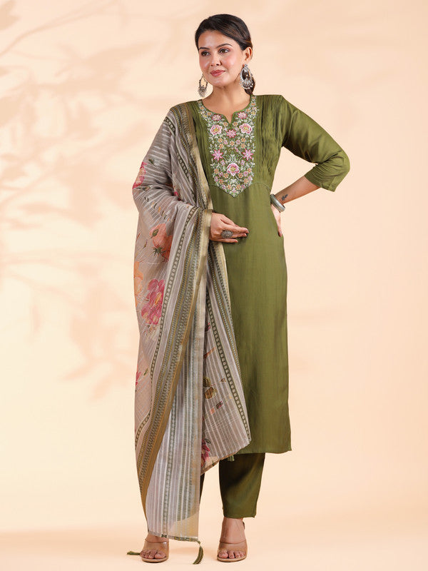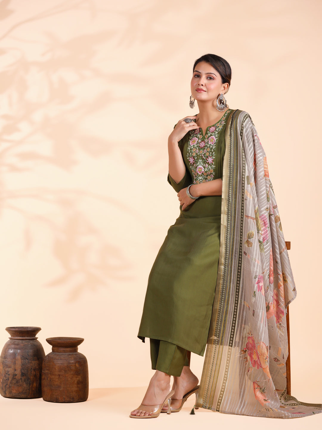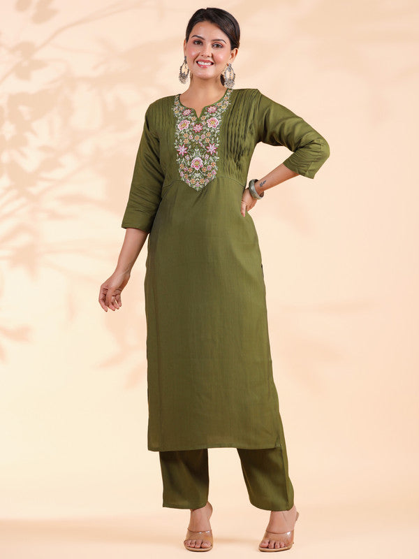 Mahendi Solid With Embroidered Straight Roman Silk Stitched Kurta Set