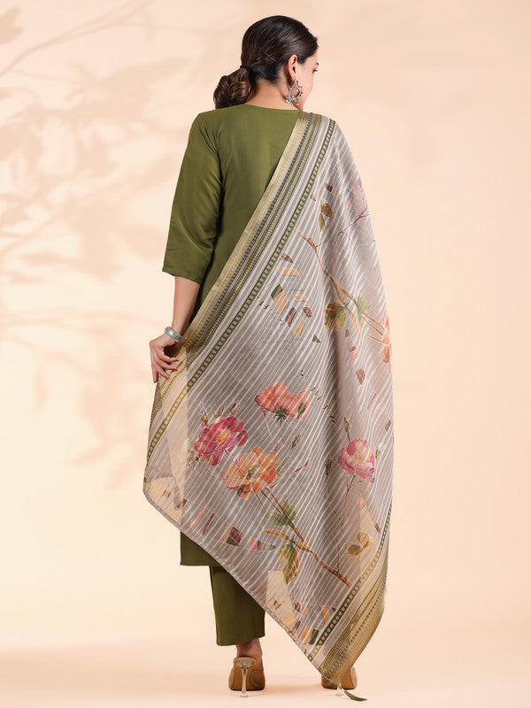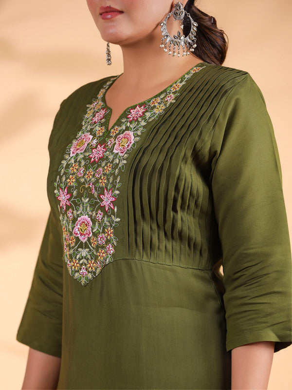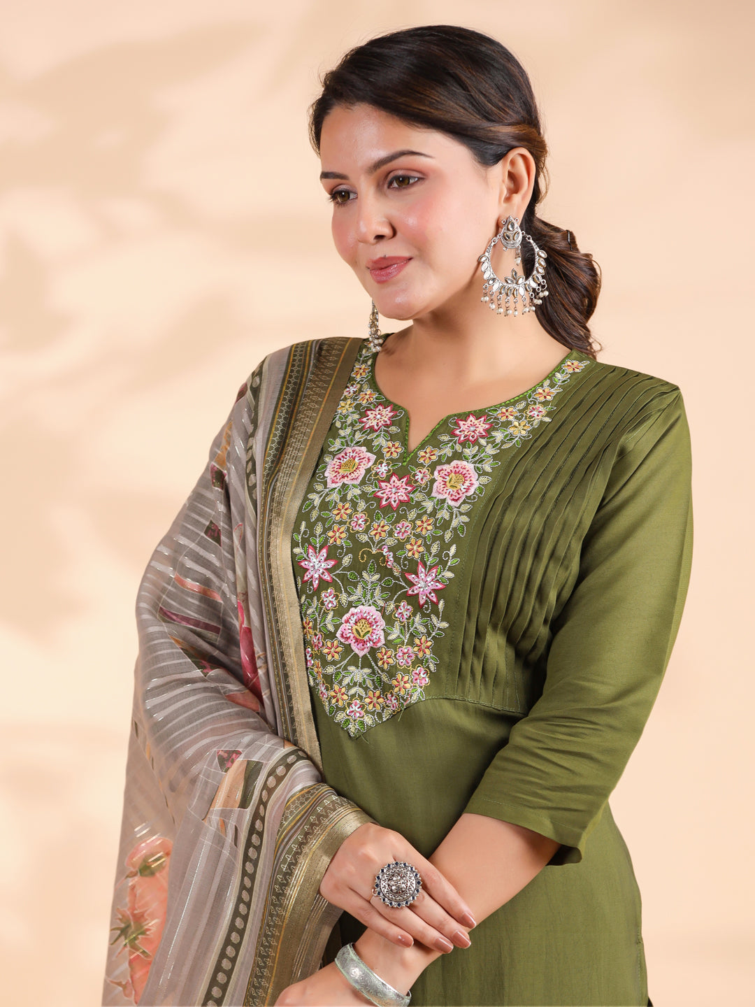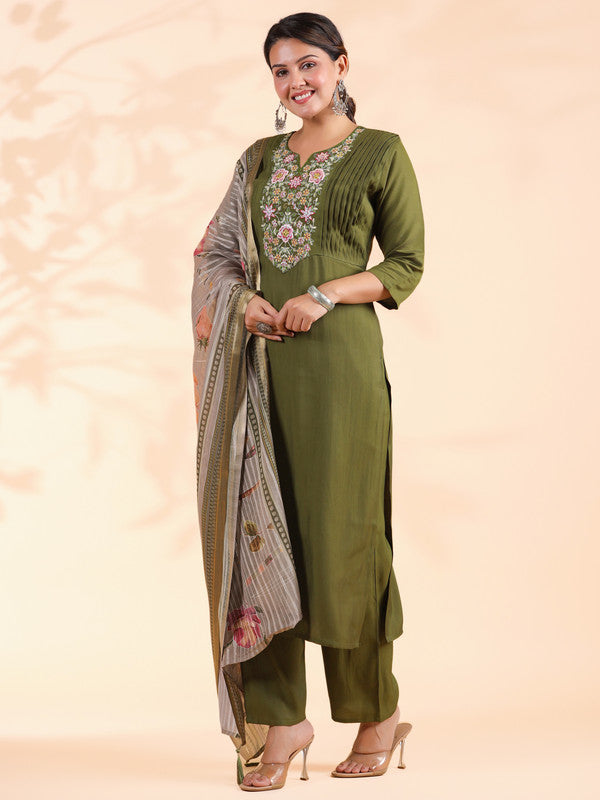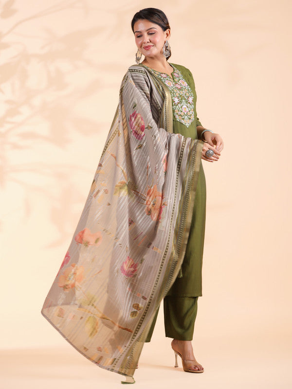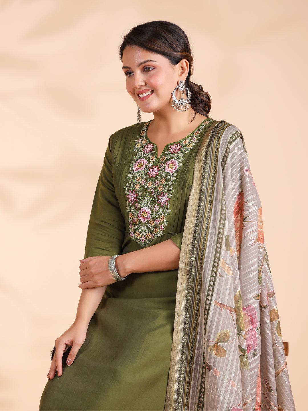 Mahendi Solid With Embroidered Straight Roman Silk Stitched Kurta Set