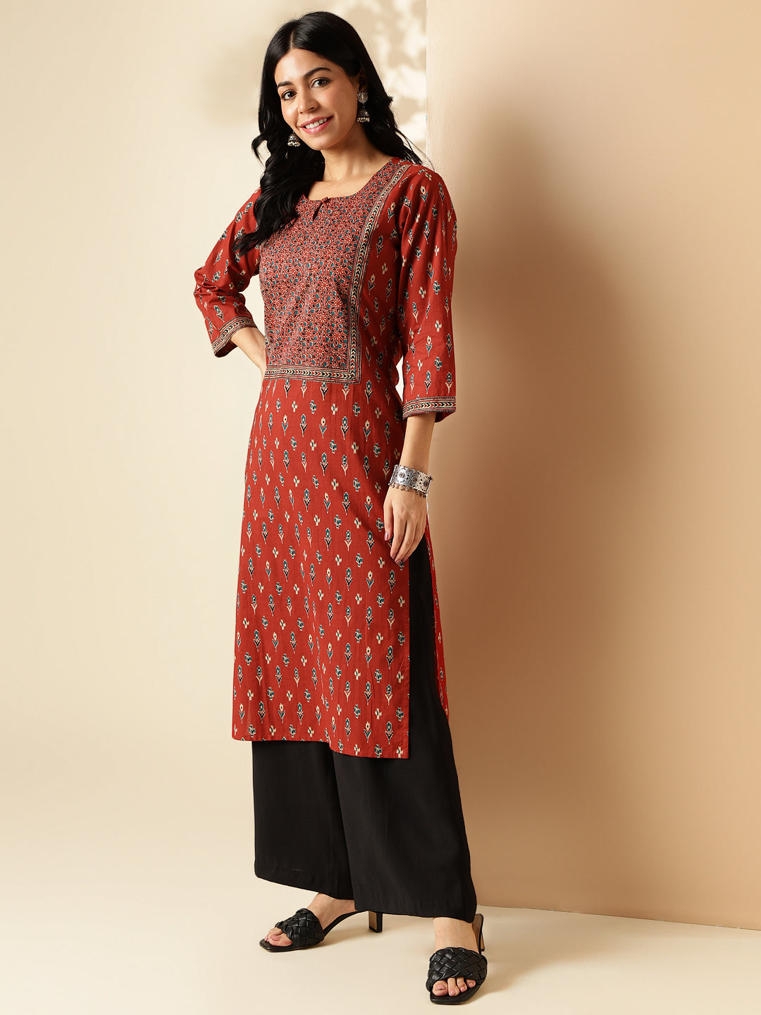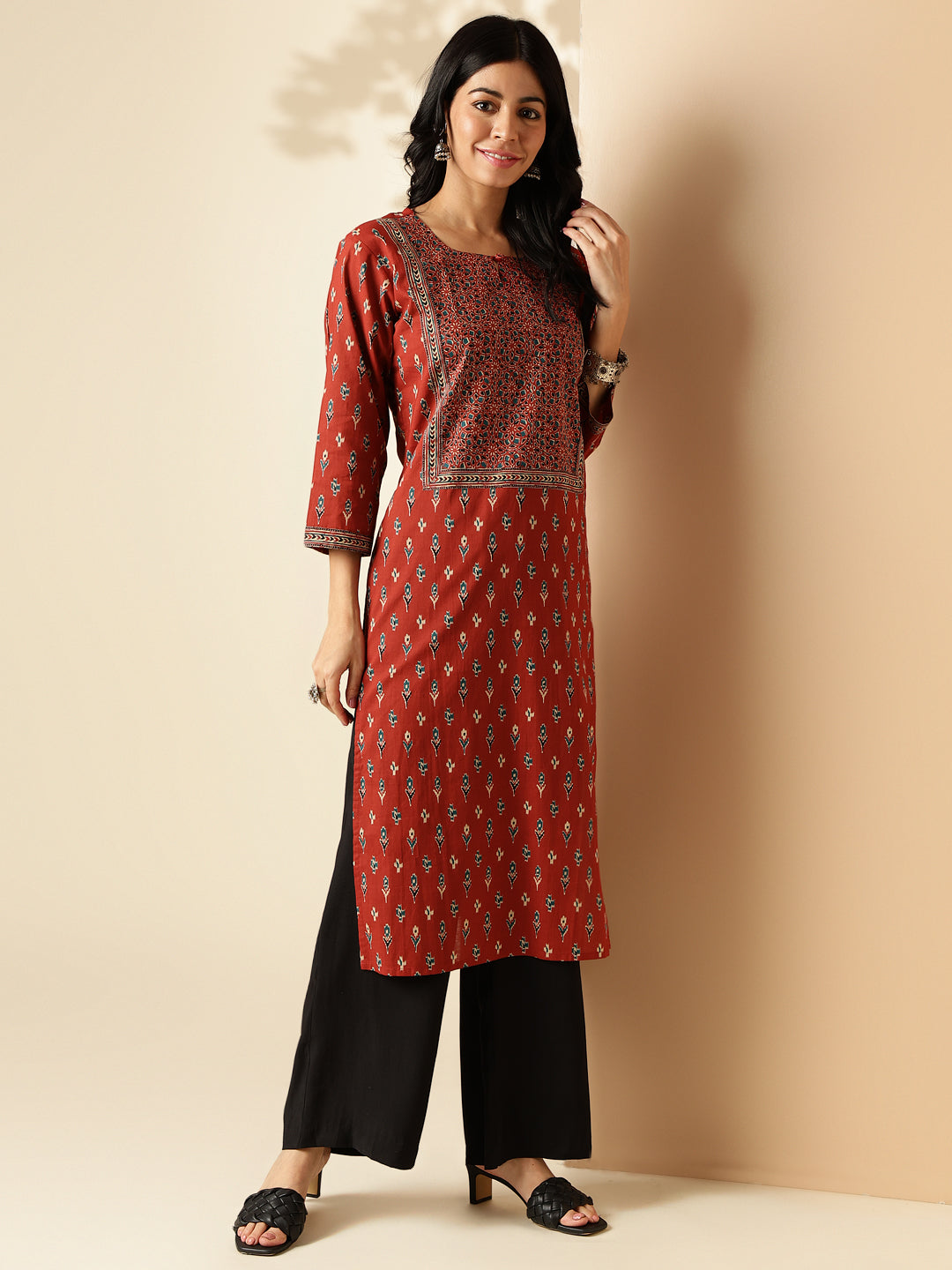 Add a touch of fun to your wardrobe with our Maroon Block Print Straight Cotton Kurta. Made with comfortable and breathable cotton, this kurta features a playful block print that will make a statement wherever you go. Perfect for casual or dressed up occasions, this quirky and unique kurta is a must-have for any fashion-forward individual.